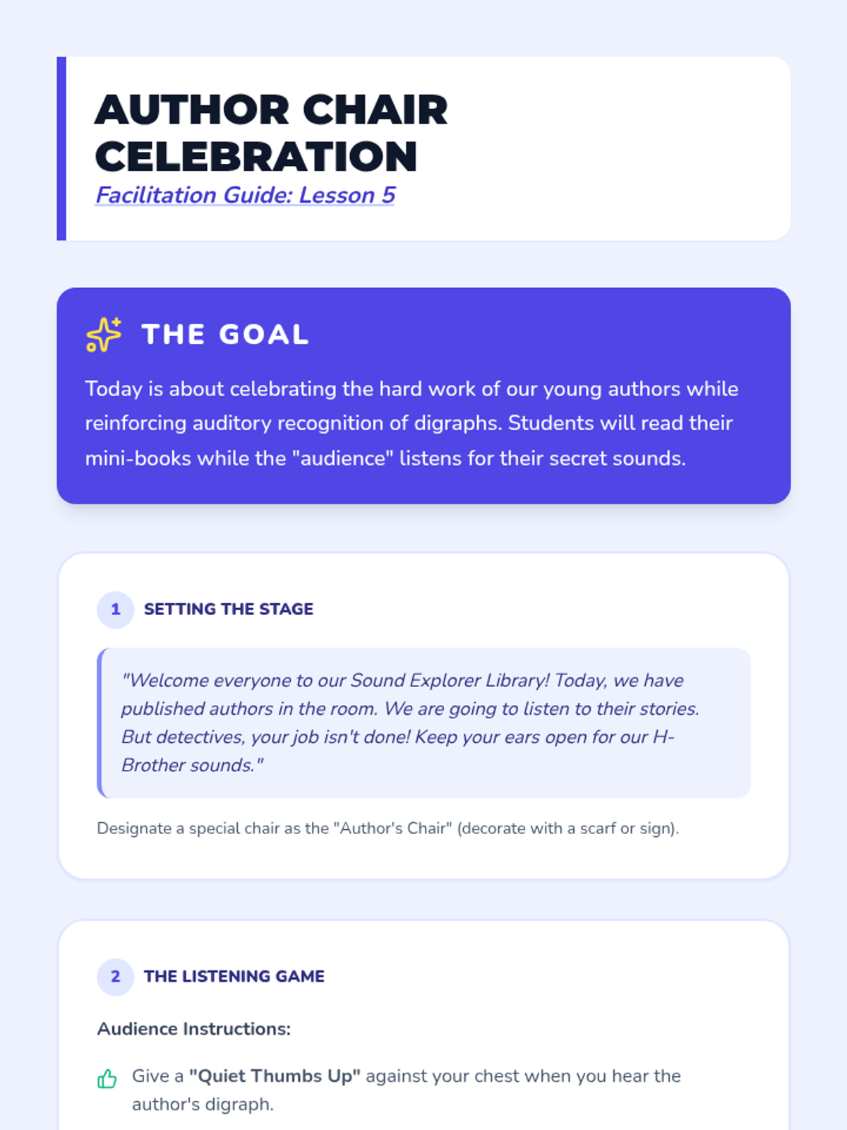 A celebration where students share their mini-books with the class, focusing on active listening for target digraph sounds.