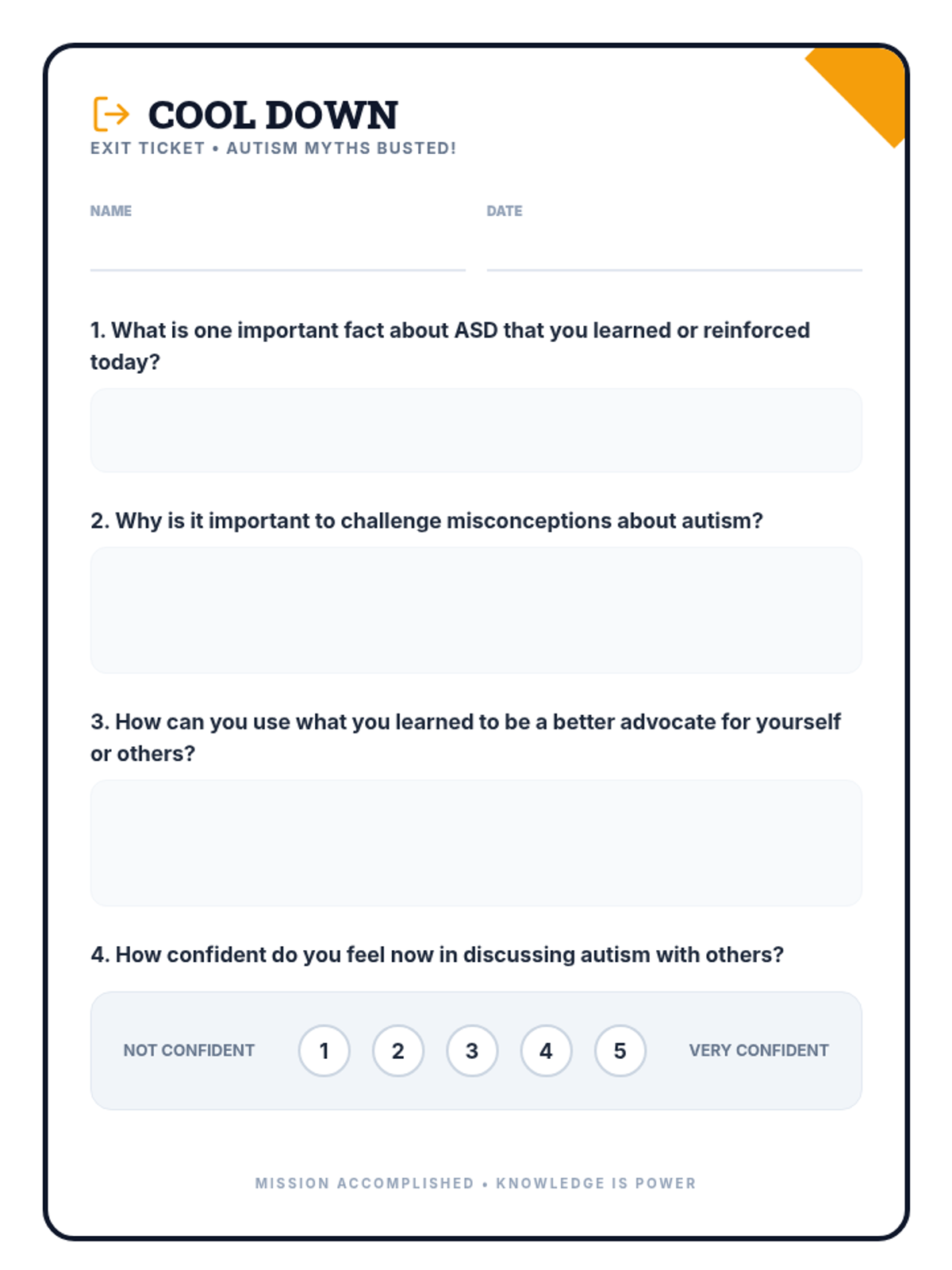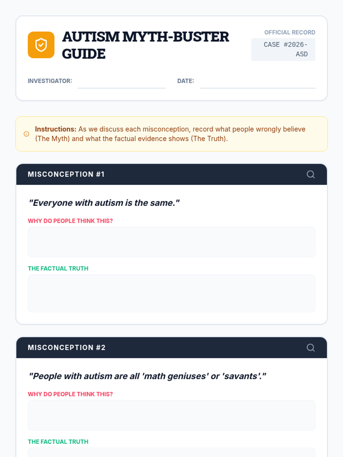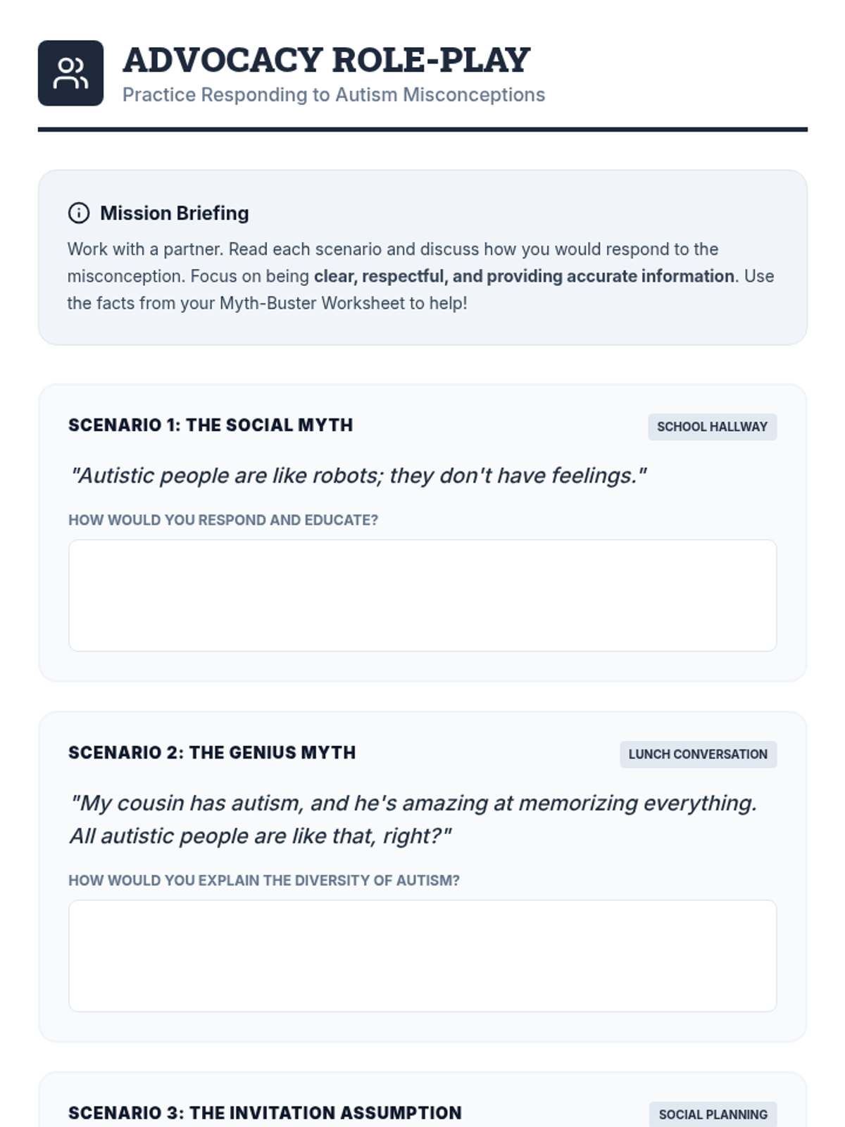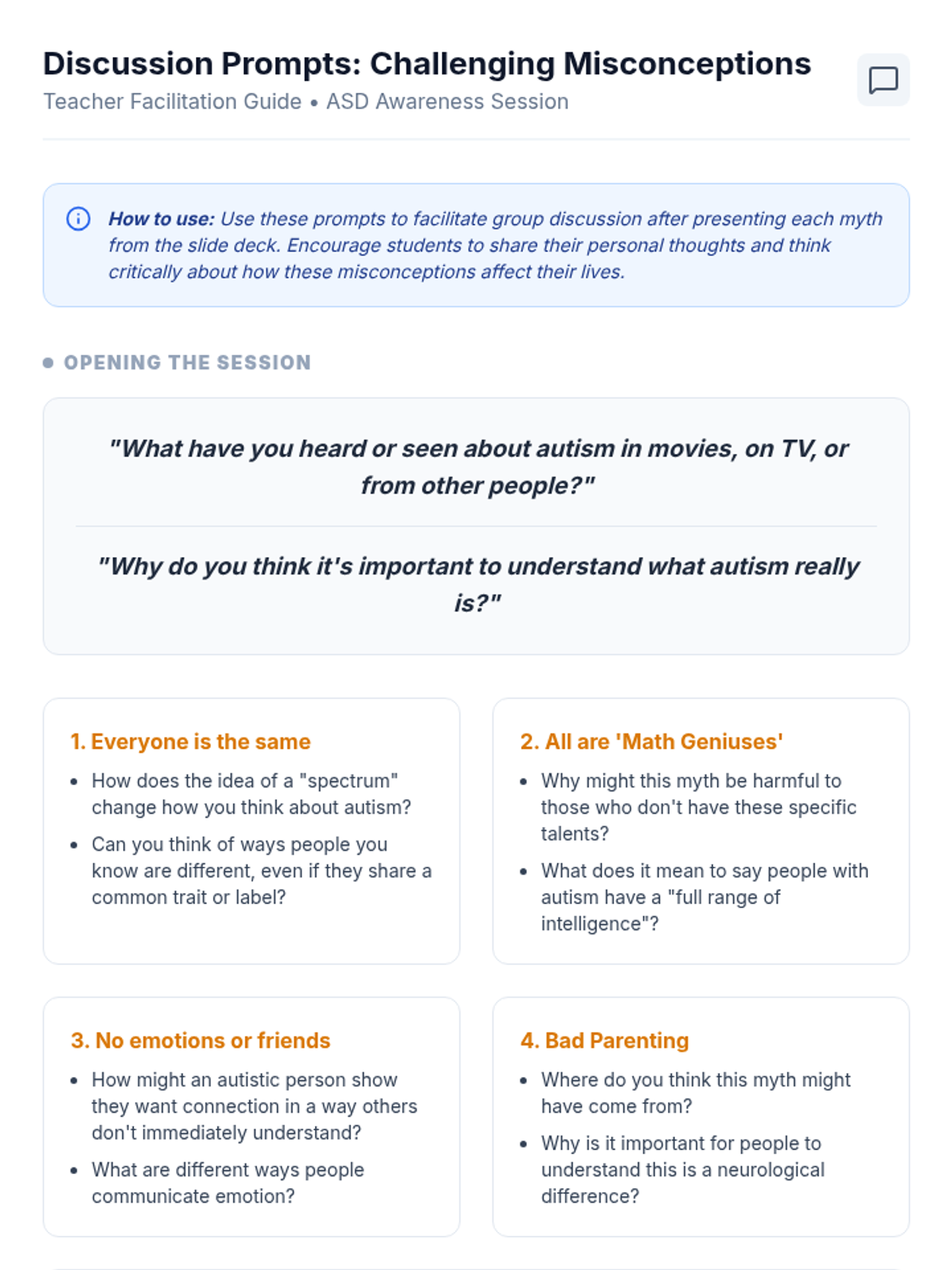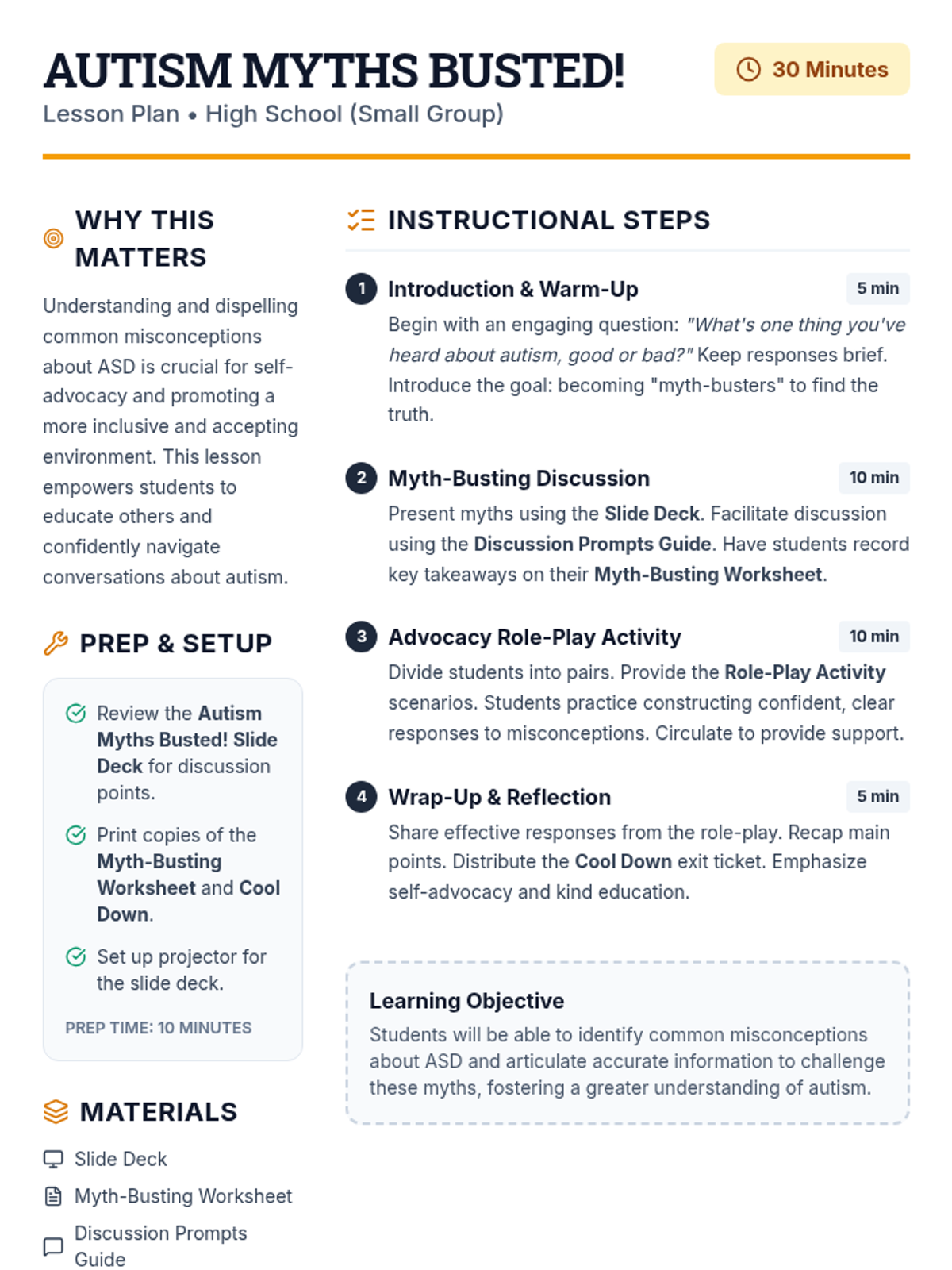 A single-session 30-minute lesson for high school students with high-functioning autism, focusing on identifying and debunking common misconceptions about ASD to promote self-advocacy and inclusion.