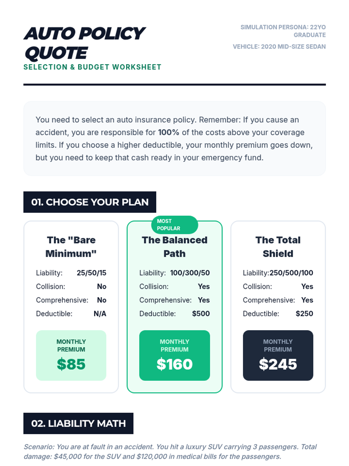Focuses on auto insurance components: liability, collision, and comprehensive. Students compare coverage levels and select a policy for their persona.
