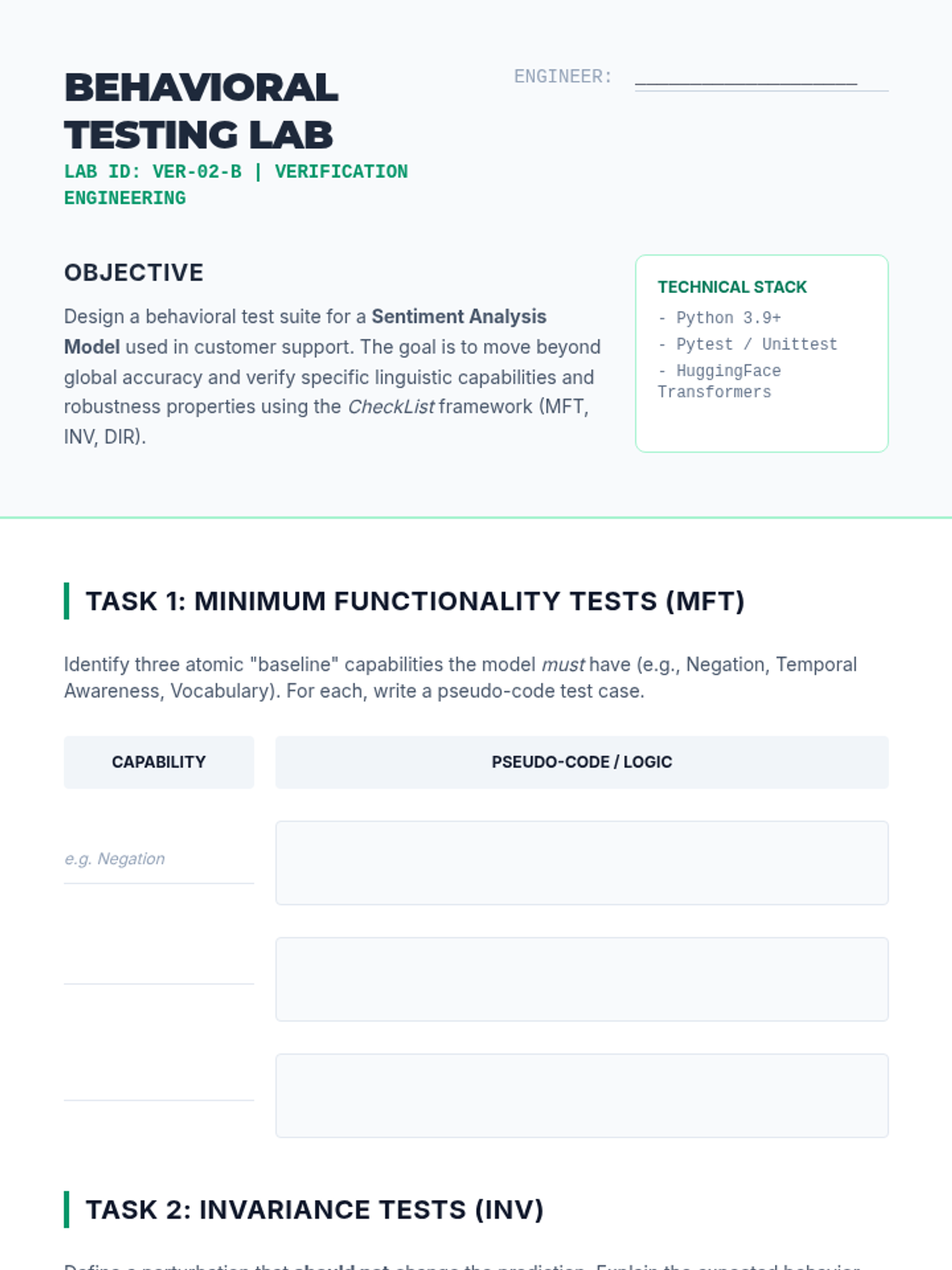 Engineer behavioral test suites (MFT, INV, DIR) and integrate them into automated CI/CD pipelines to ensure model consistency and performance.