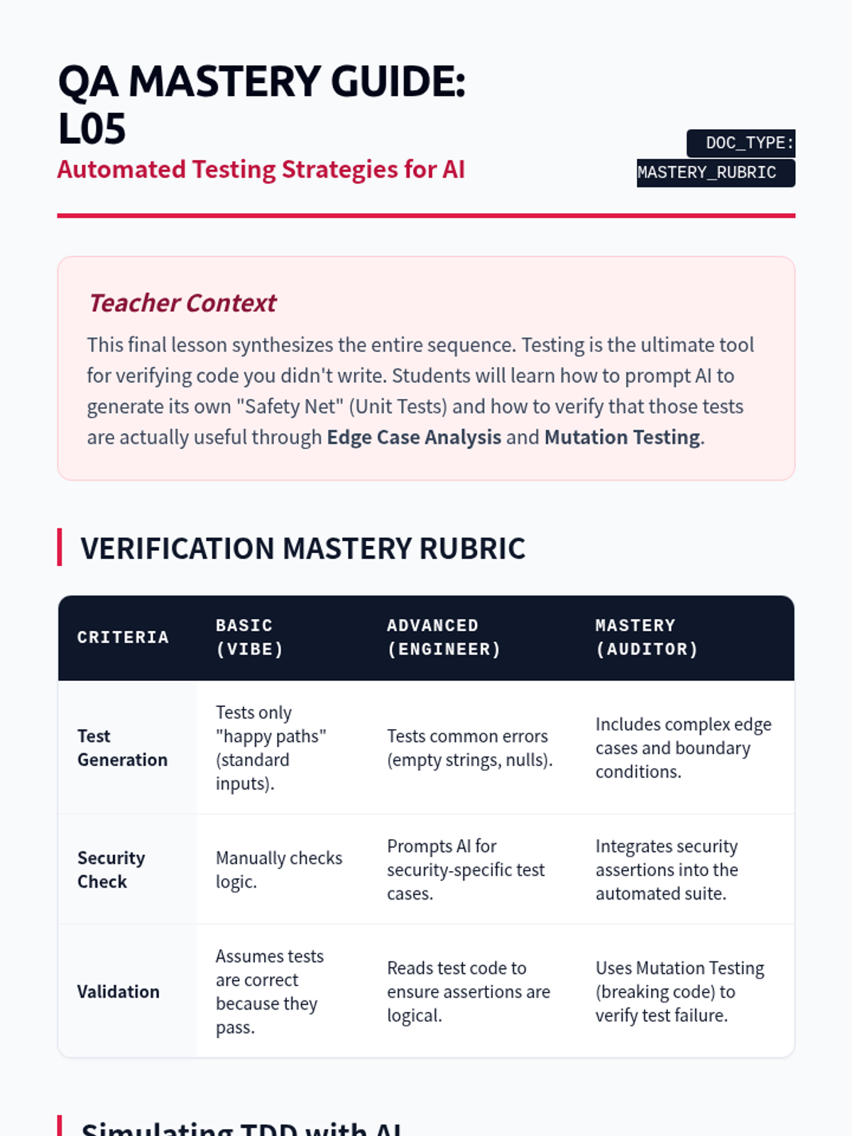 Students leverage AI to build its own safety nets by generating unit tests. They evaluate test quality and implement test-driven development (TDD) workflows for AI-assisted projects.