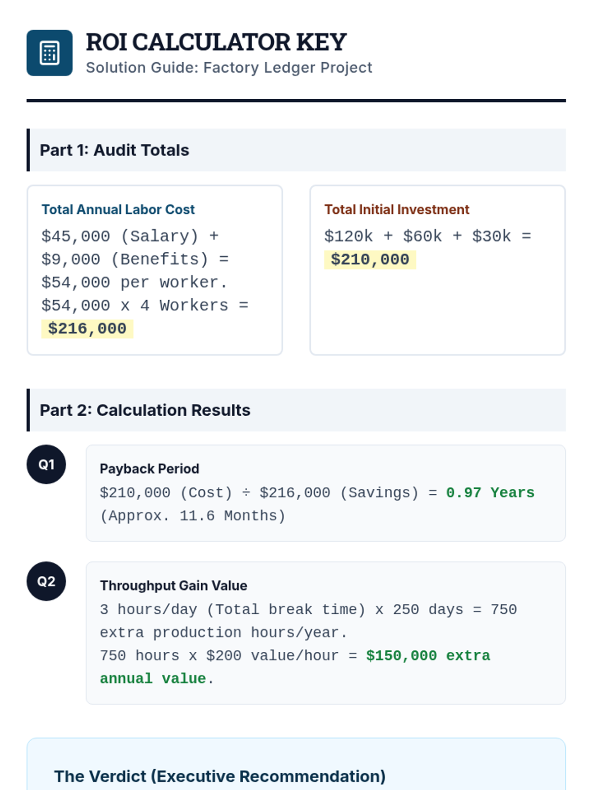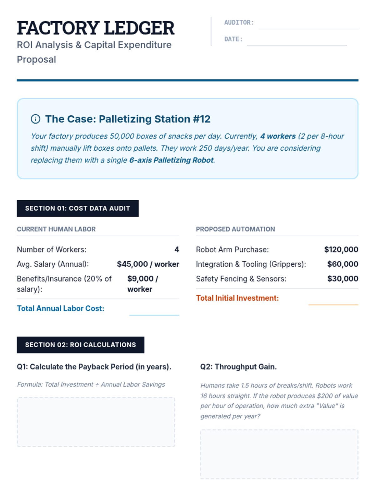 Students perform cost-benefit analyses and calculate Return on Investment (ROI) to determine the economic viability of automating production lines.