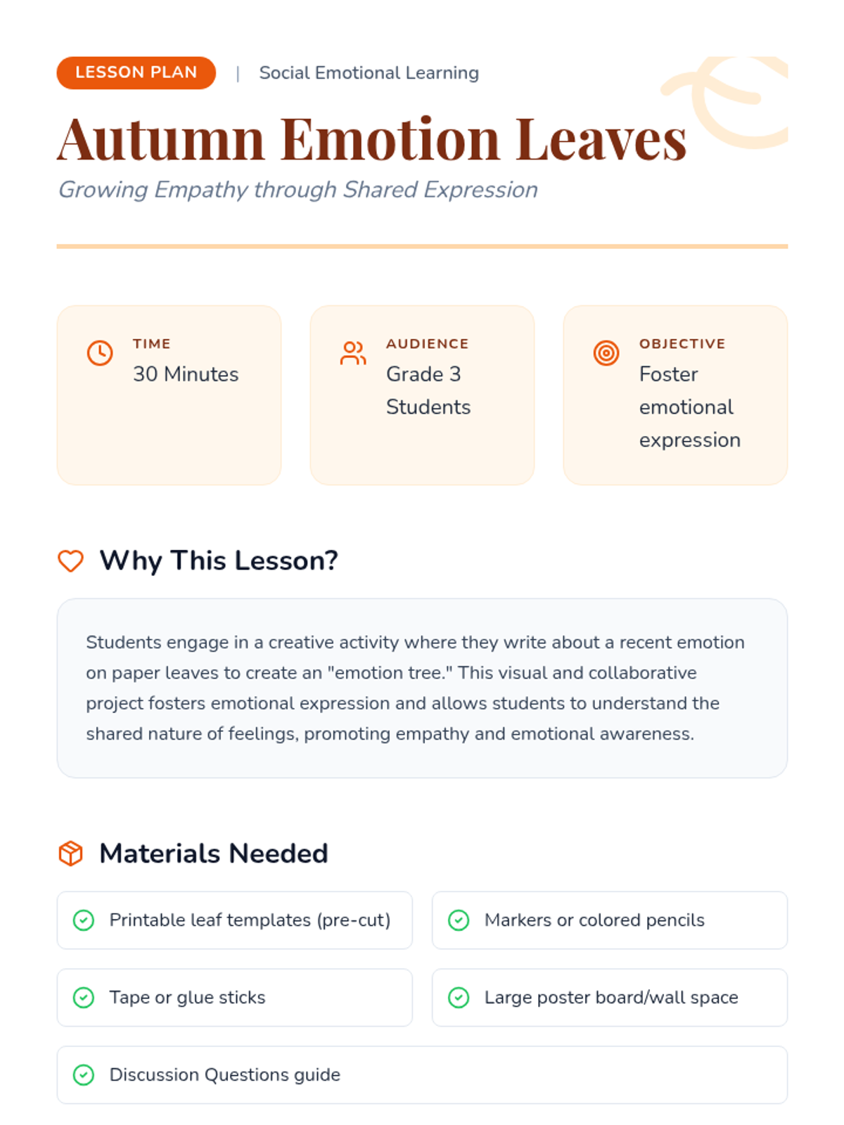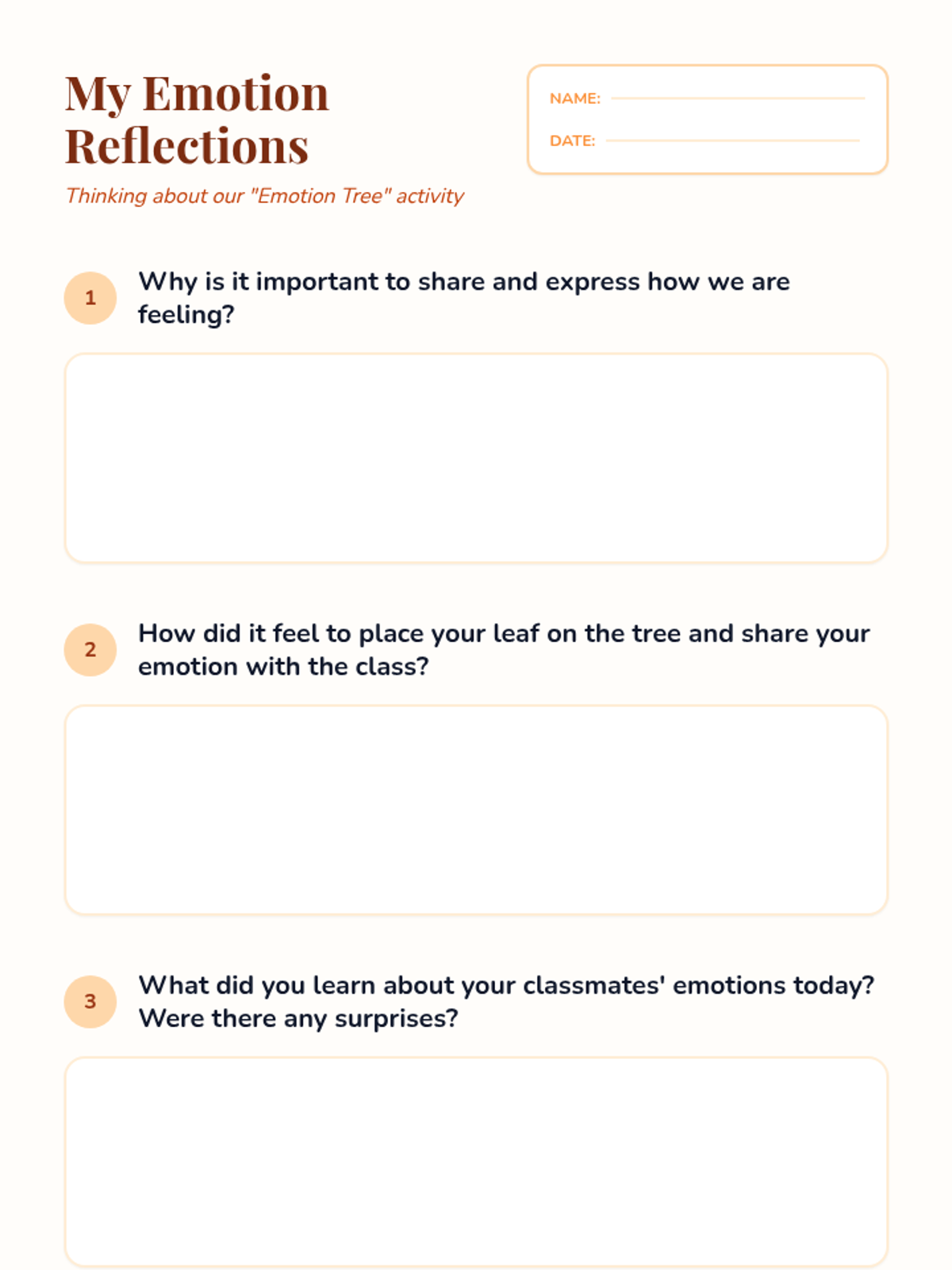 A creative SEL lesson where students write about recent emotions on paper leaves to build a collective 'emotion tree,' fostering empathy and emotional awareness.
