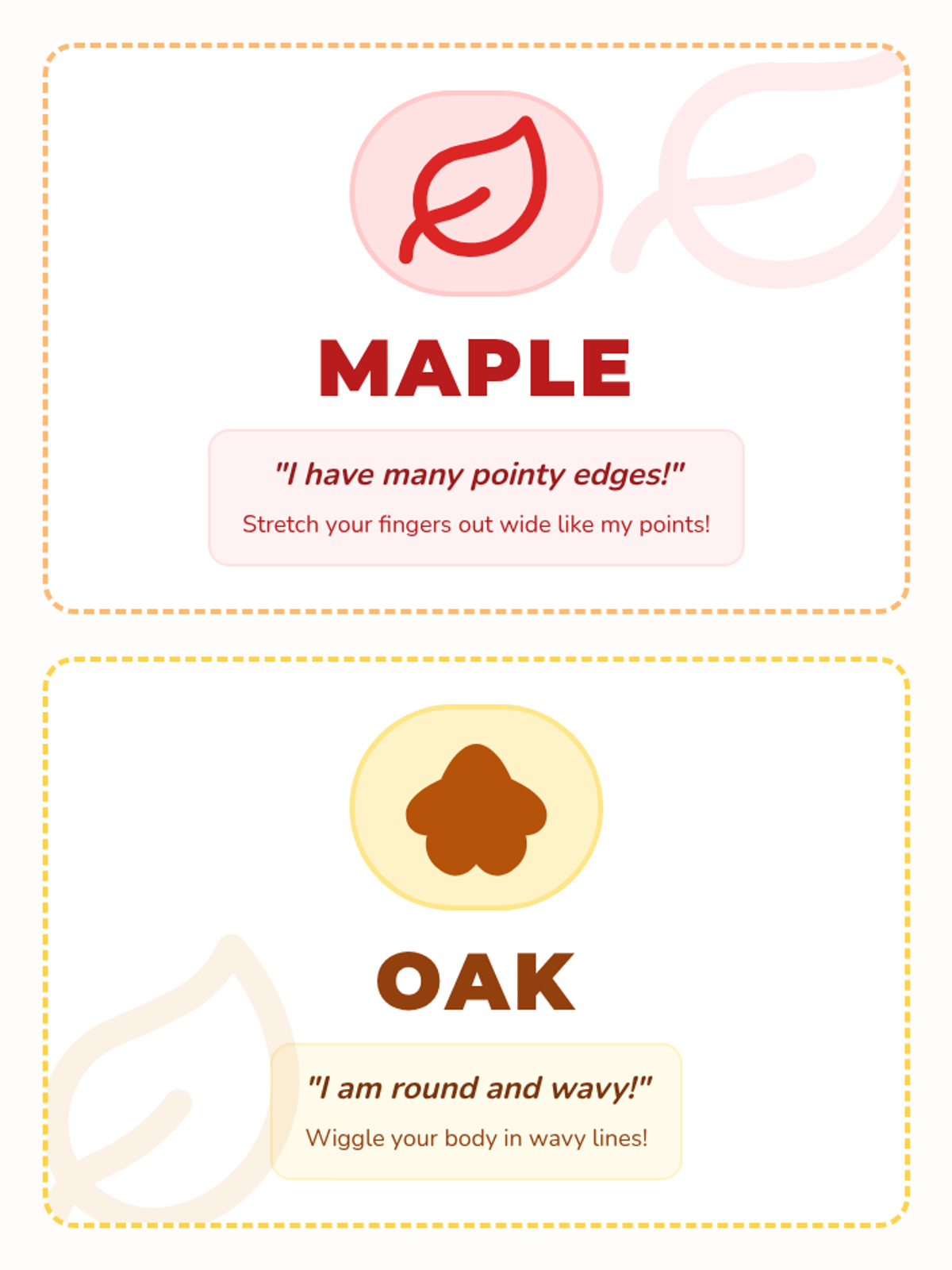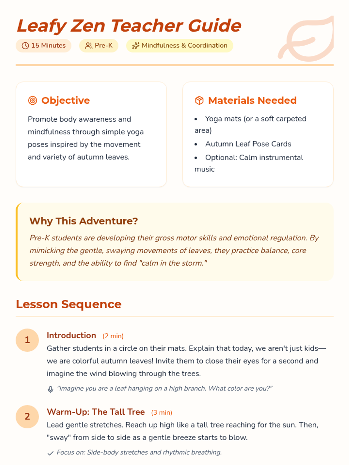 A mindful movement lesson for Pre-K students using autumn leaves as inspiration for yoga poses and breathing exercises to develop body awareness and coordination.