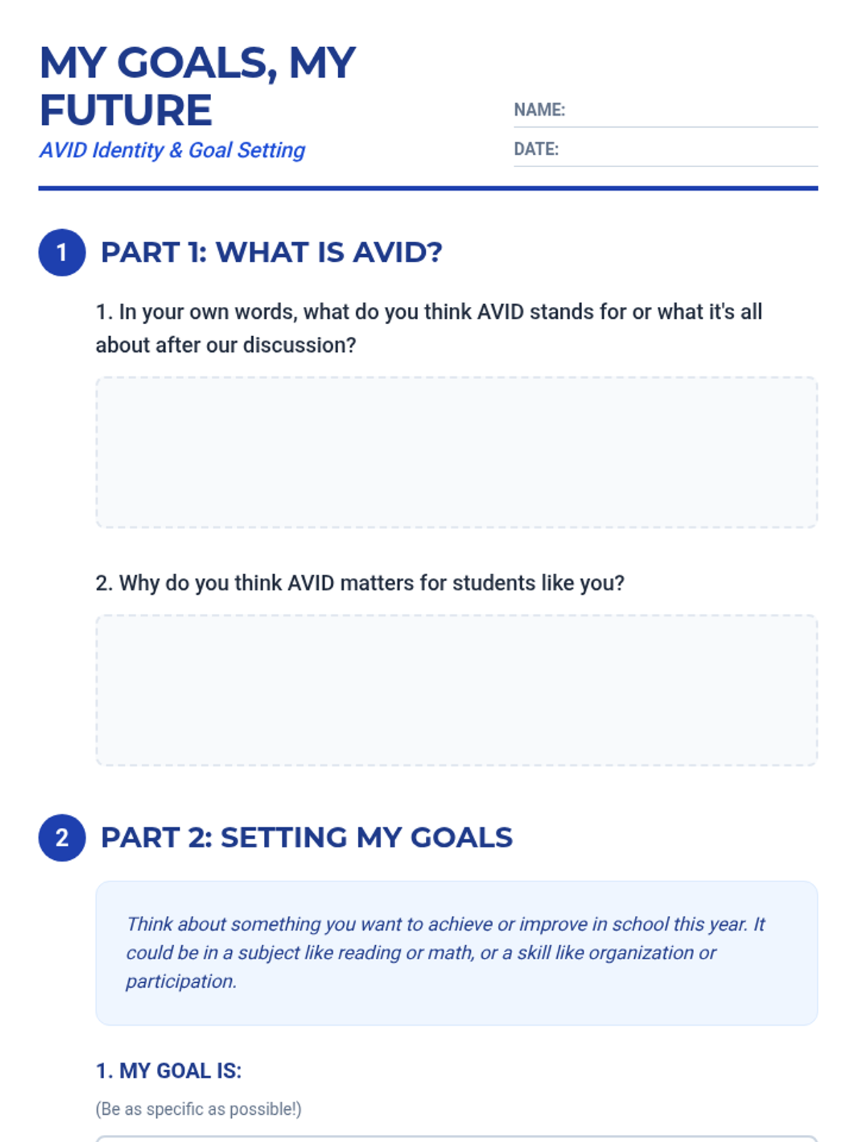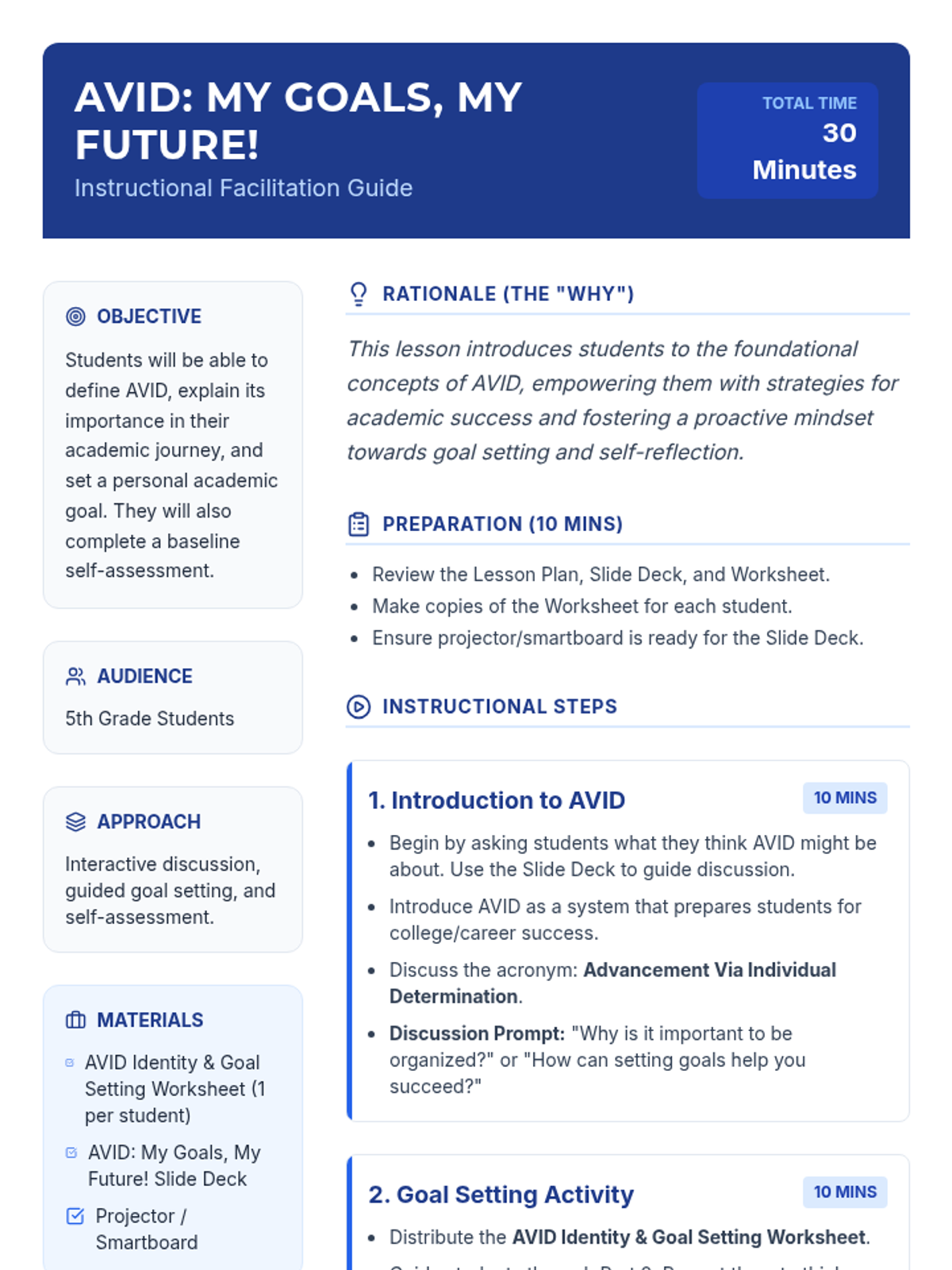 This 30-minute lesson introduces 5th-grade students to AVID principles, focusing on the meaning of AVID and personal goal setting through self-assessment and reflection.