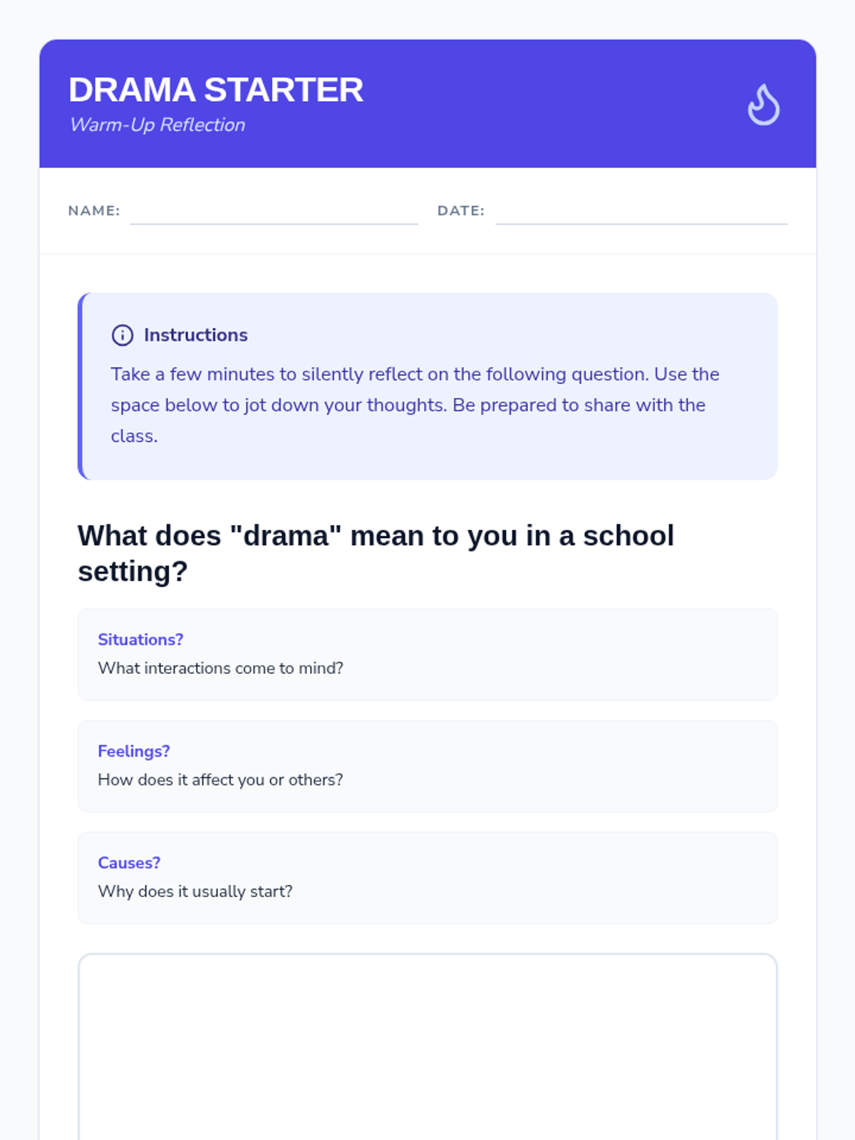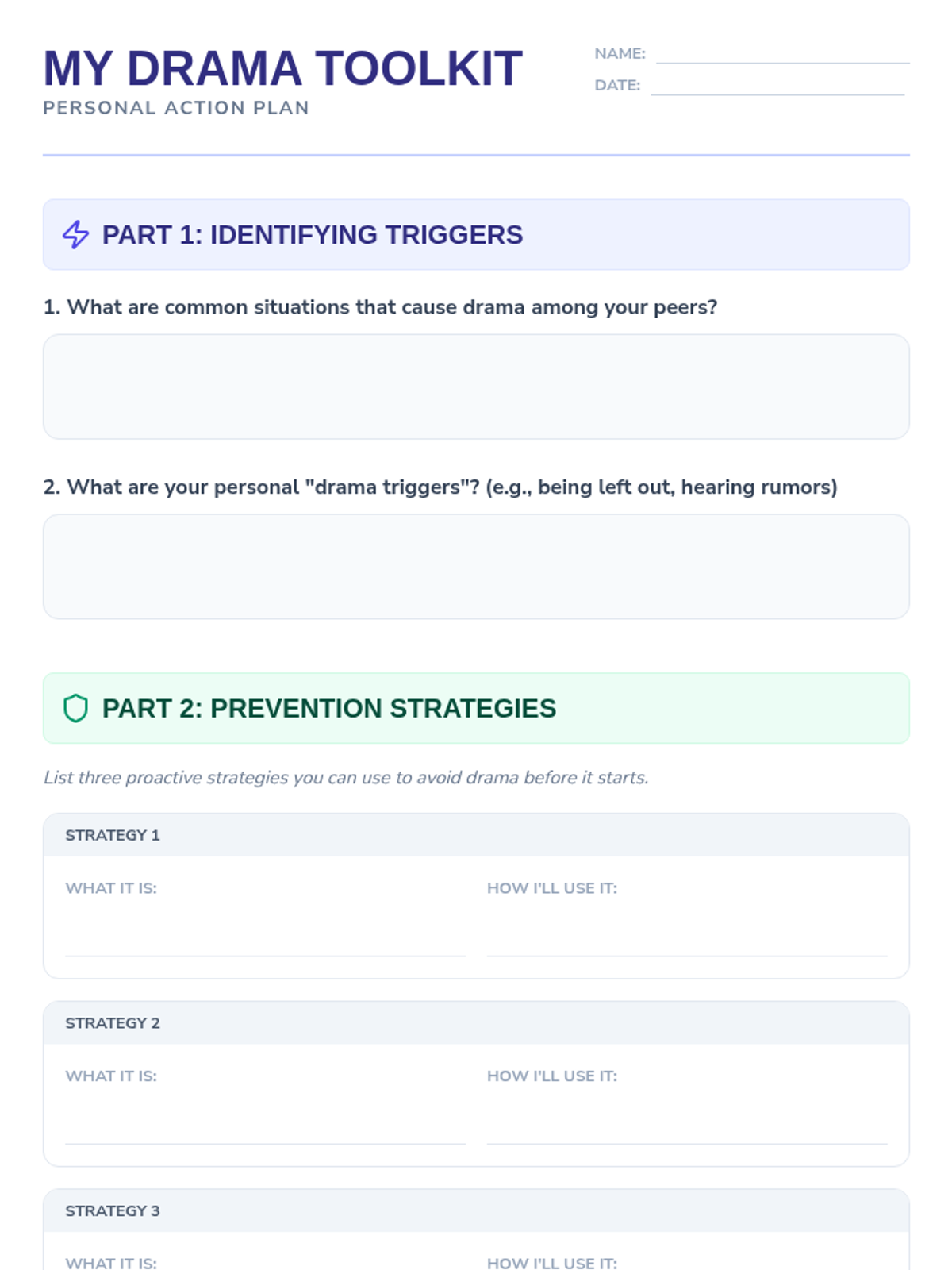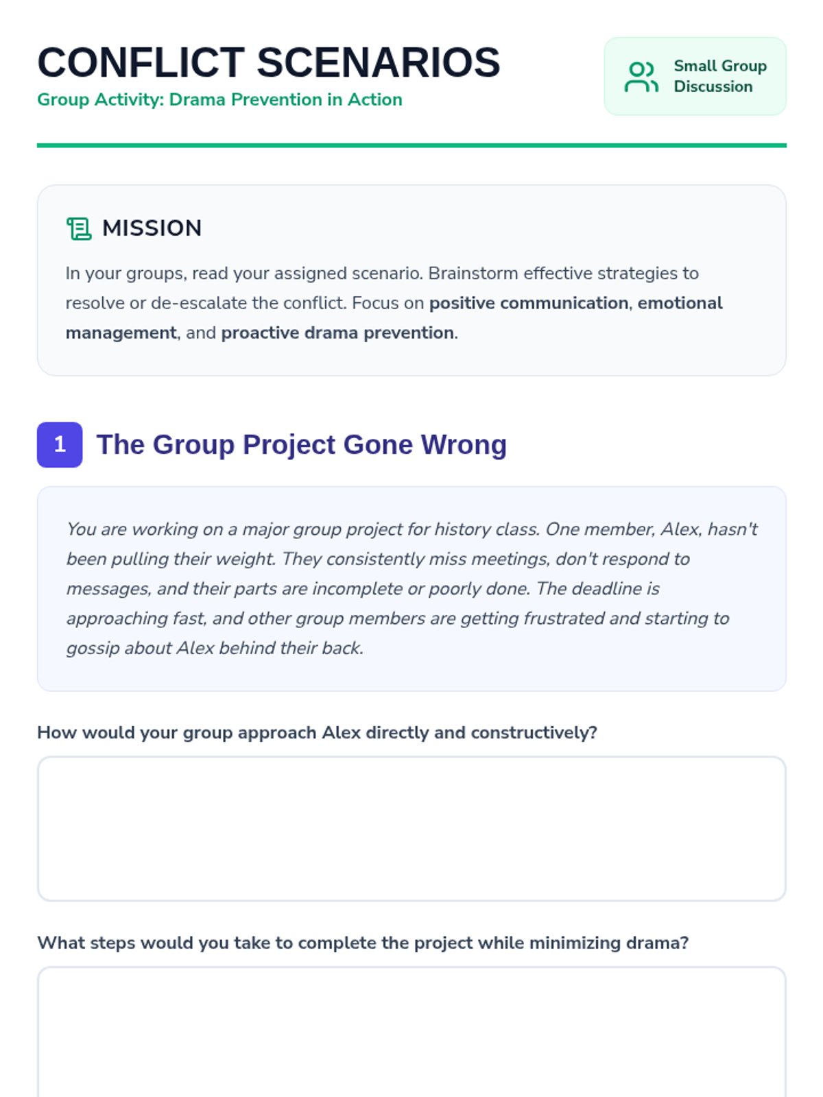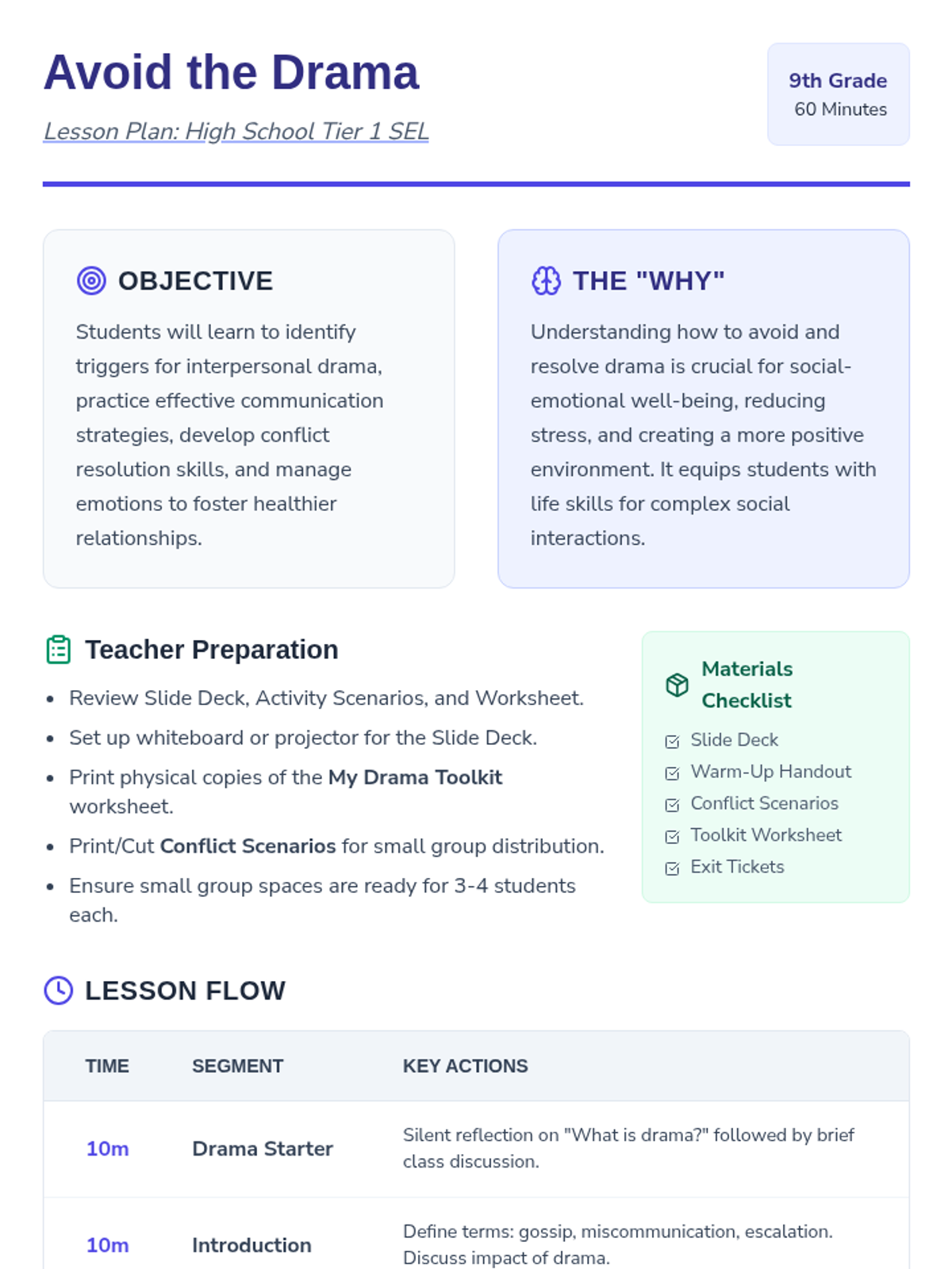 This lesson helps 9th-grade students develop essential skills in conflict resolution and drama prevention to foster a more positive and productive environment. Students will learn to identify triggers, practice effective communication, and manage emotions.