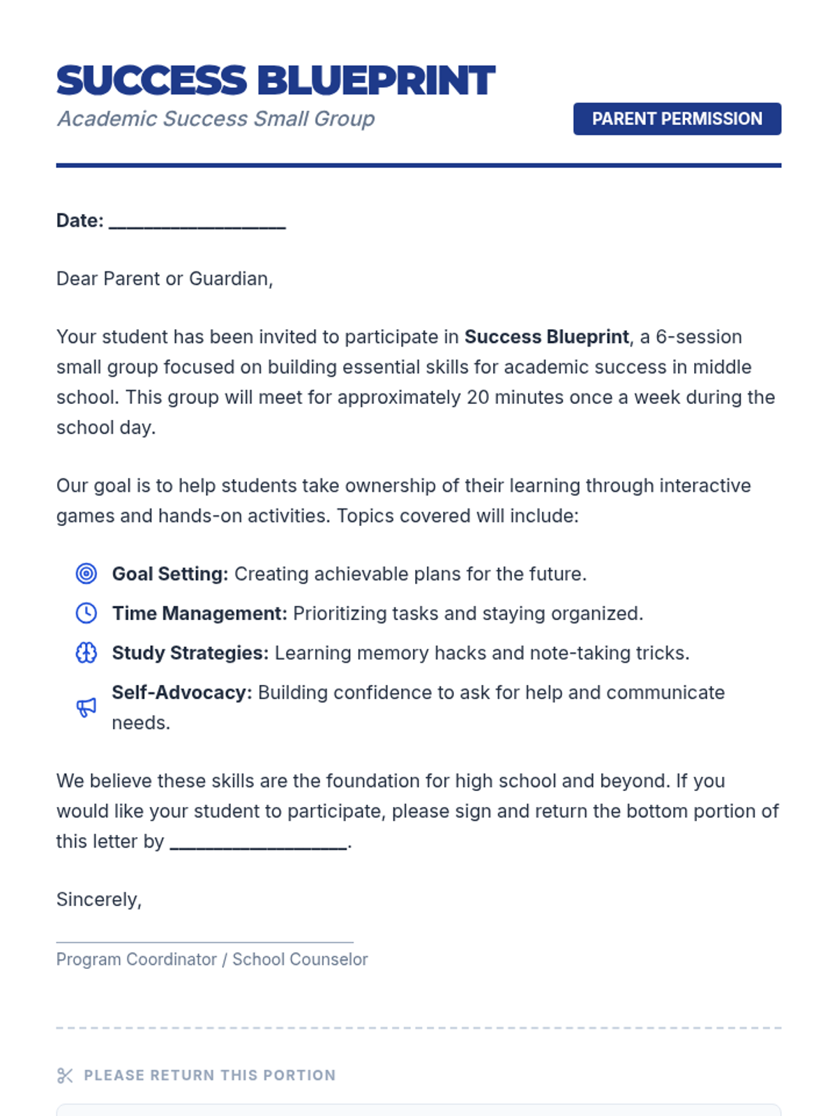 Introductory administrative materials for the small group, including permission forms for parents and guardians.