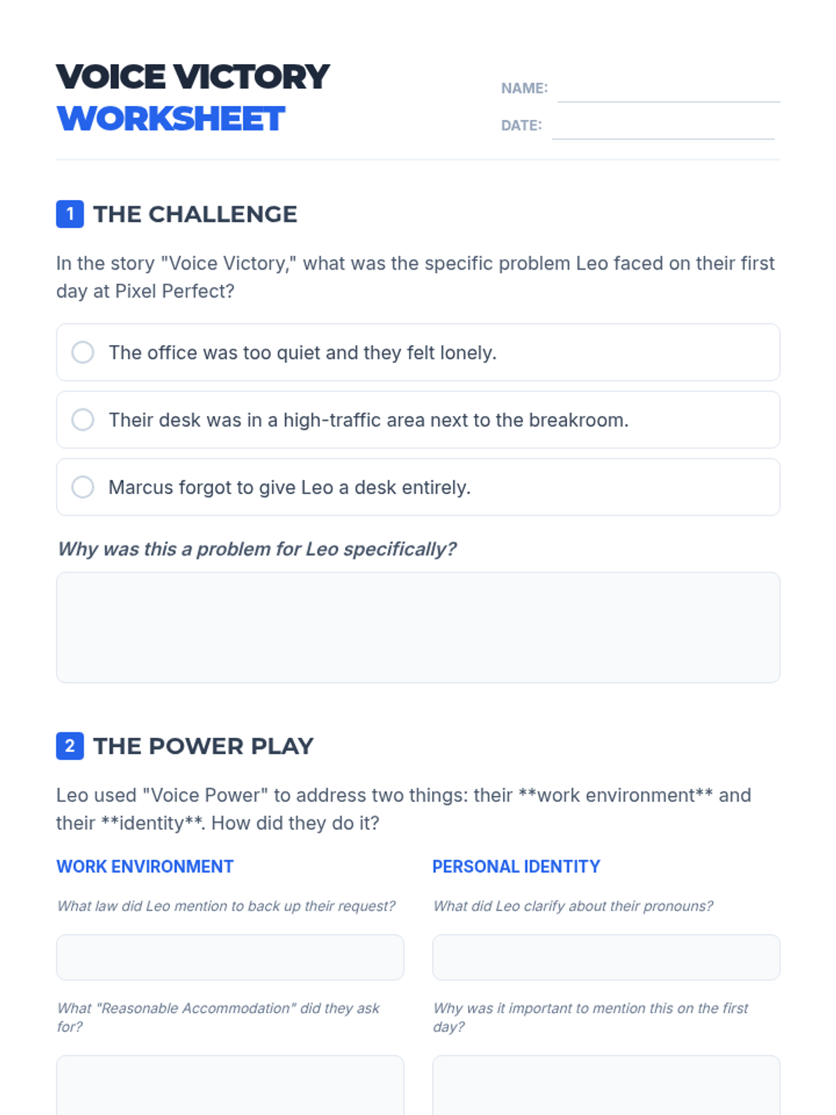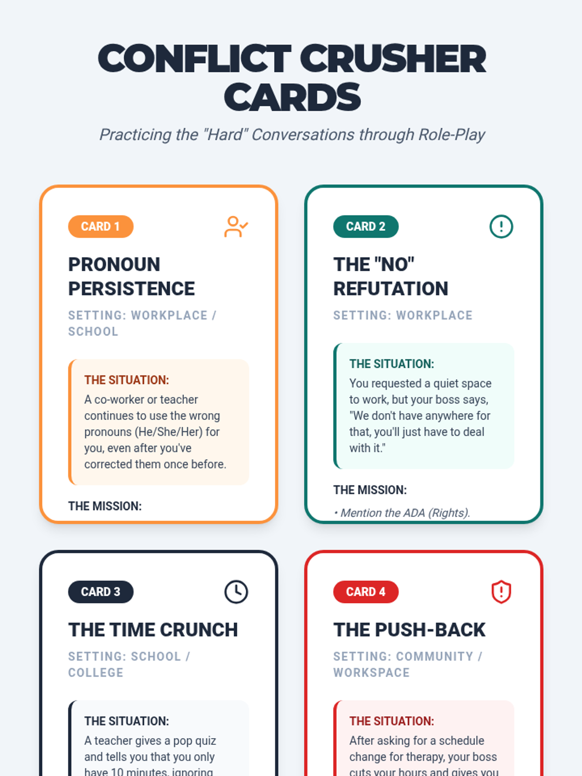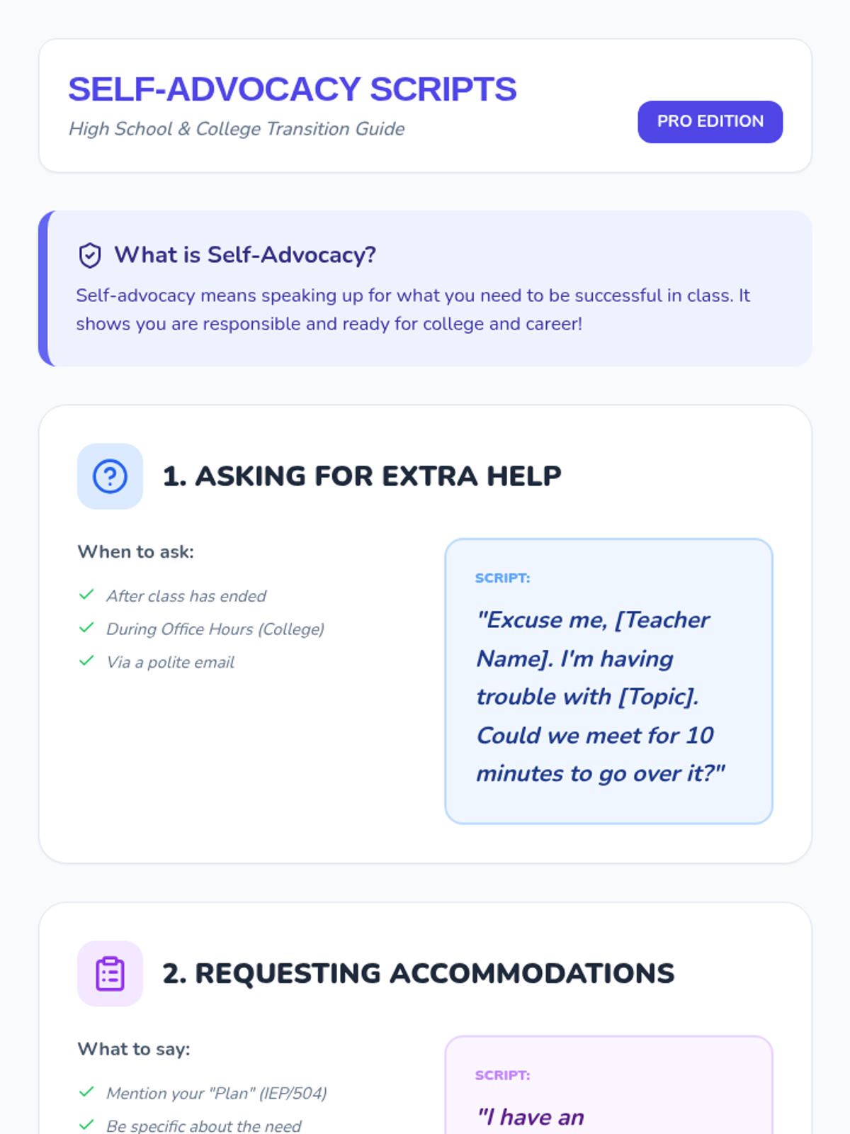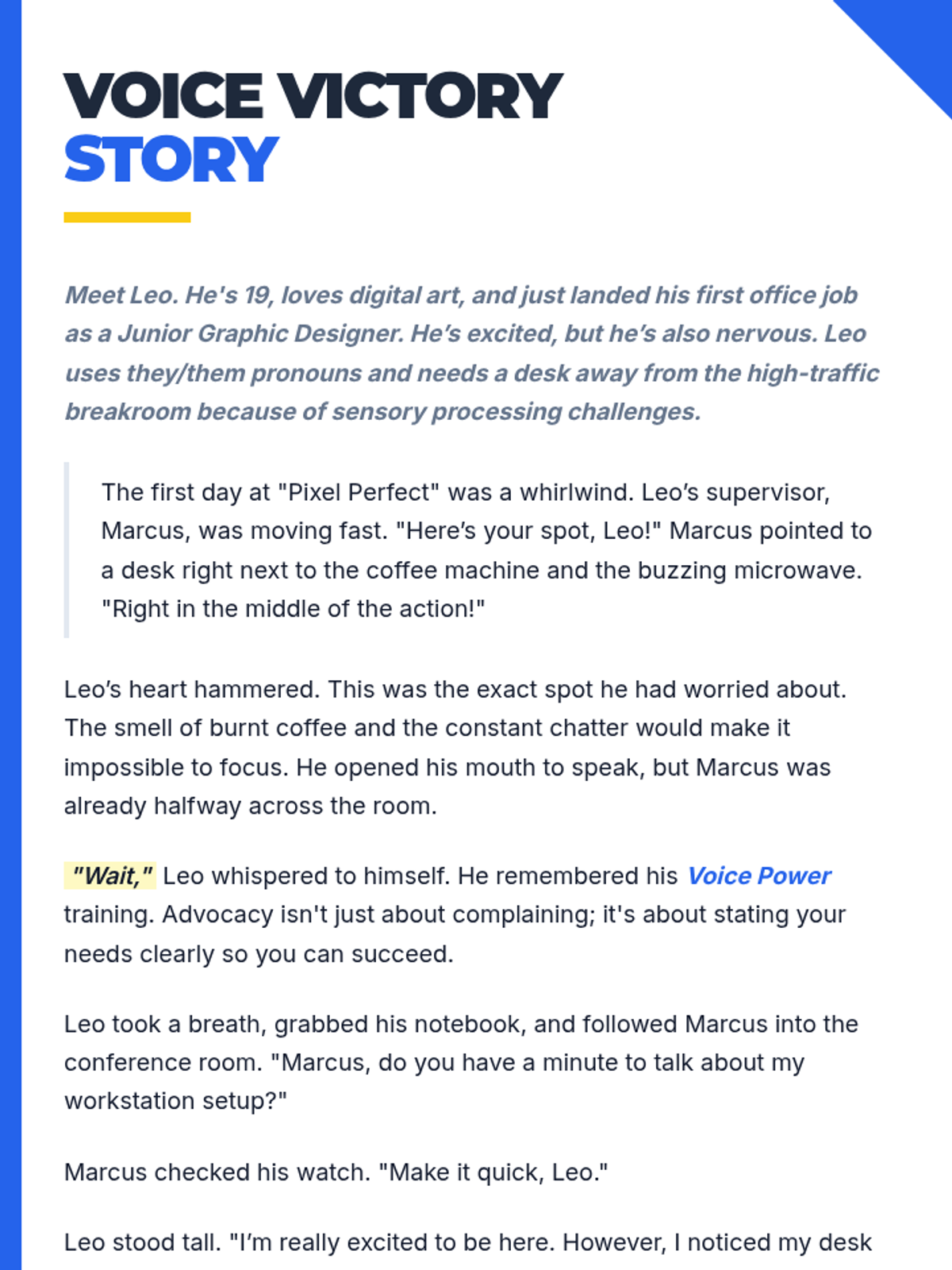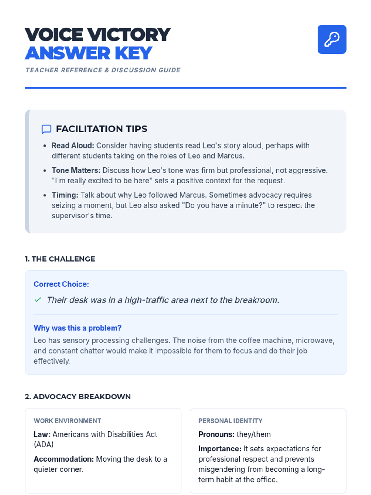 A comprehensive self-advocacy curriculum designed for young adults to navigate school, home, community, and the workplace with confidence. Focuses on personal identity (pronouns), legal rights (ADA/IDEA), and practical communication strategies.