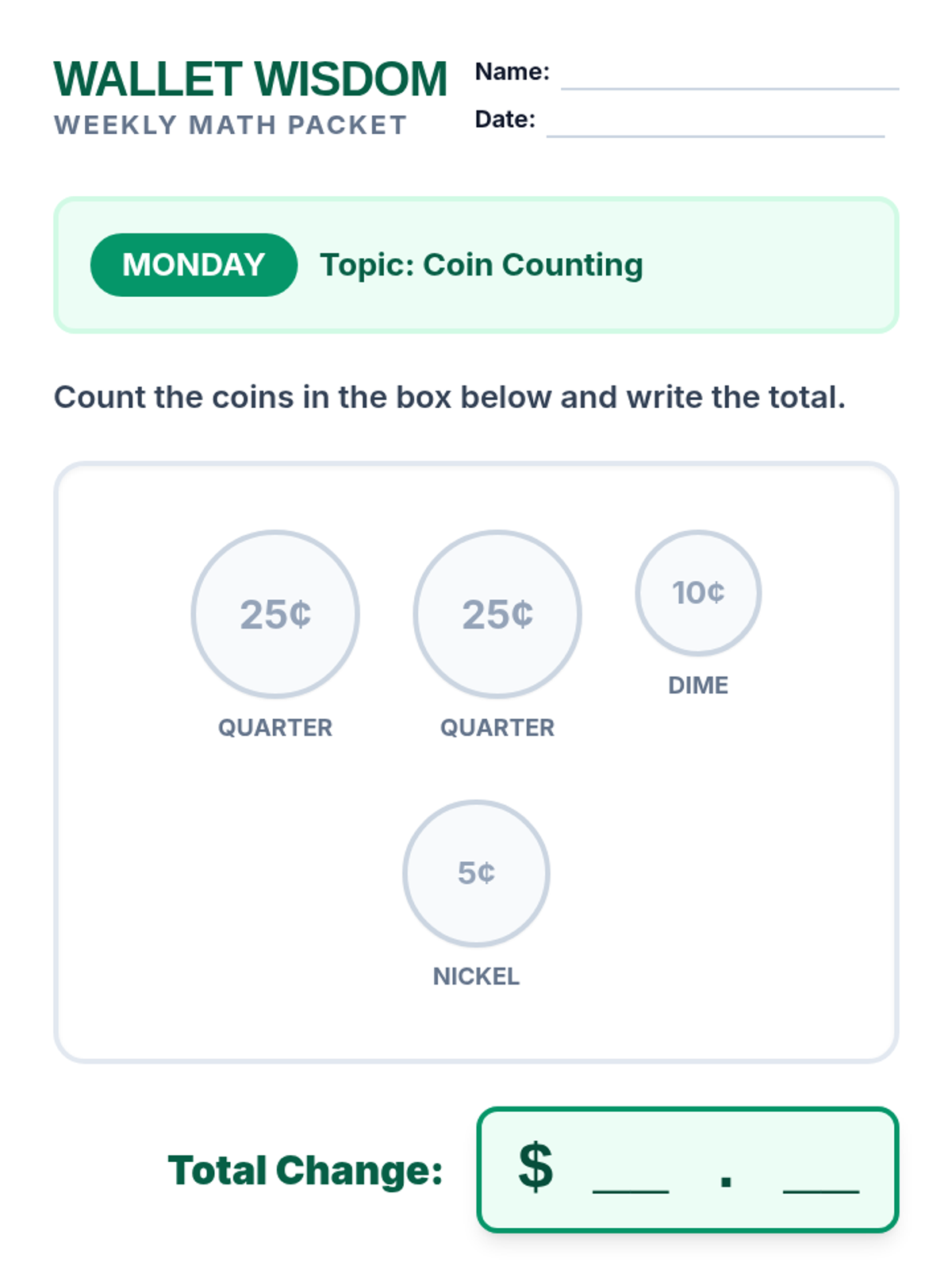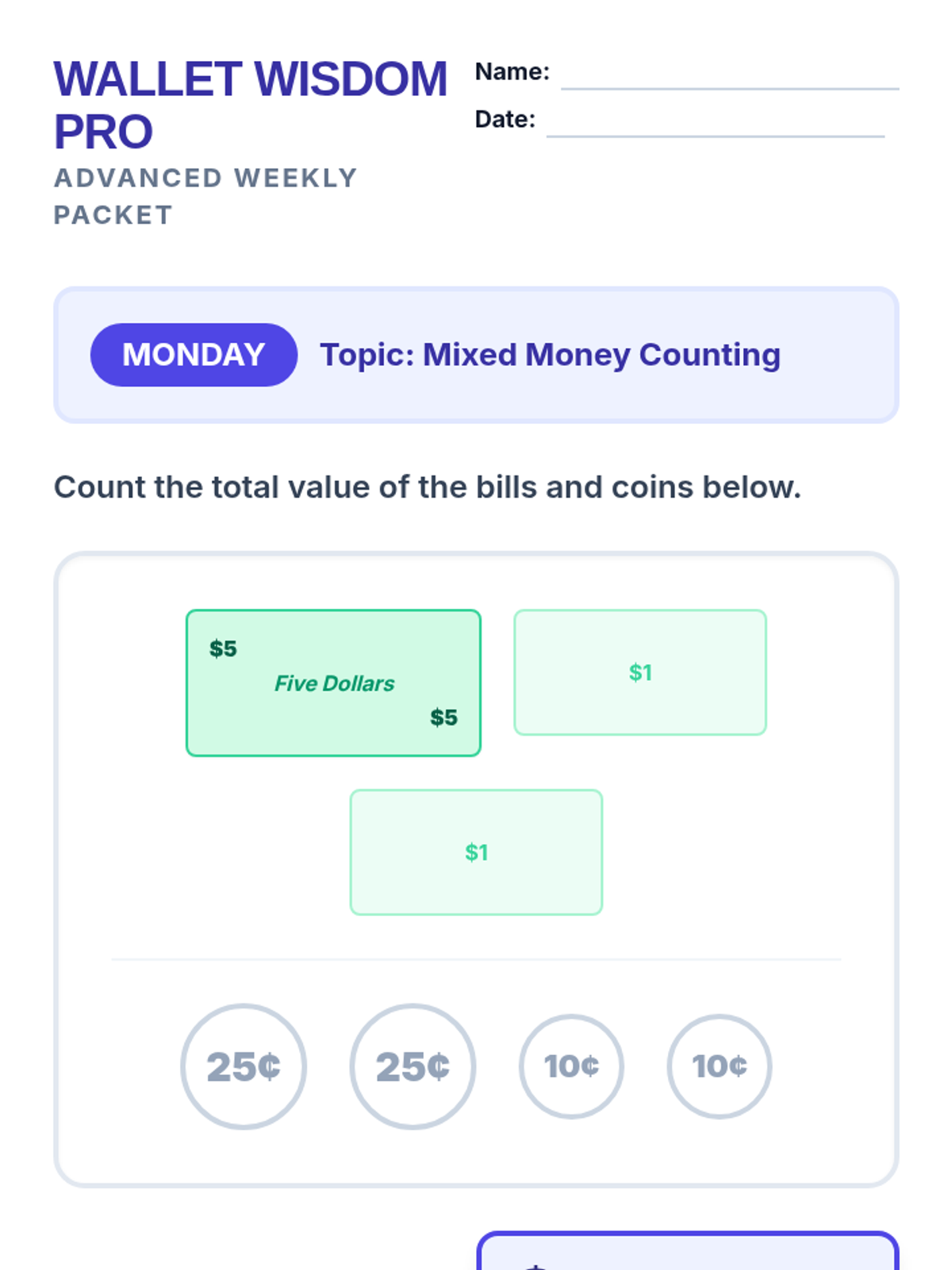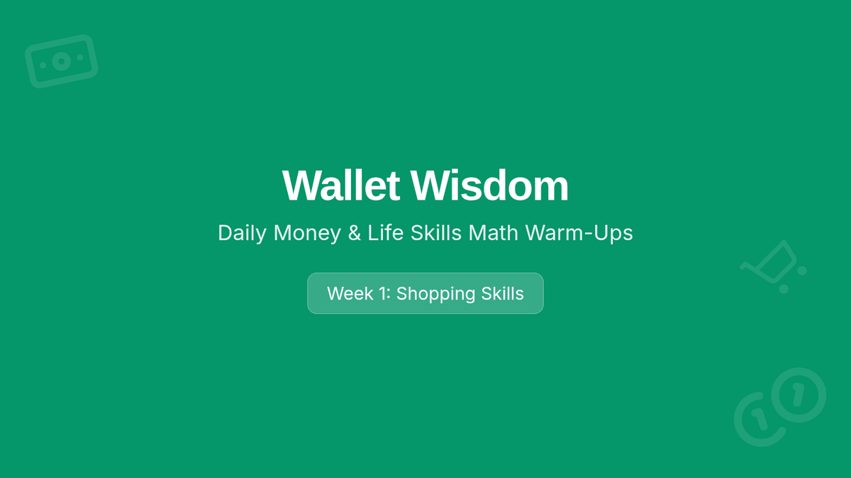 A week of functional math warm-ups focused on money management, coin identification, and "next dollar up" strategies designed for special education students.