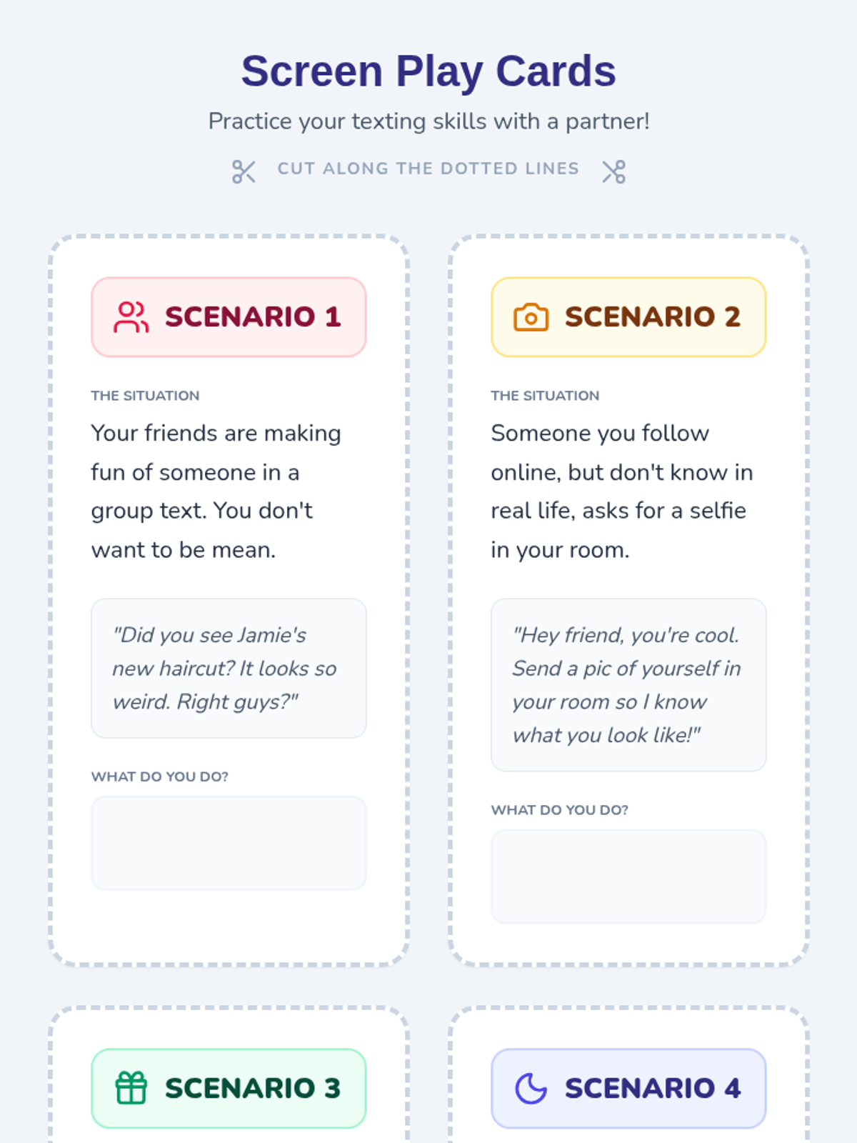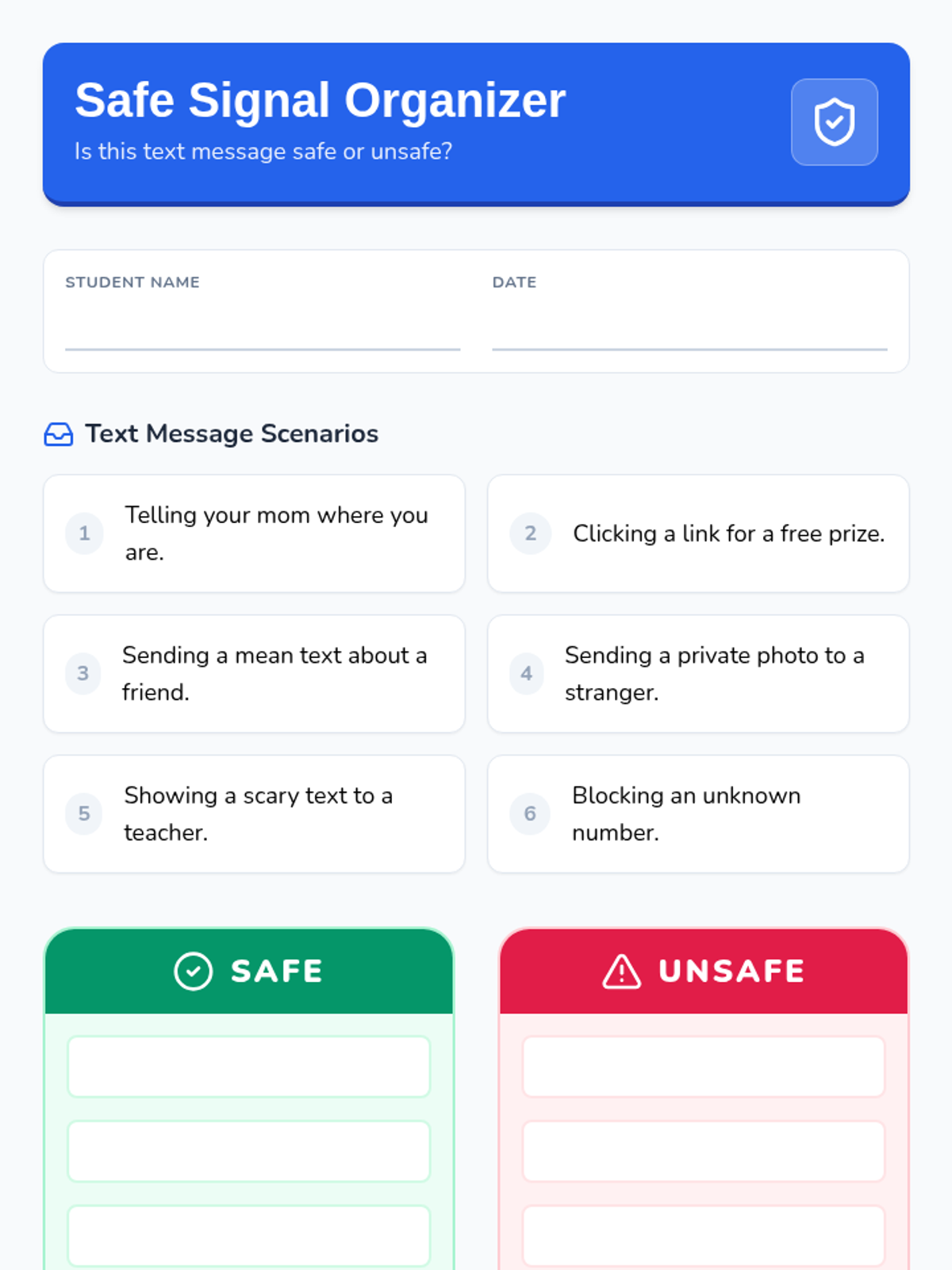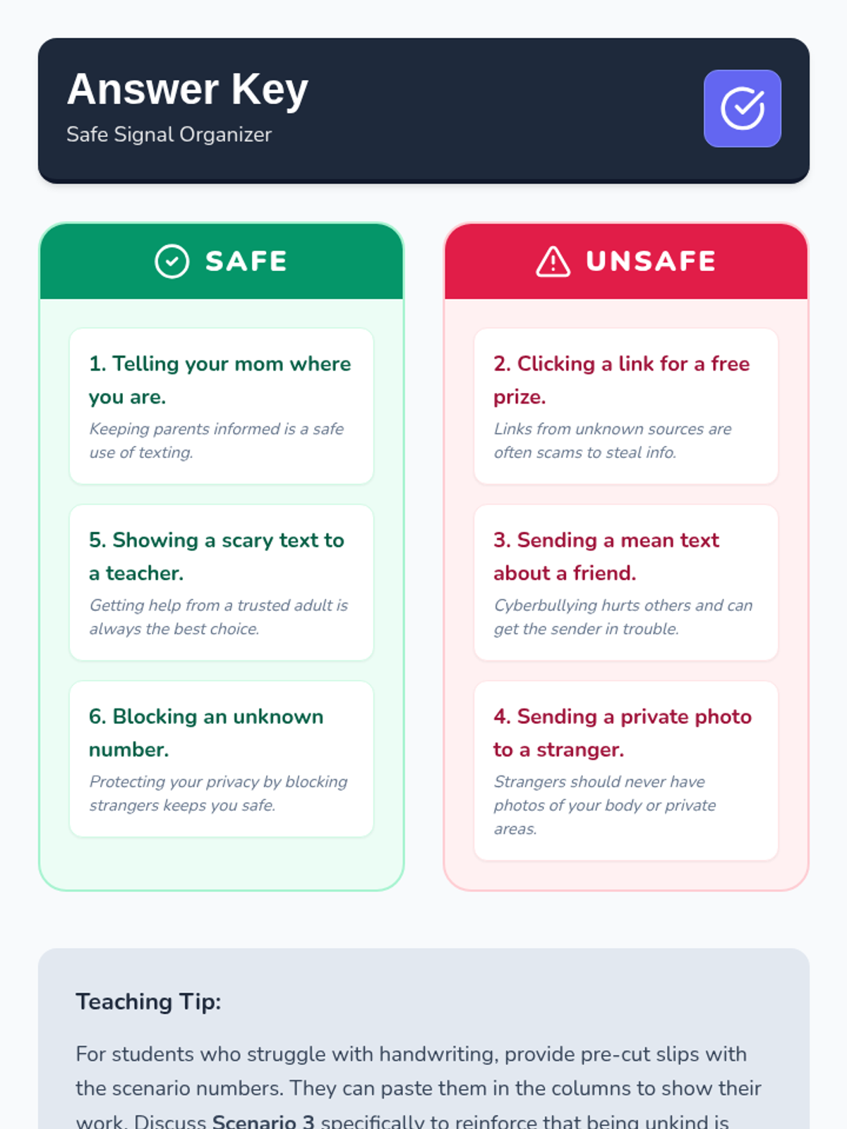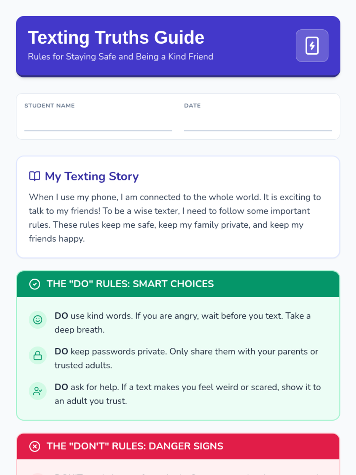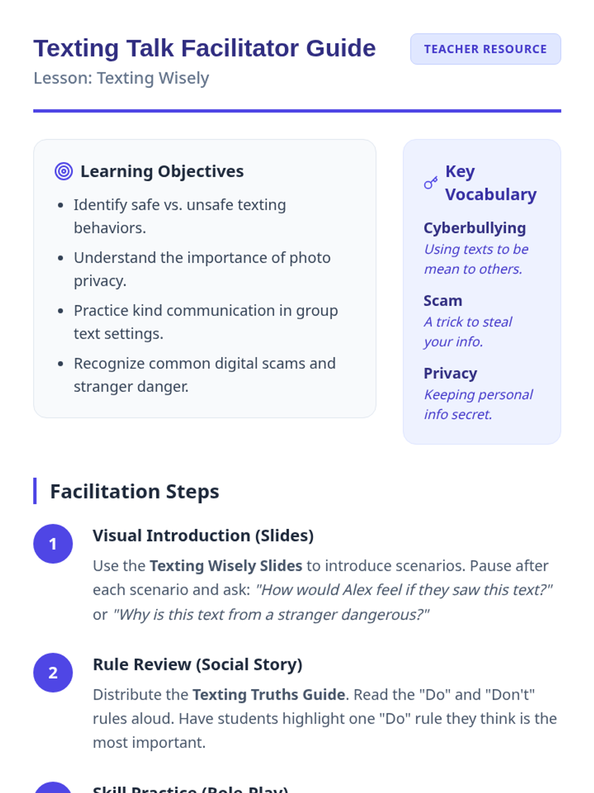 A comprehensive lesson for high school special education students covering texting etiquette, cyberbullying, privacy, and safety from strangers and scams.