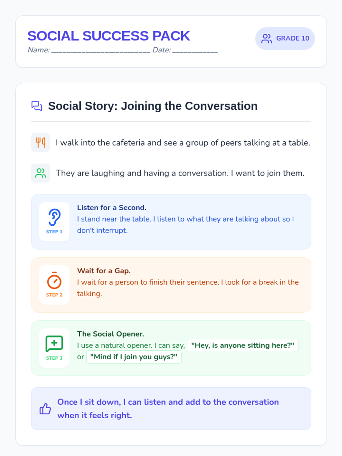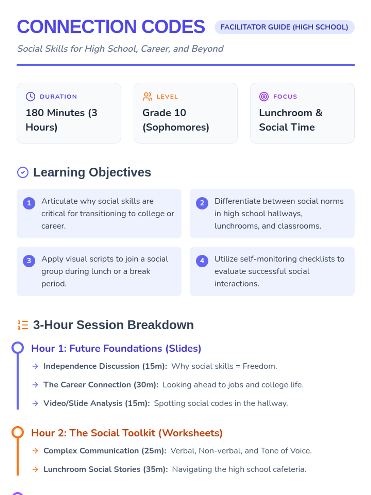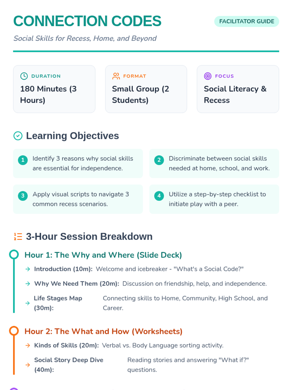 A comprehensive 3-hour lesson designed for students with autism to understand the importance of social skills across various life stages, culminating in practical scripts for recess success.