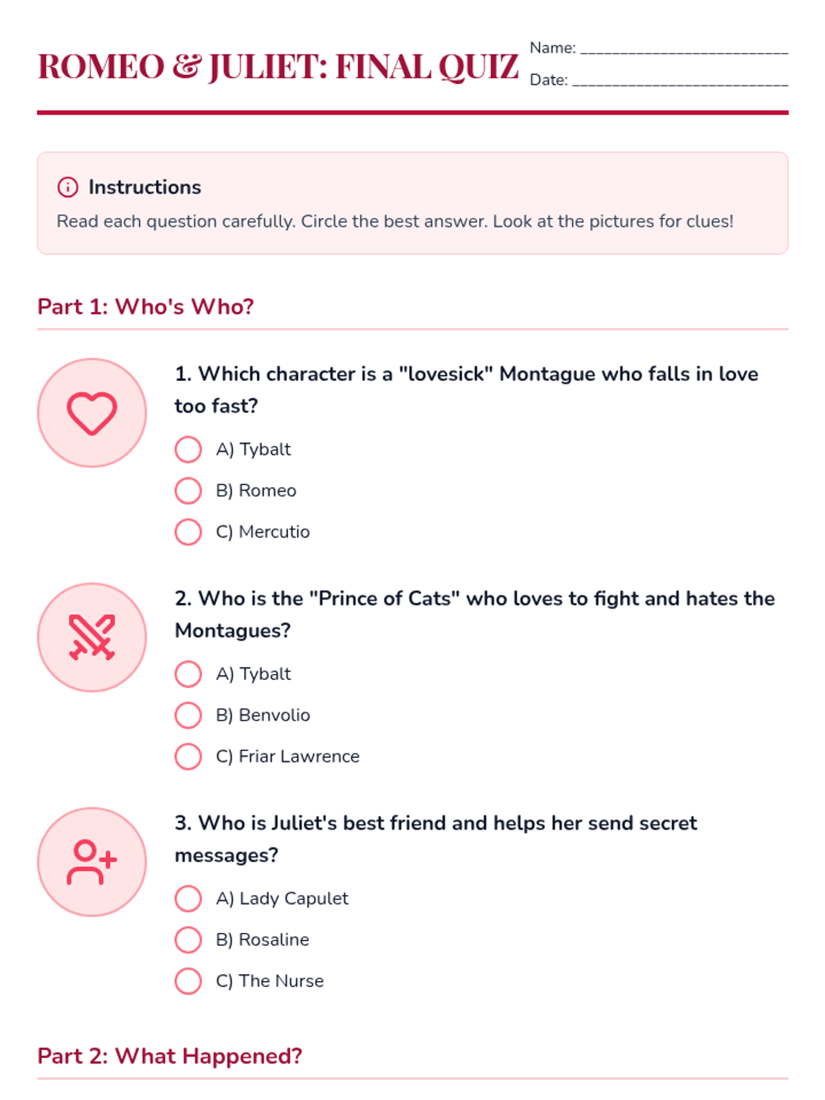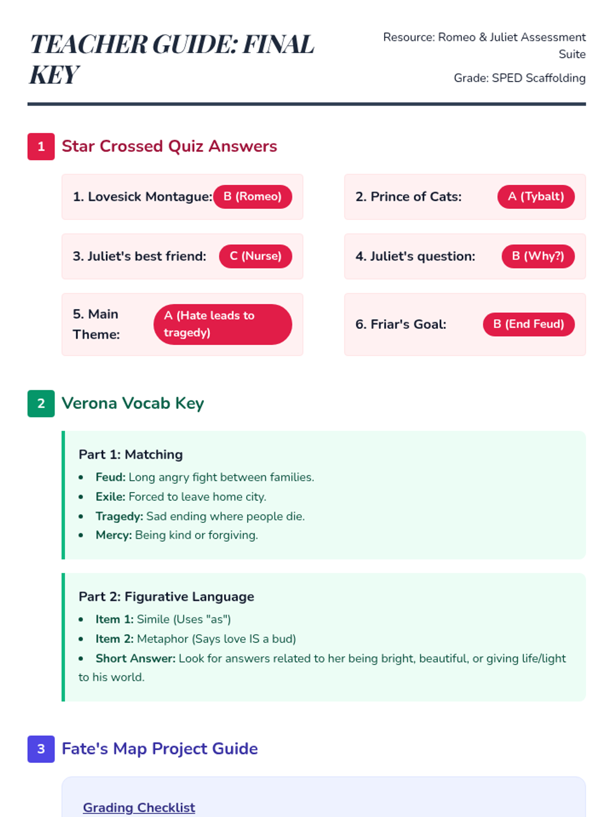A comprehensive final assessment suite for Romeo and Juliet designed for SPED students, featuring visual supports, graphic organizers, and scaffolded vocabulary tasks.