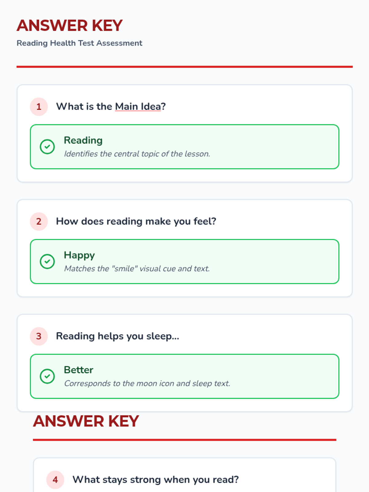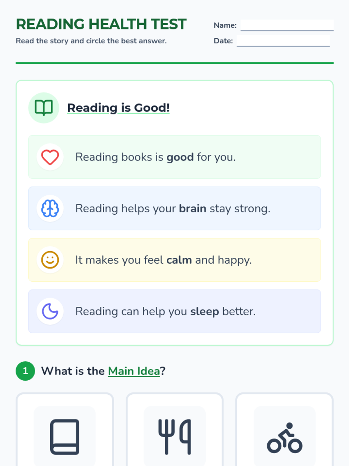 A simplified reading assessment based on the health benefits of reading, designed for students with moderate to severe disabilities at a 1.0-2.0 reading level.