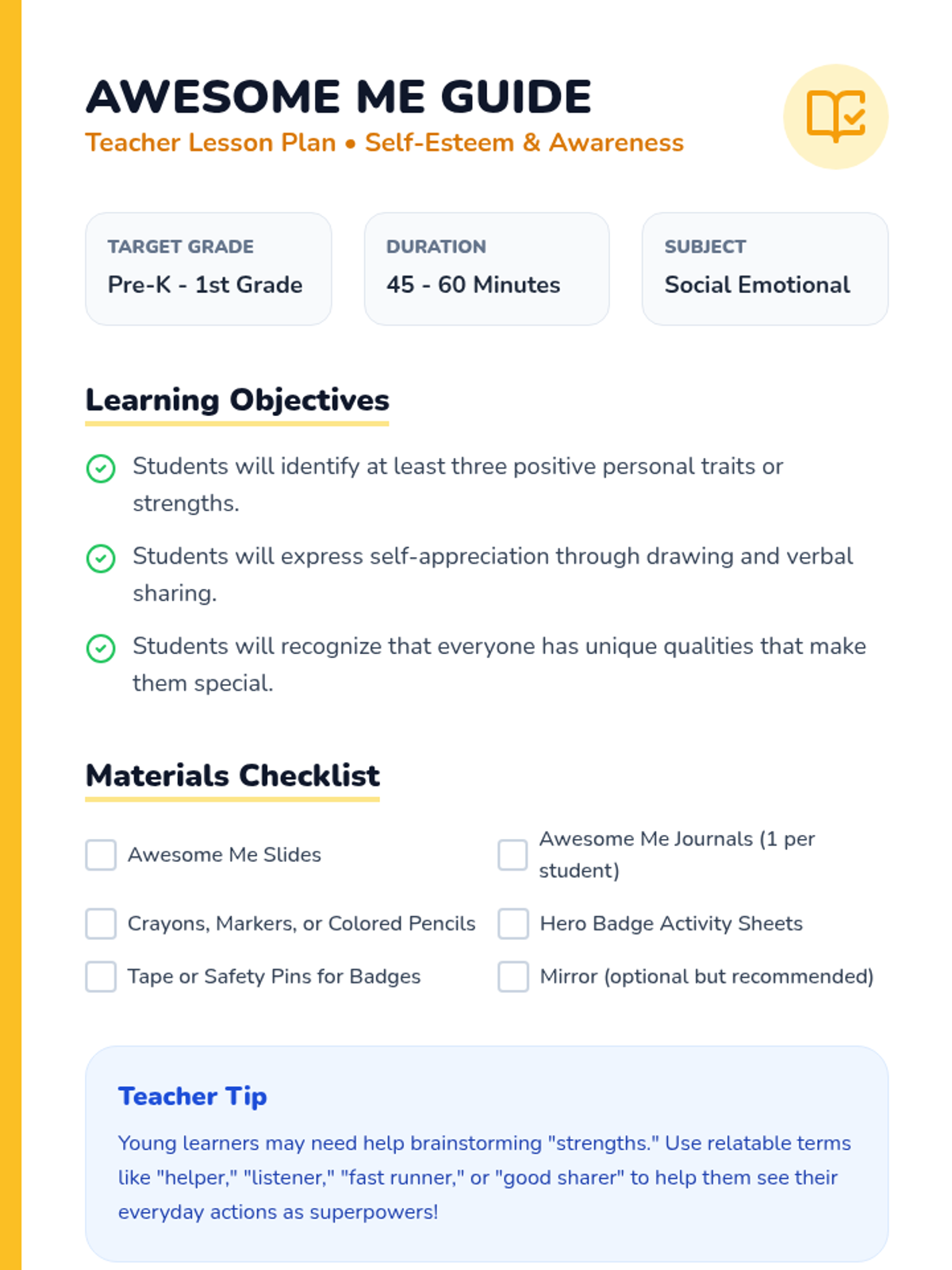 A lesson designed for Pre-K to 1st grade students to explore their unique strengths and positive qualities through a guided journal and creative activities.
