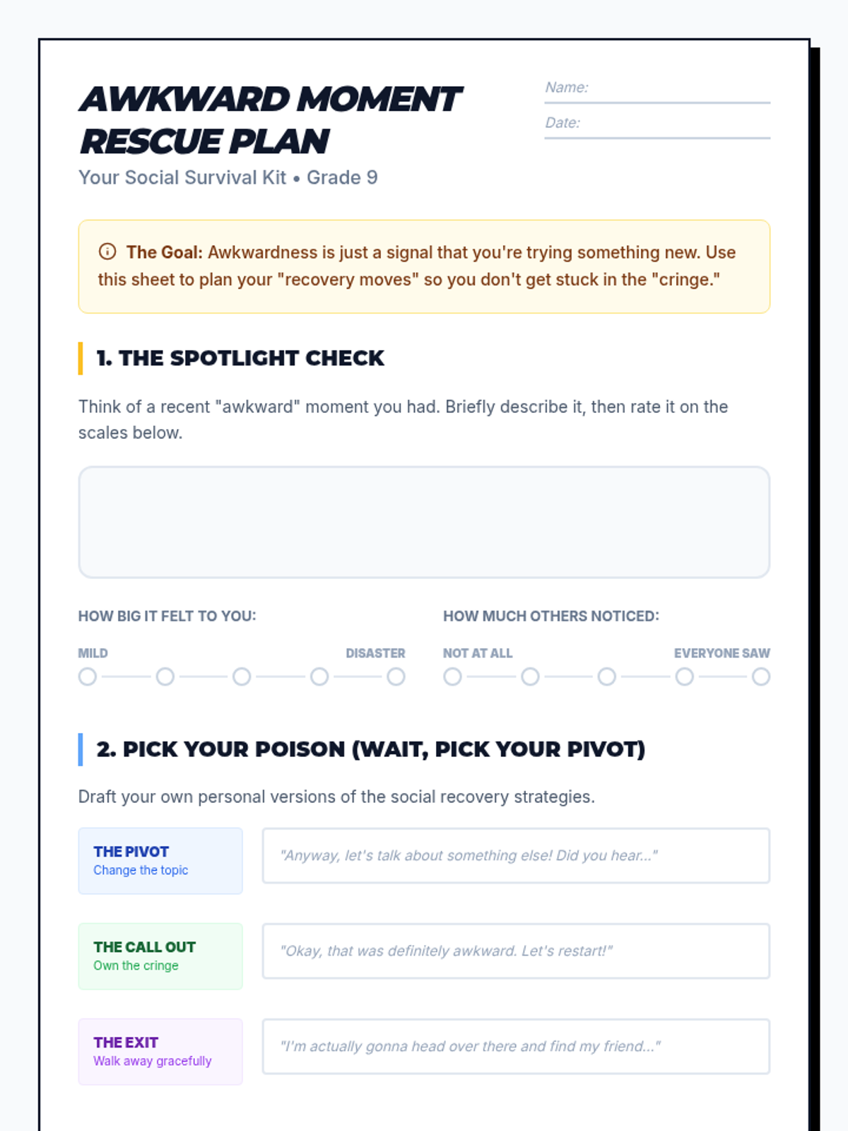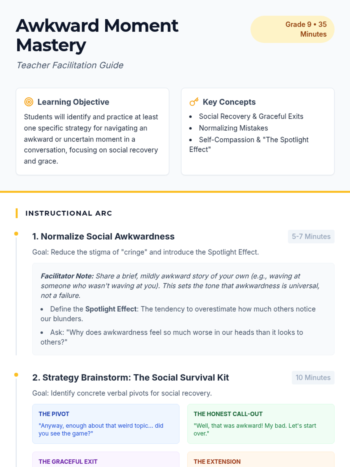 A 35-minute lesson designed to help 9th graders navigate social friction with confidence. Students will learn to normalize awkwardness, practice graceful exits, and develop self-compassion when conversations don't go as planned.