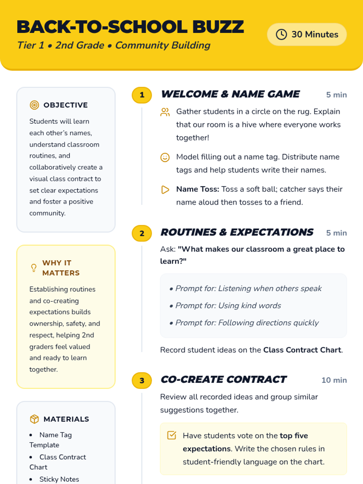 Kick off the school year with a lively Welcome and Expectations session designed for 2nd graders! Students will learn each other's names, understand classroom routines, and co-create a positive class contract.