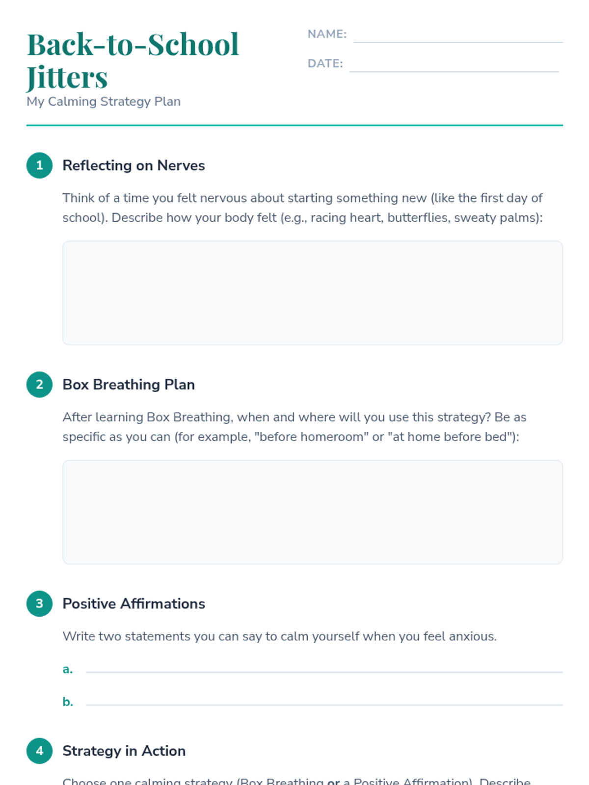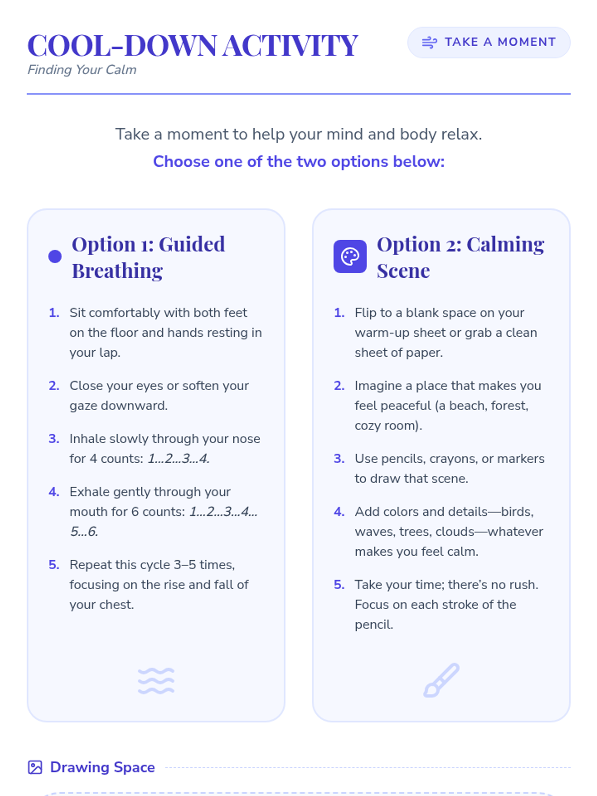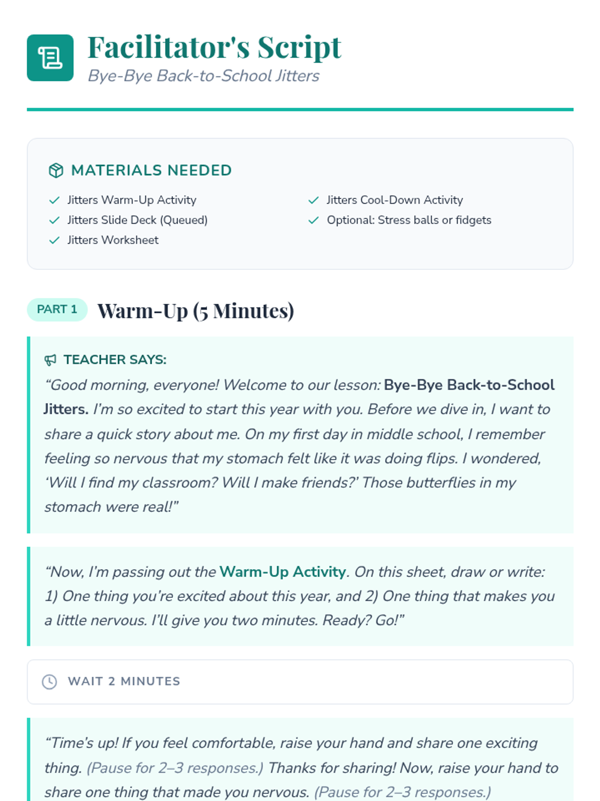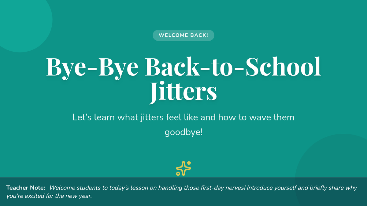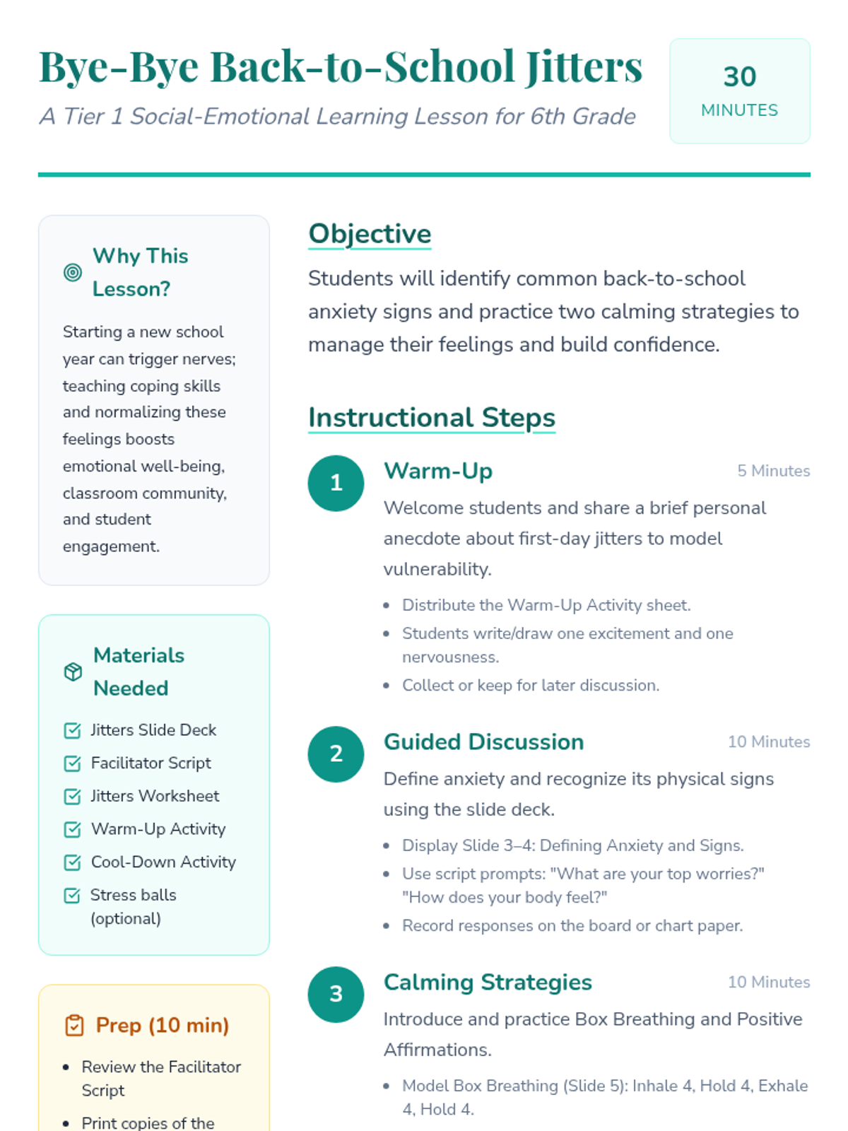 A 30-minute Tier 1 lesson for 6th graders to help them recognize and manage back-to-school anxiety through engaging activities, guided discussions, and calming strategies.