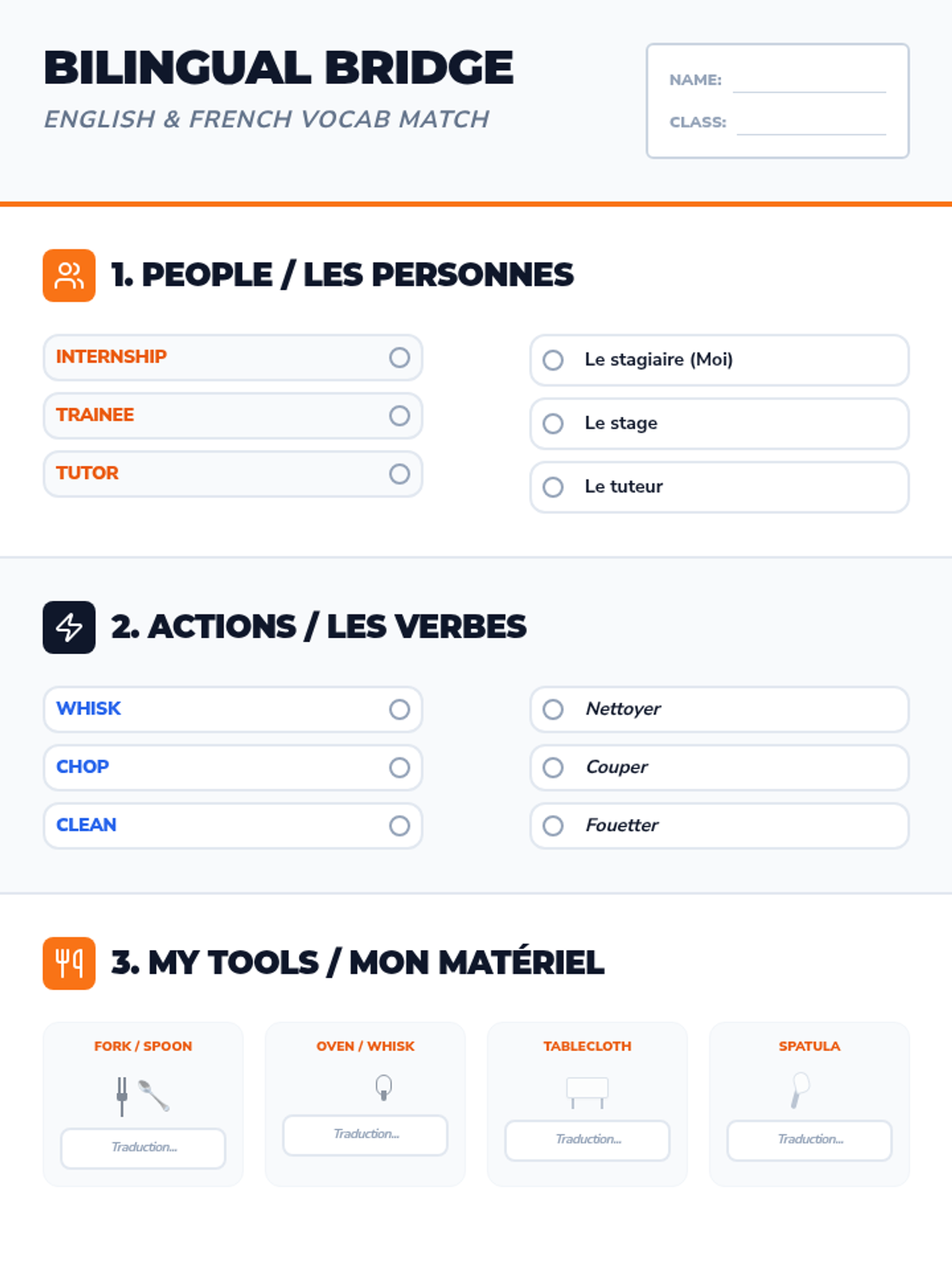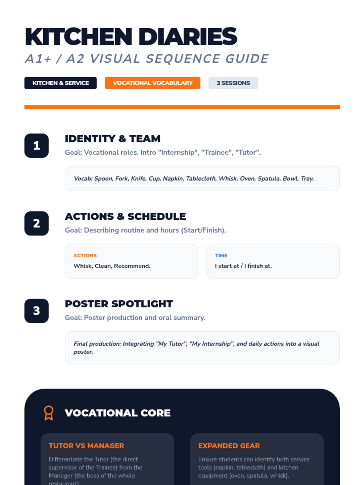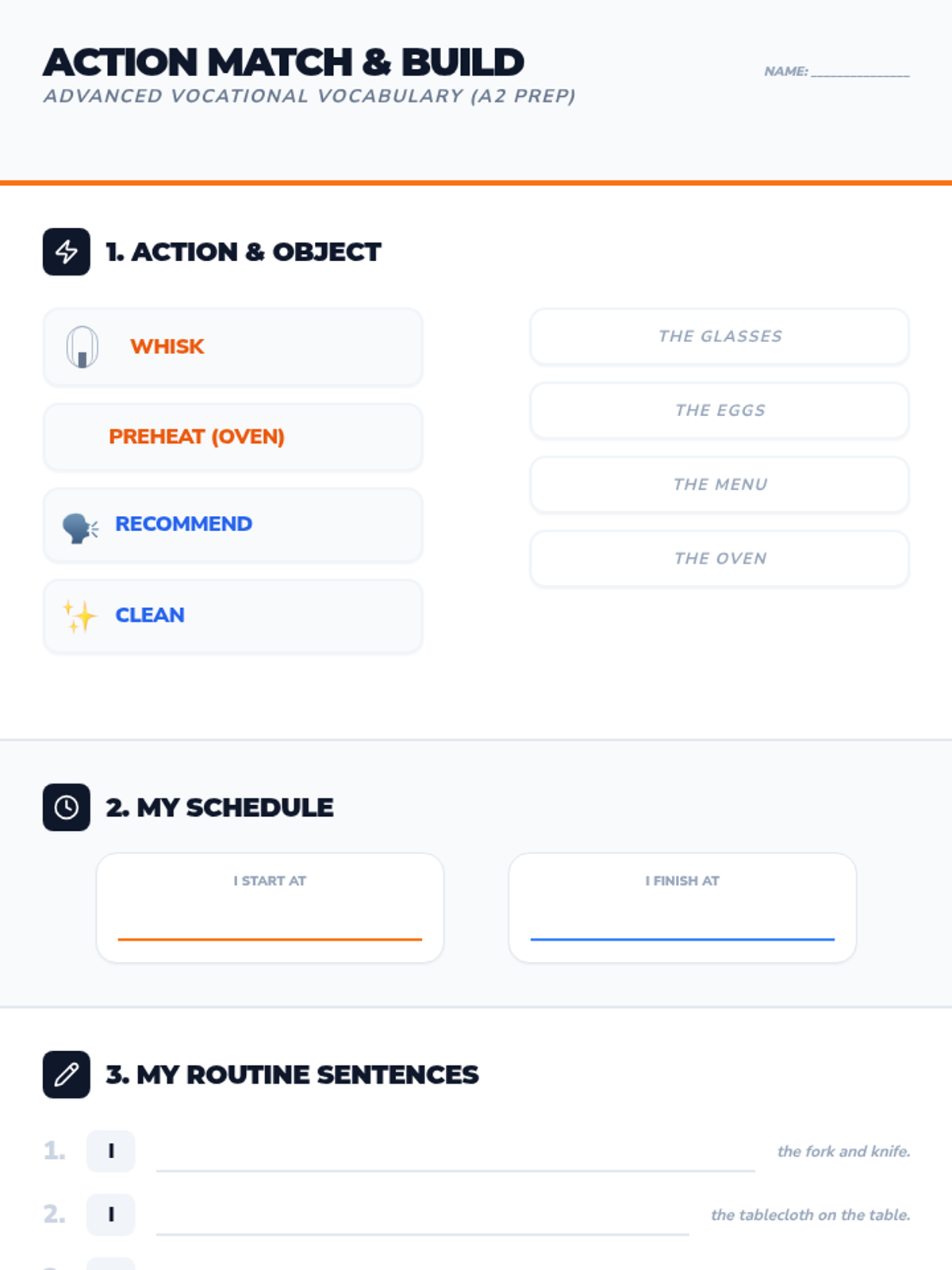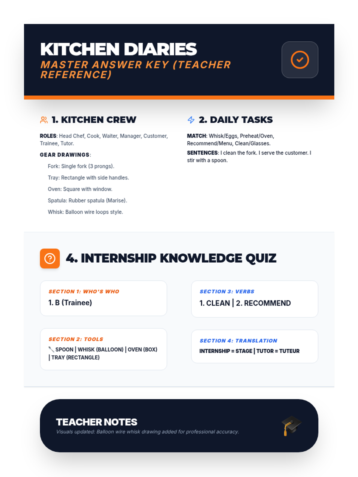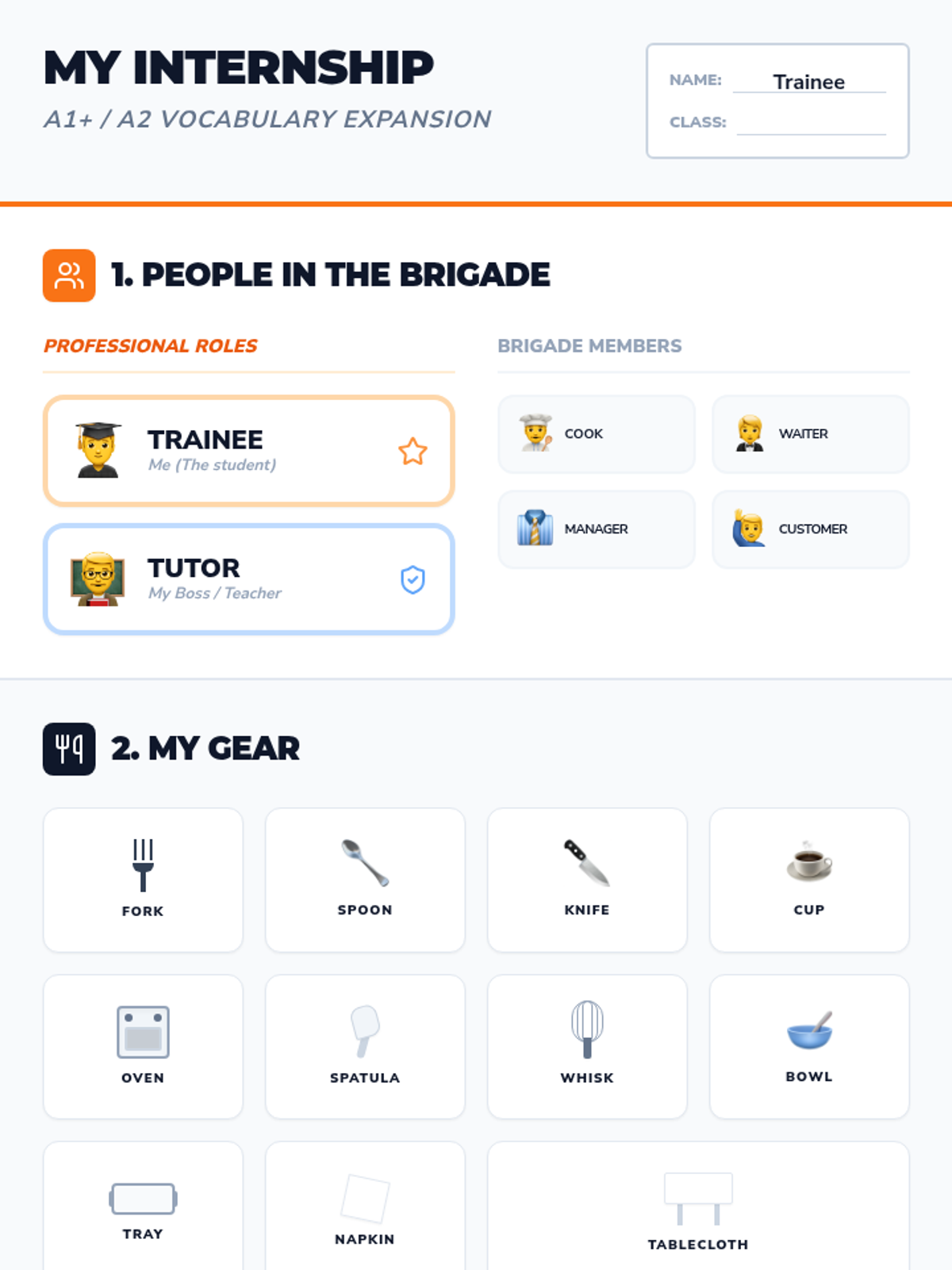 Focuses on identifying kitchen/restaurant roles and equipment used during the internship to re-establish professional vocabulary.