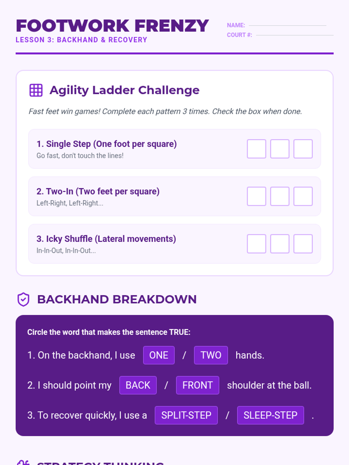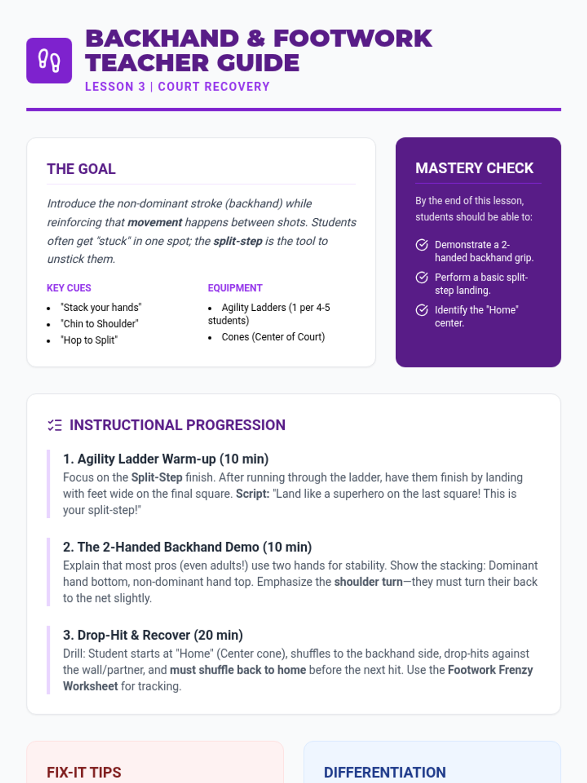 This lesson introduces the backhand stroke, often a challenge for beginners, by breaking down the two-handed grip and shoulder turn. Students combine this new stroke with agility ladder drills that simulate recovering to the center of the court (split-step) after a hit.