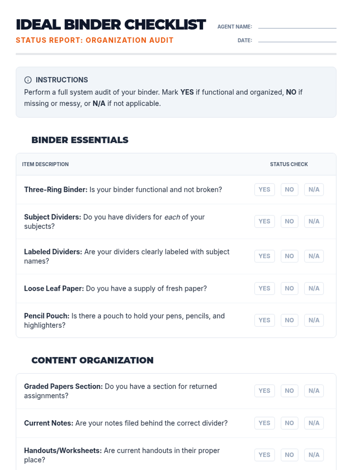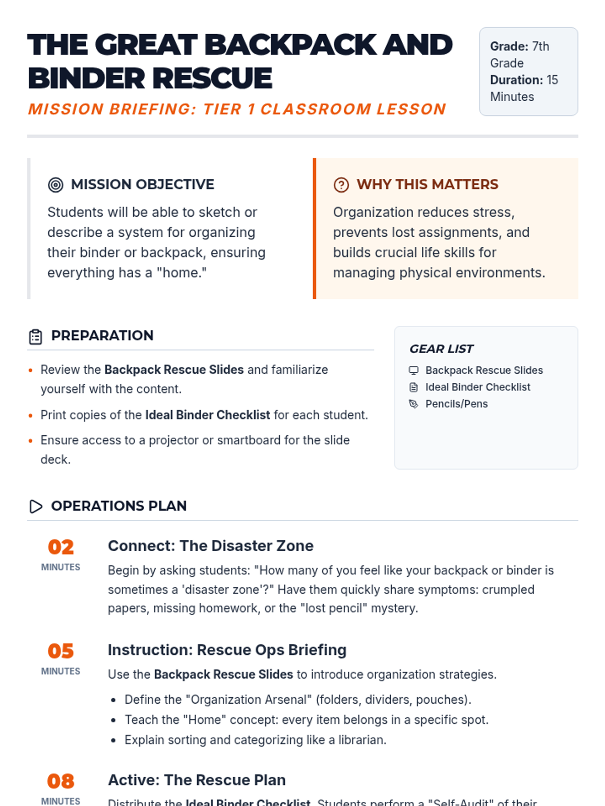A 15-minute 7th-grade lesson focused on developing physical organization systems for backpacks and binders to reduce stress and improve academic success.