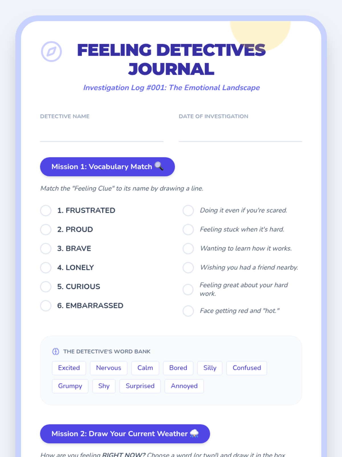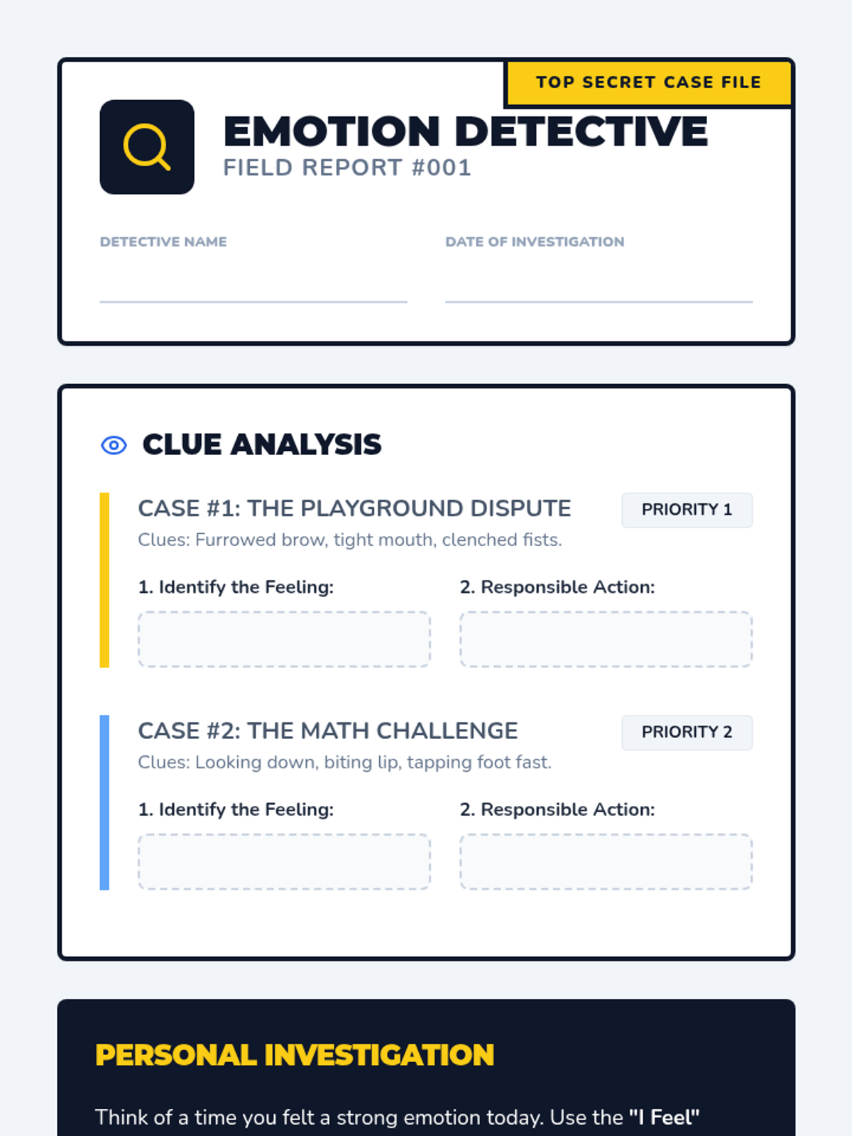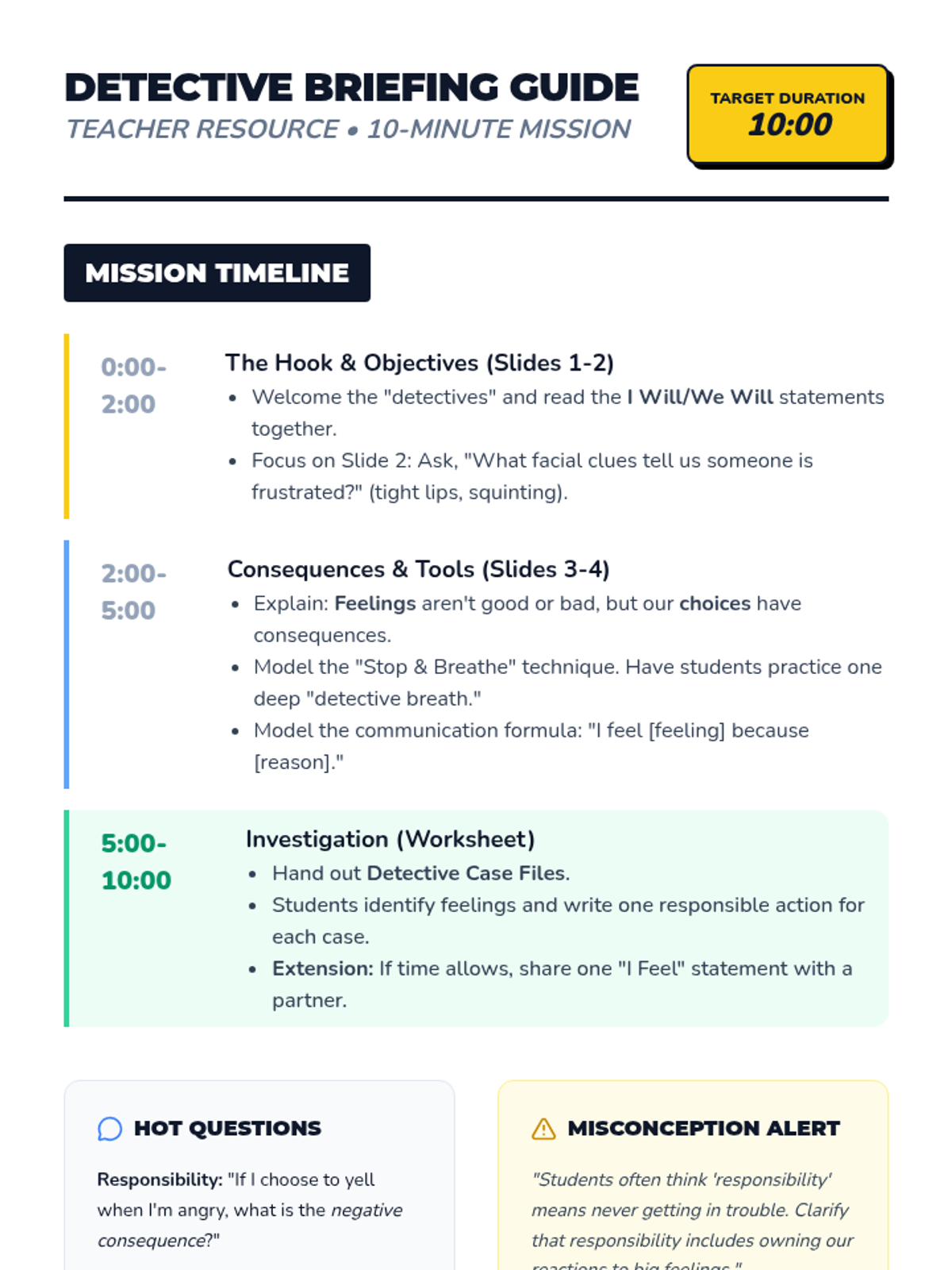 A fast-paced 10-minute lesson where students become 'Emotion Detectives' to identify feelings through facial expressions and learn how these feelings impact their choices and responsibilities.