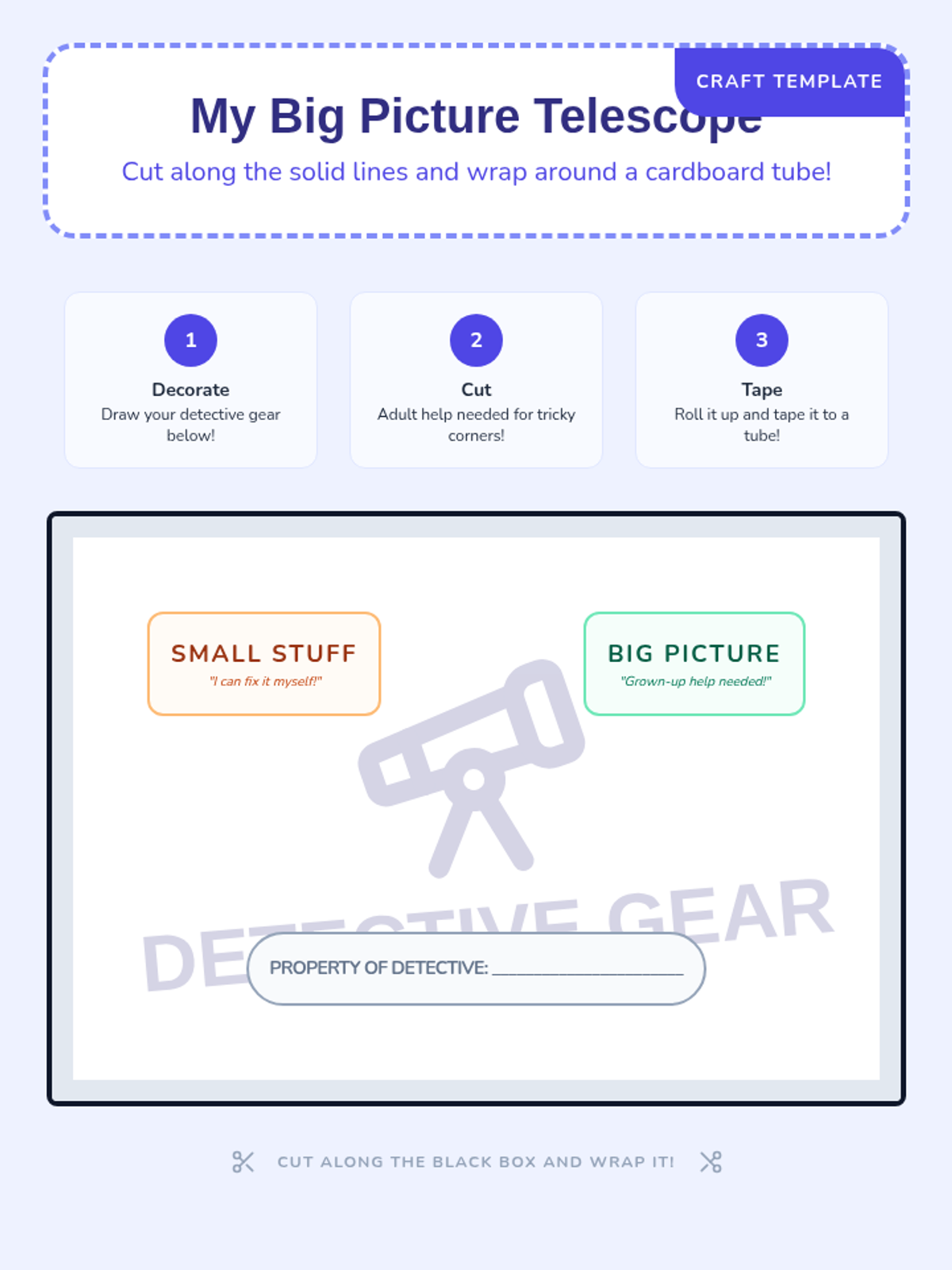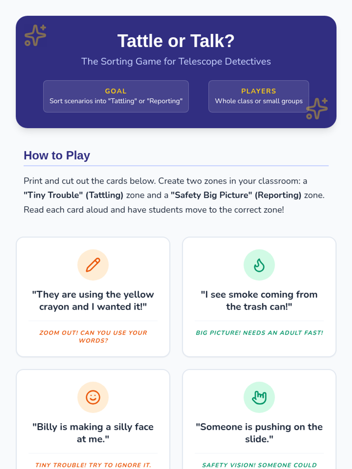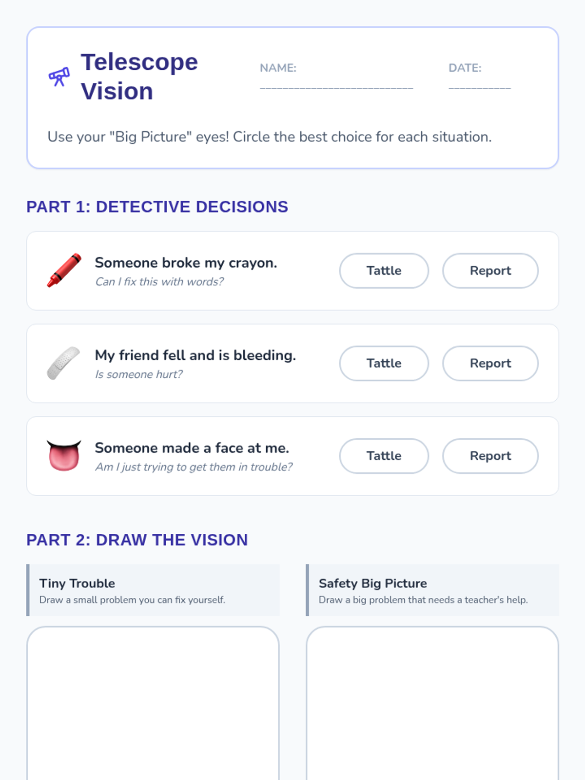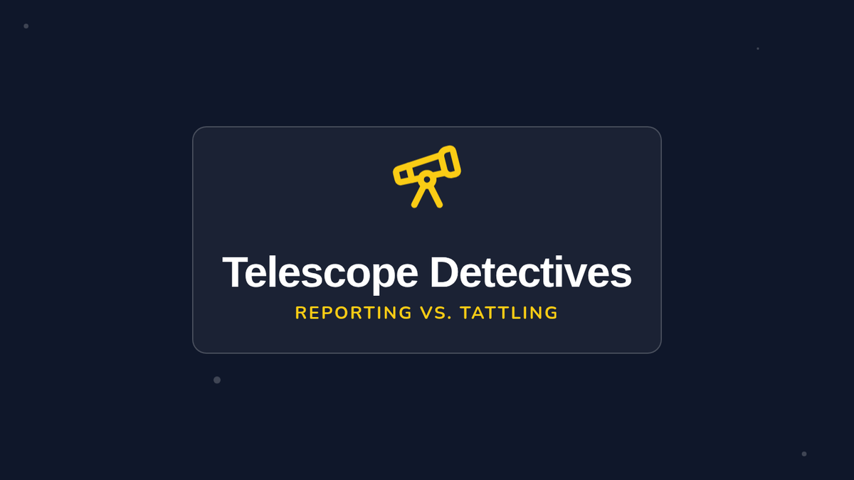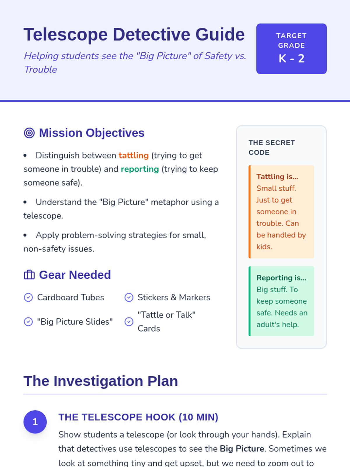 A K-2 social-emotional learning lesson that teaches students the difference between tattling (to get someone in trouble) and reporting (to keep someone safe) using a 'Big Picture' telescope metaphor.