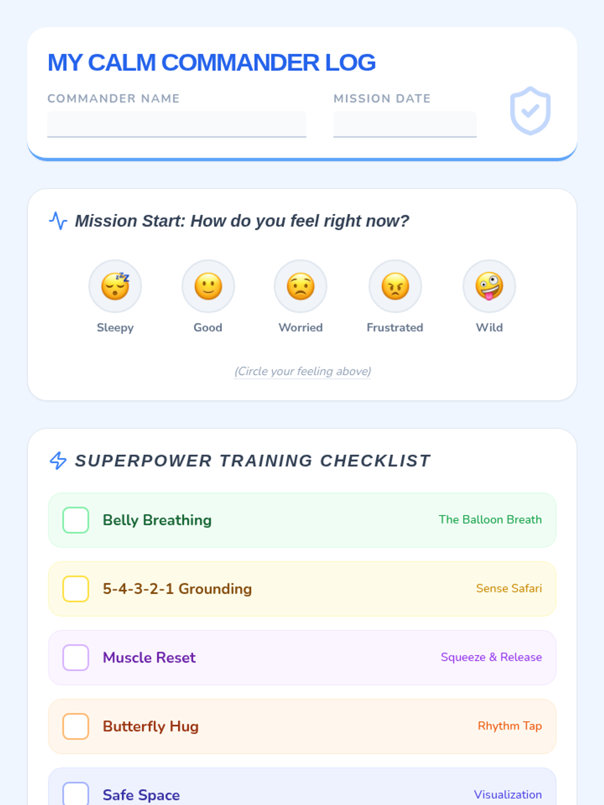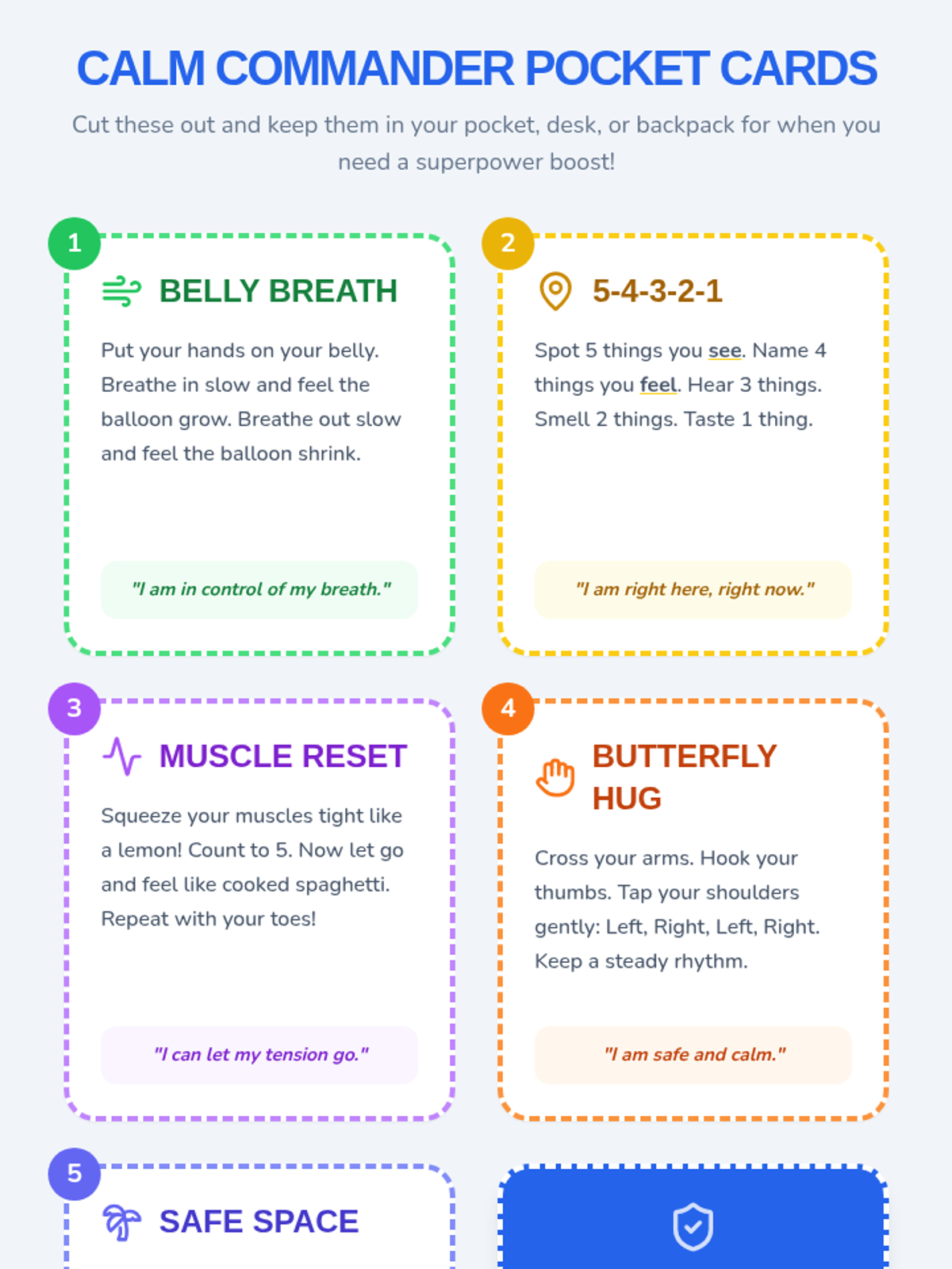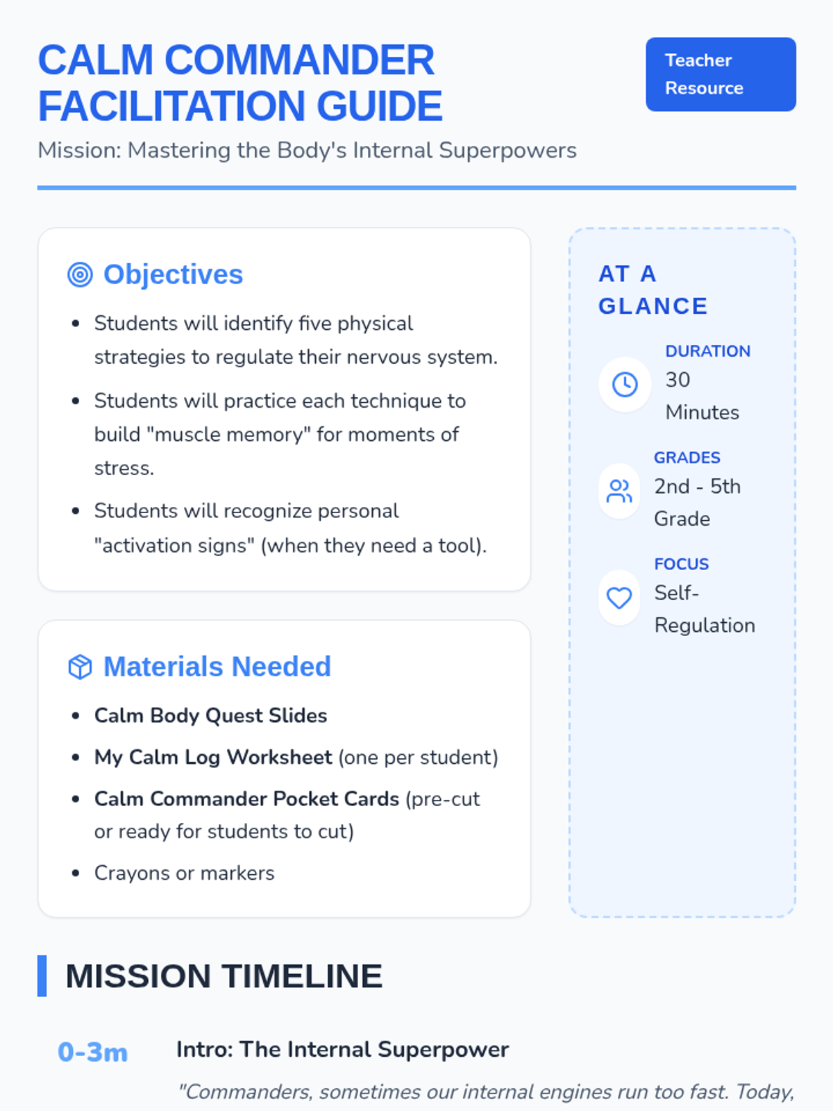 An experiential lesson for grades 2-5 focused on learning and practicing five body-based calming strategies: belly breathing, grounding, muscle relaxation, butterfly hugs, and visualization. Students 'train' to become Calm Body Commanders, learning to manage big emotions through physical techniques.