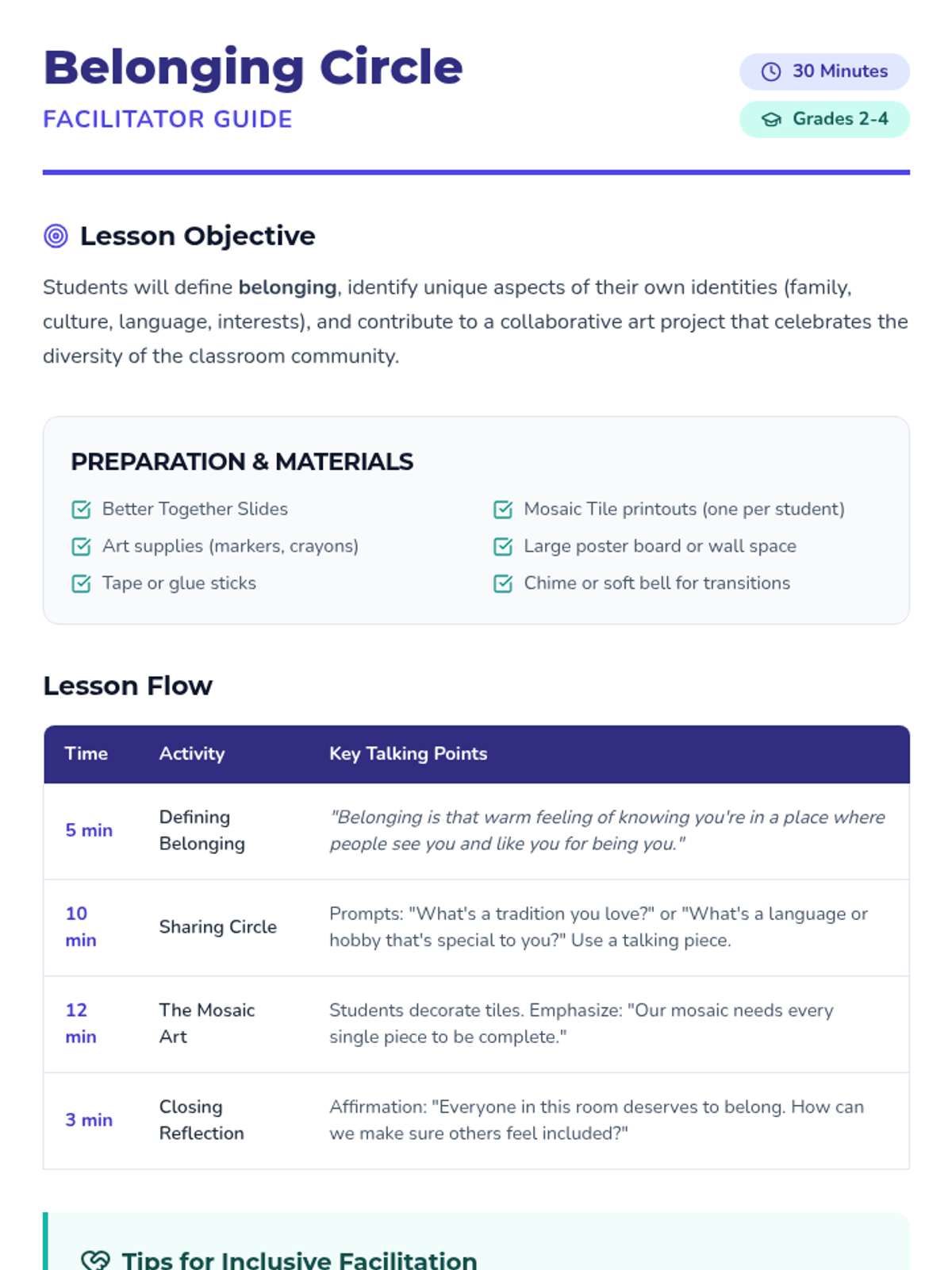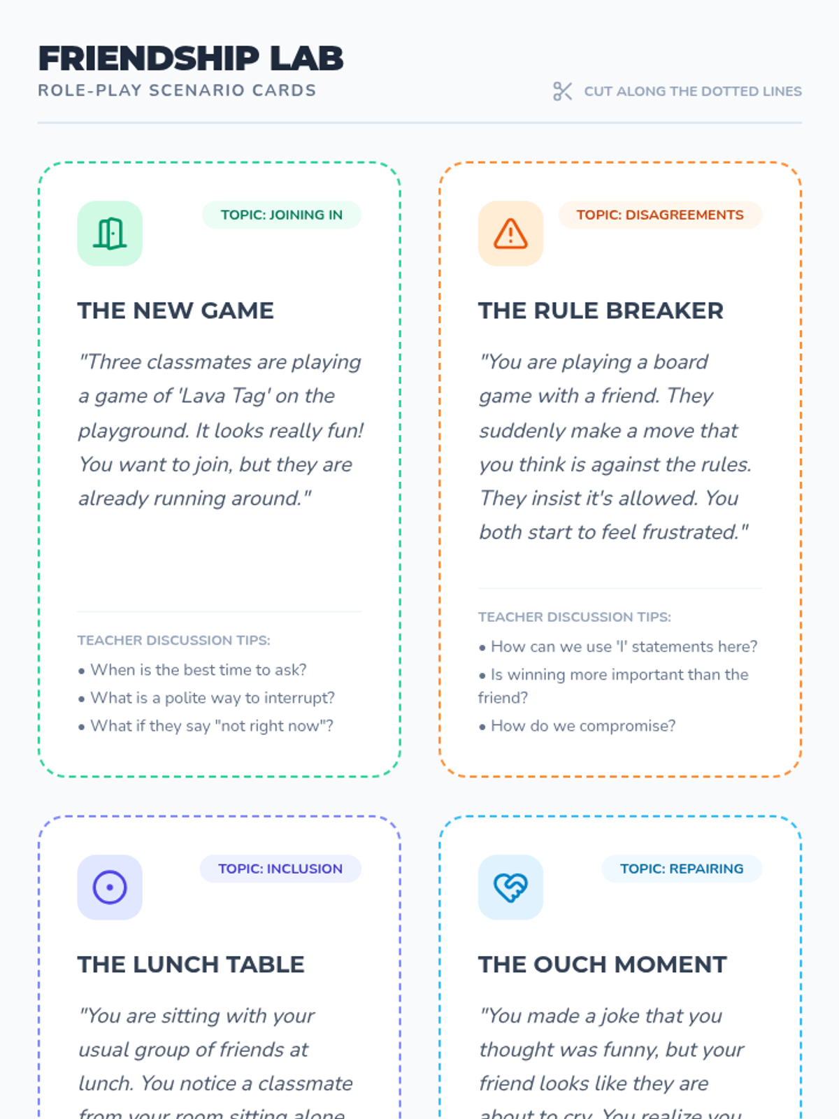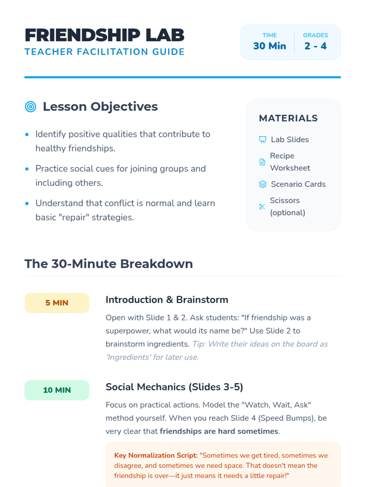A 30-minute social-emotional learning lesson for elementary students focused on building, maintaining, and repairing friendships through interactive brainstorming and creative activities.