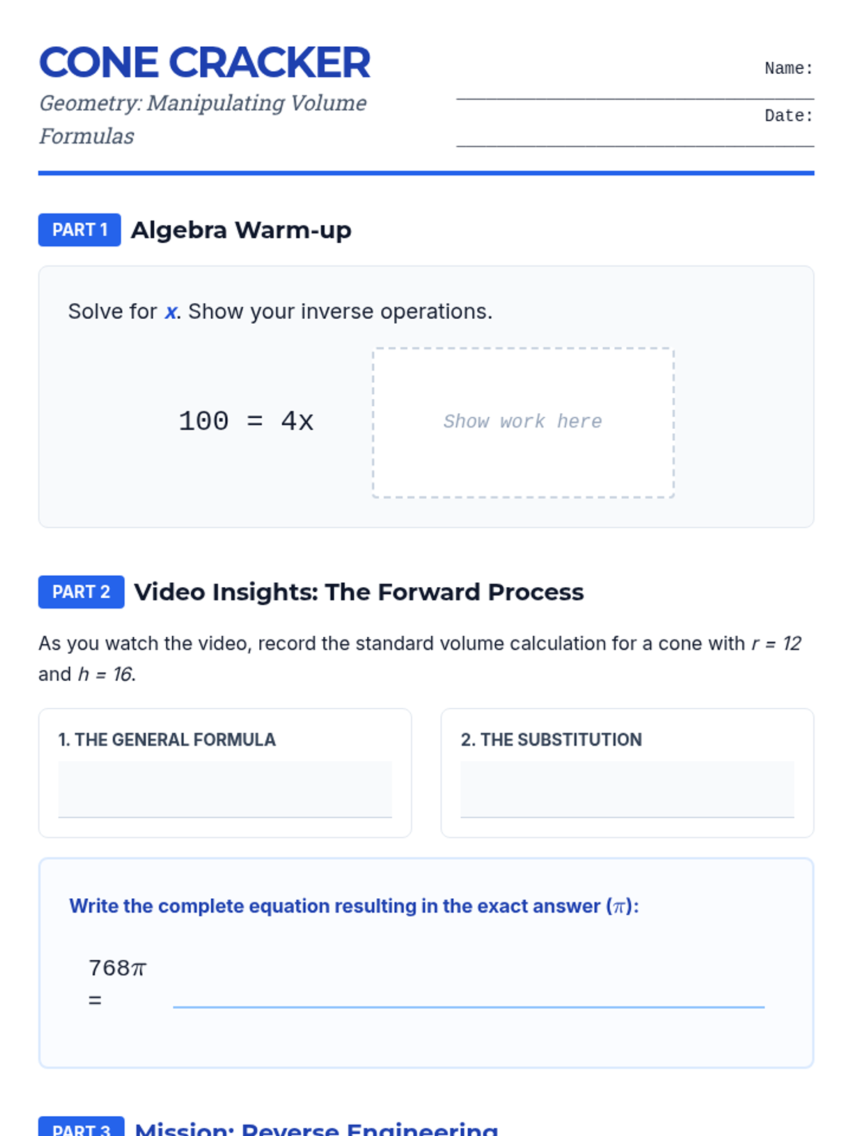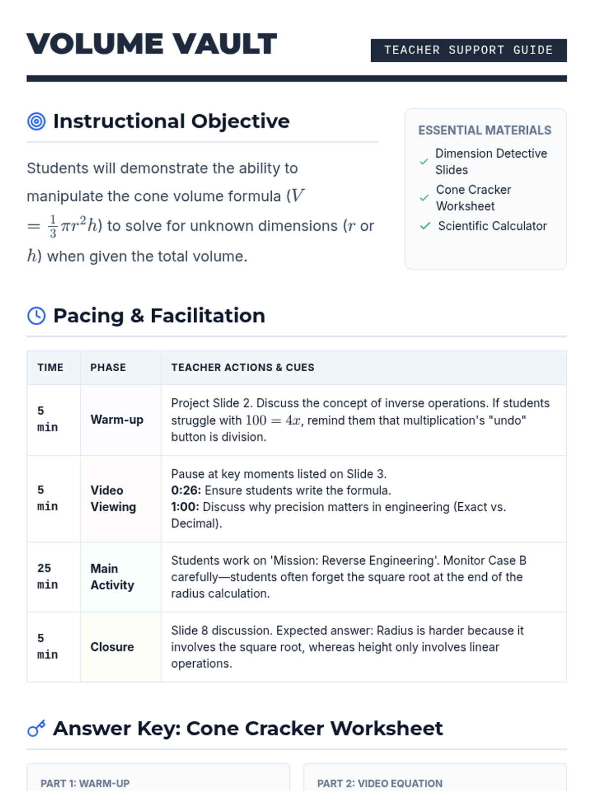 A lesson where students learn to manipulate the cone volume formula to solve for missing dimensions like radius and height by working backward from a given volume.