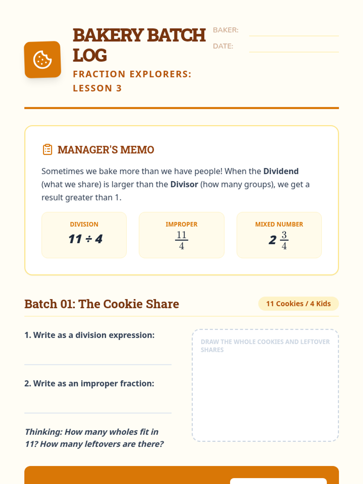 This lesson focuses on scenarios where the amount being shared is larger than the number of shares, leading to improper fractions and mixed numbers. Students learn to represent these quantities through visual models and division.