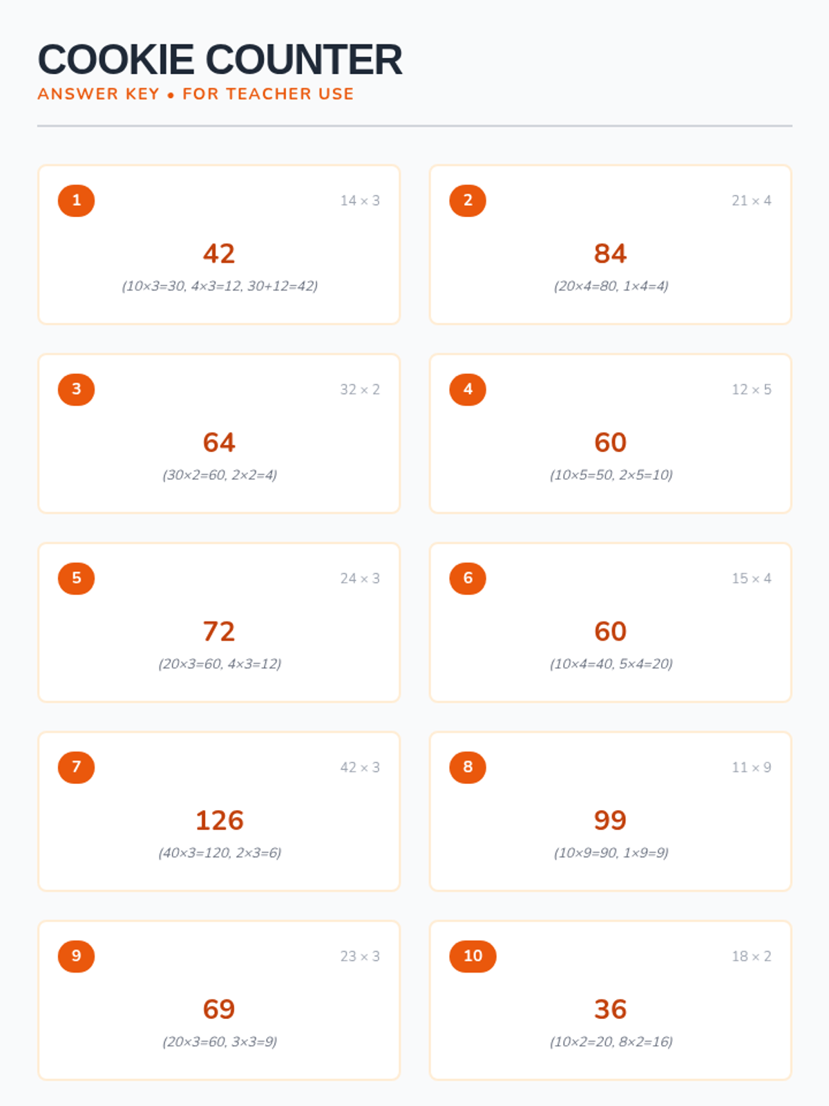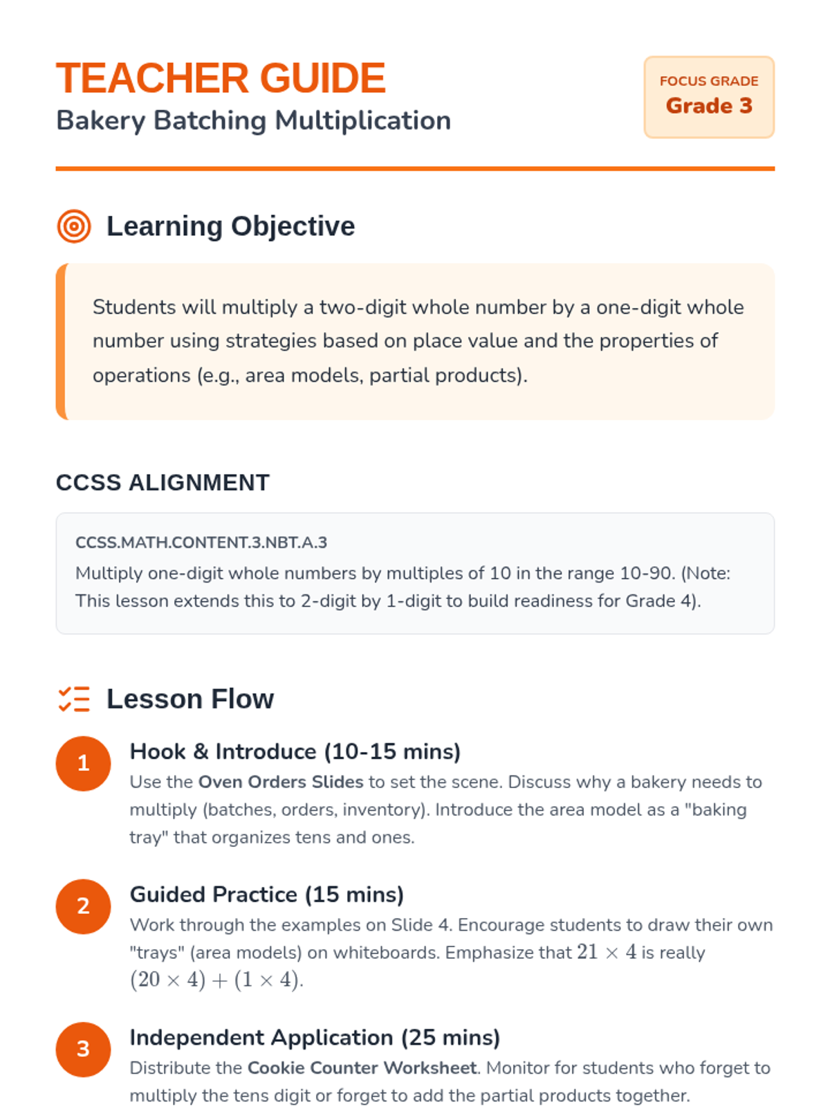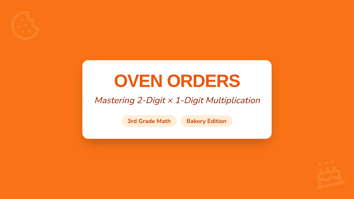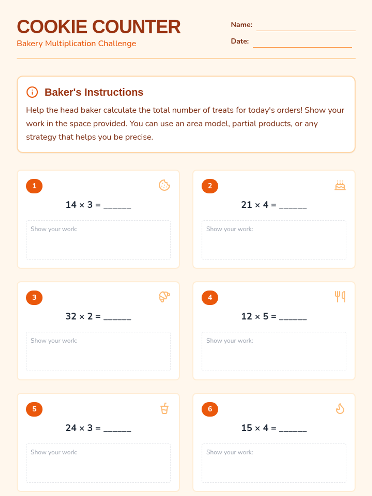 A delicious introduction to 2-digit by 1-digit multiplication using a bakery theme. Students will learn to visualize and solve multiplication problems involving larger batches of treats.