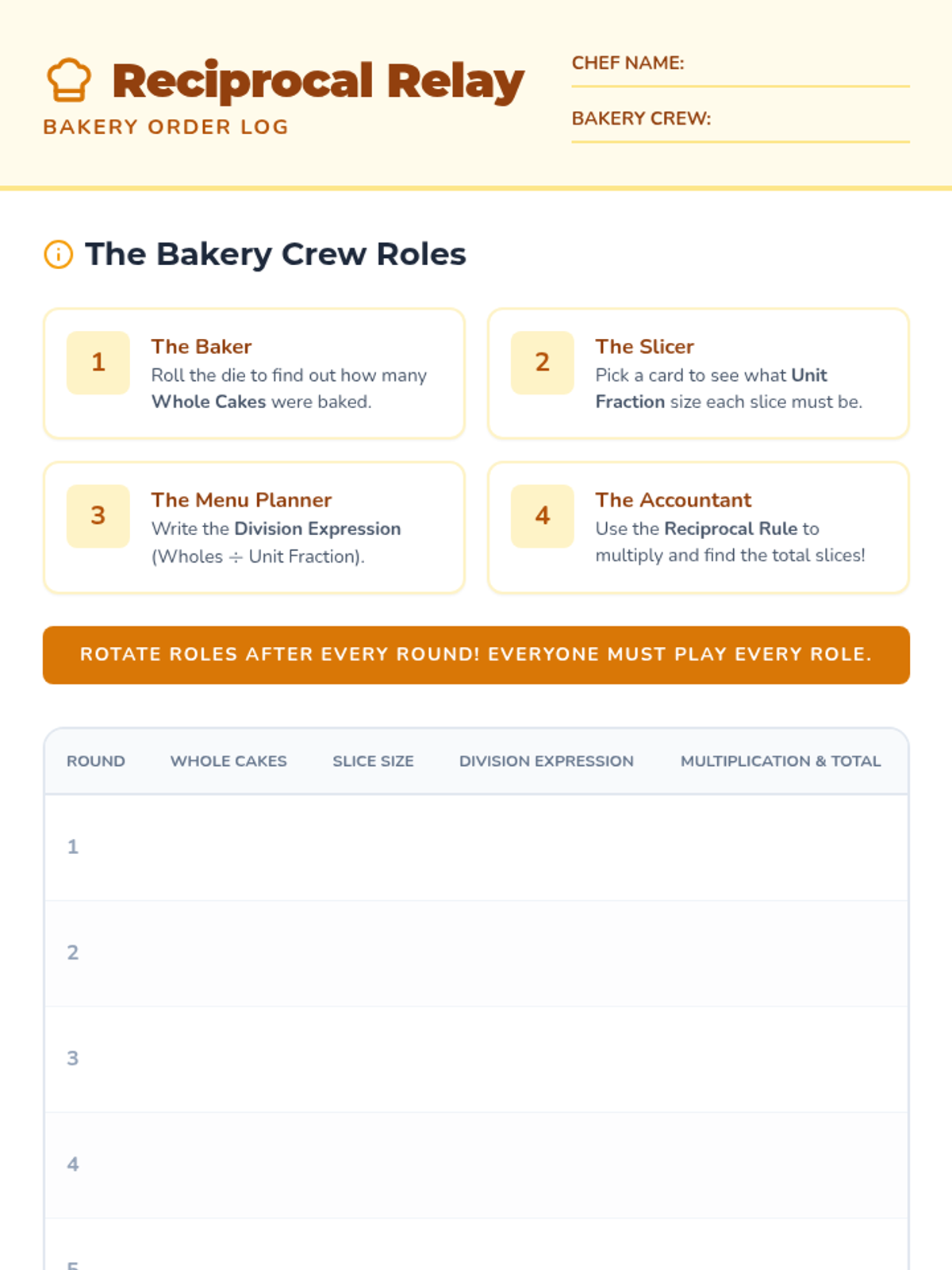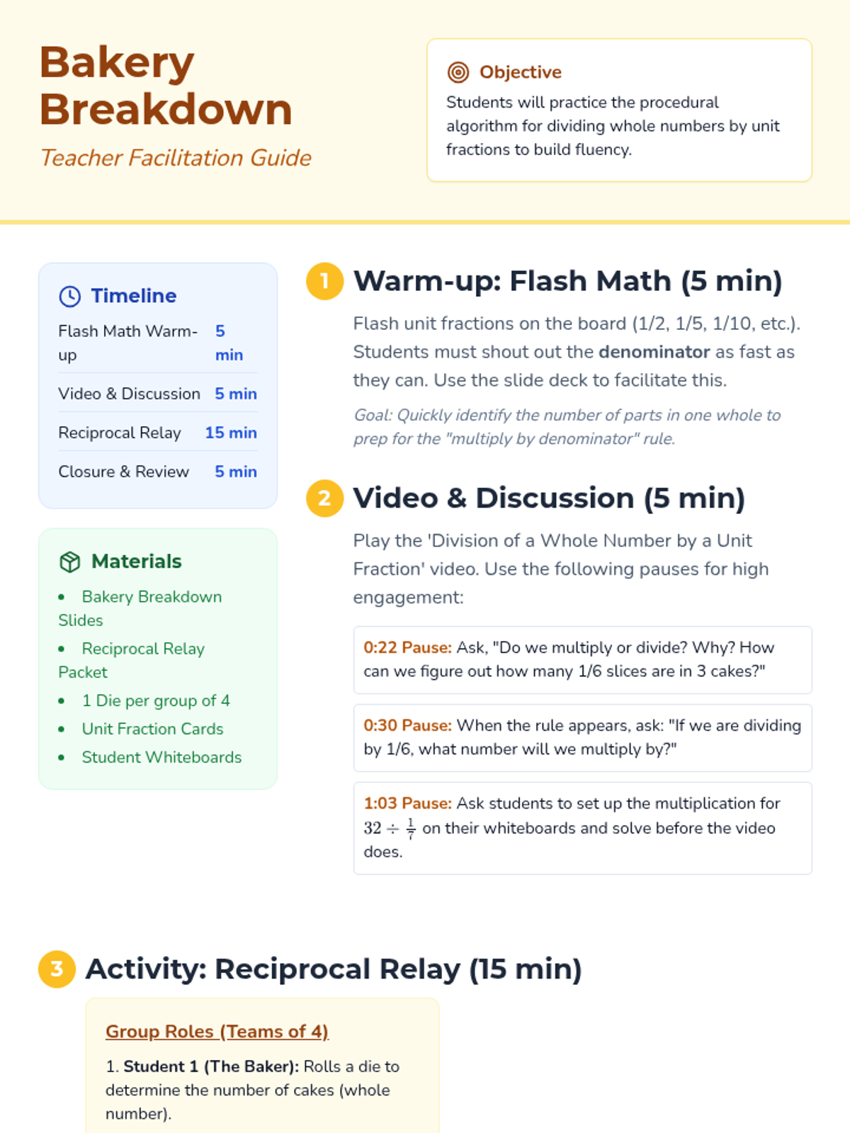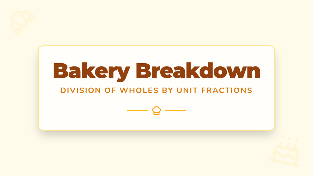 A lesson on dividing whole numbers by unit fractions using a bakery theme. Students use the procedural algorithm (multiplying by the denominator) to solve real-world problems and participate in a collaborative relay activity.