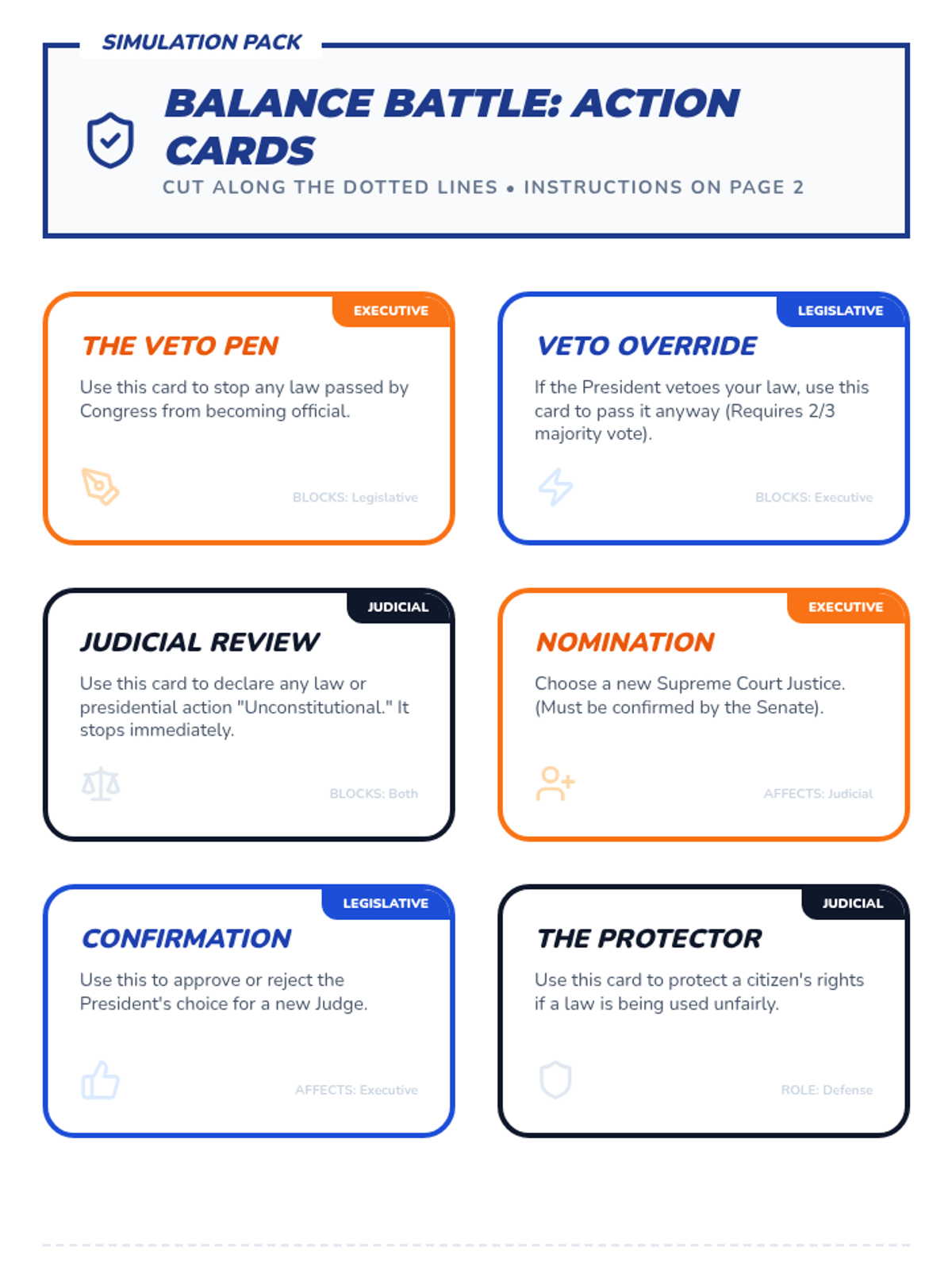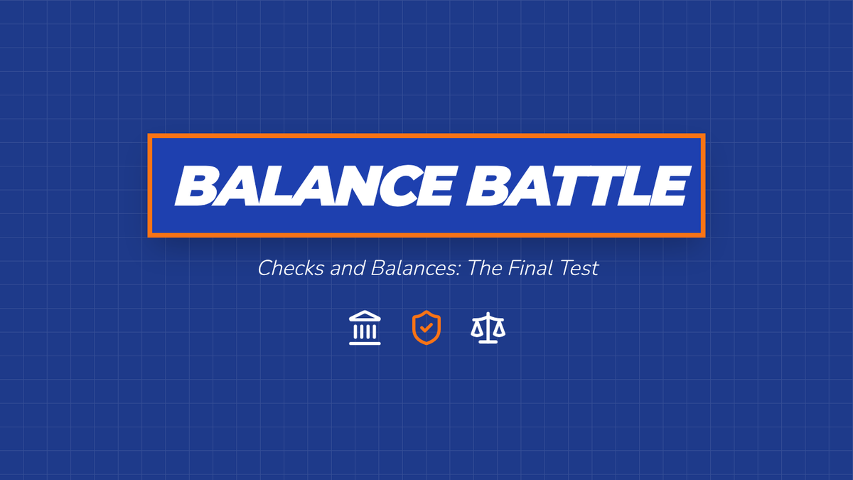 A culminating simulation game where students apply their knowledge of checks and balances to prevent any one branch from gaining total control.