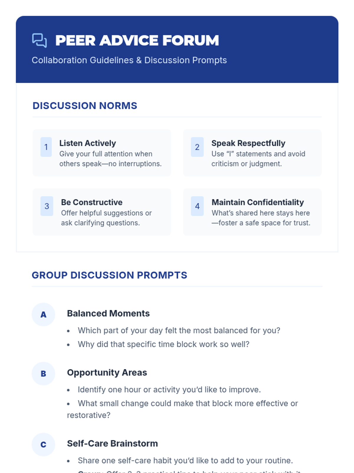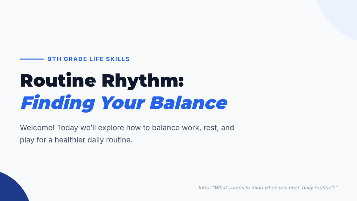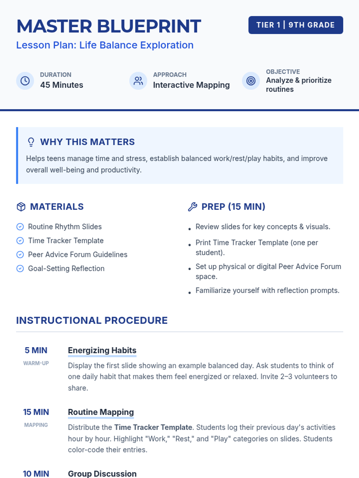 A 45-minute exploration of daily routines, time management, and self-care strategies for 9th graders, featuring routine mapping and personalized planning.