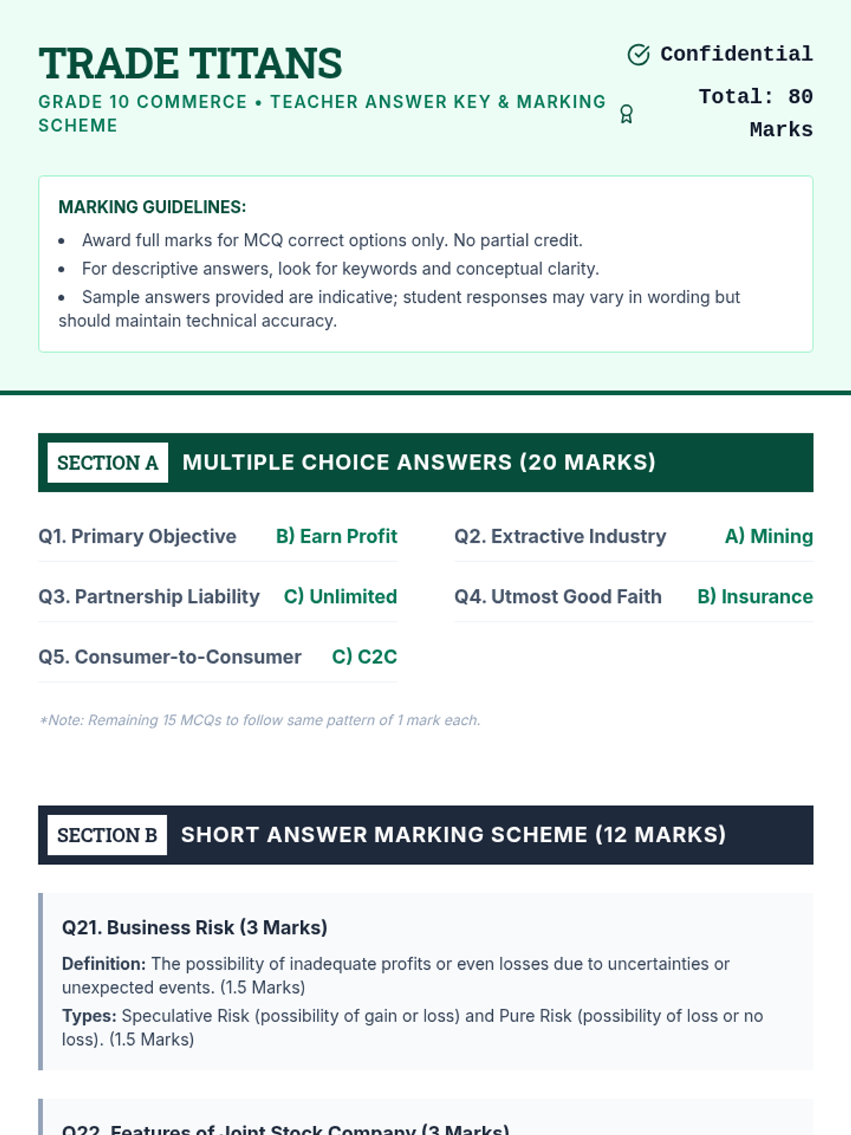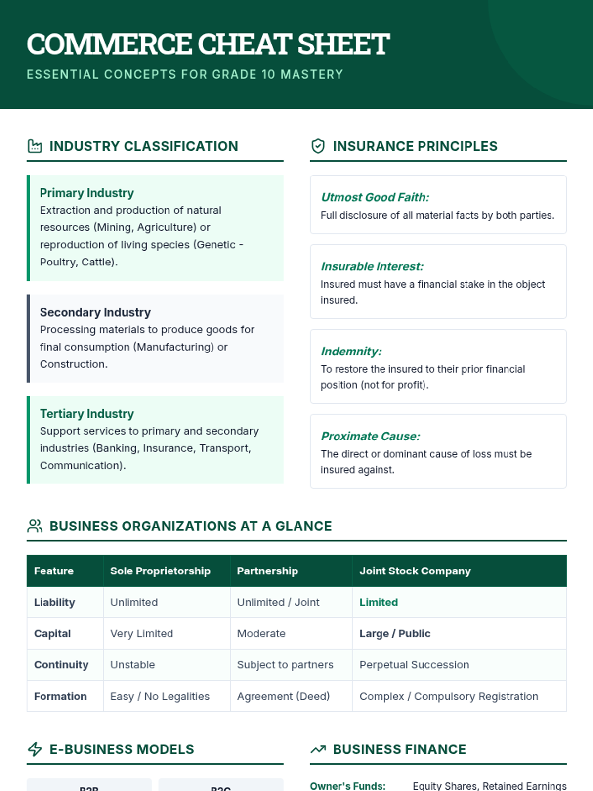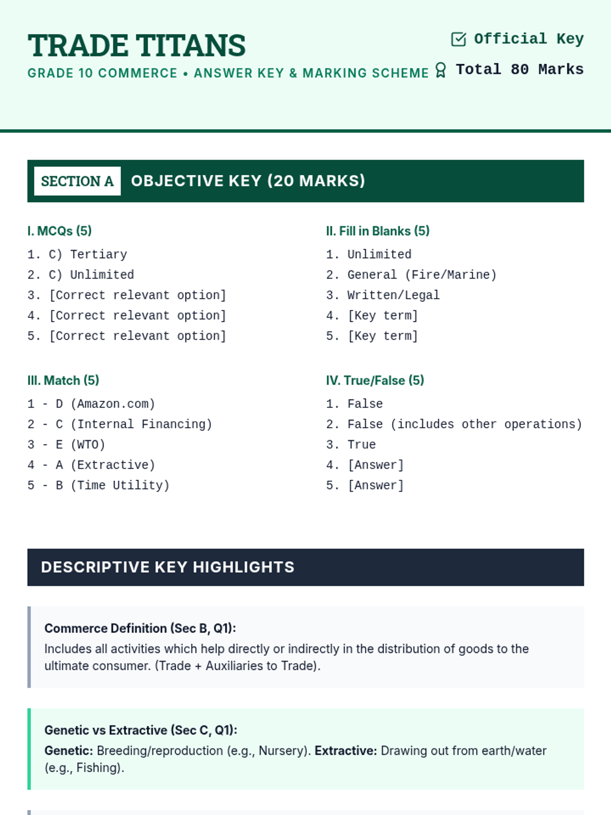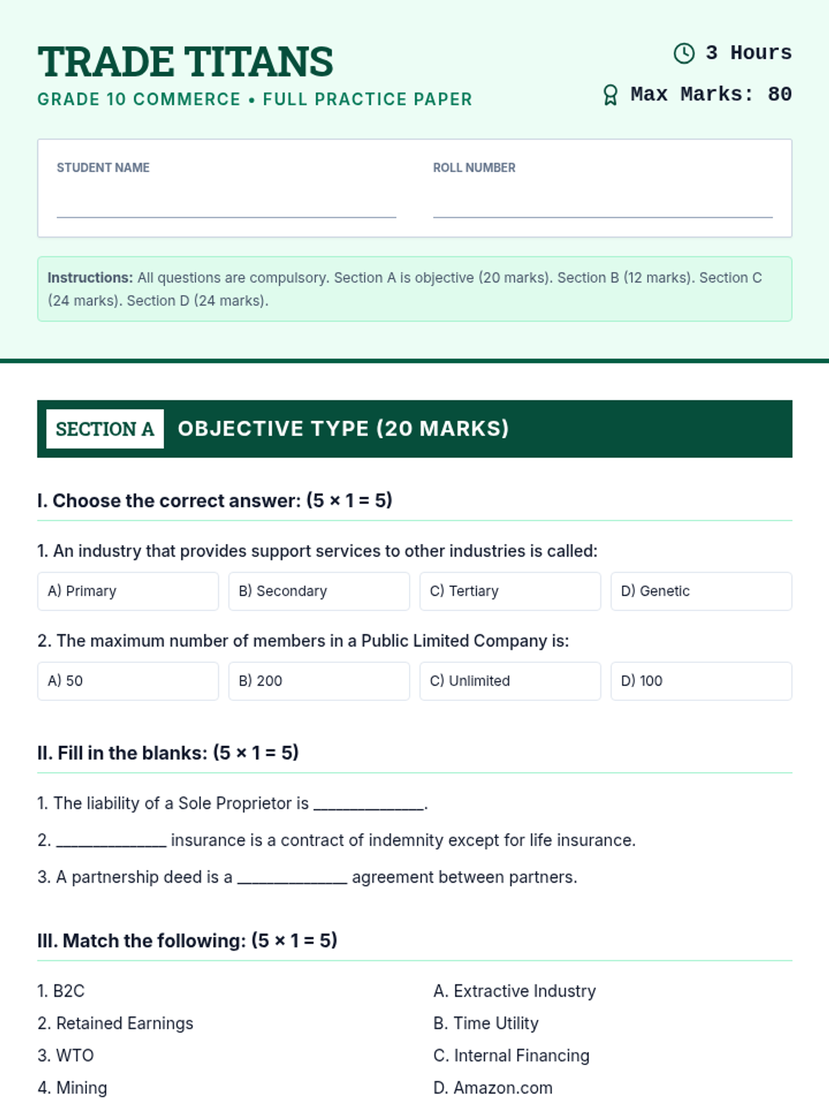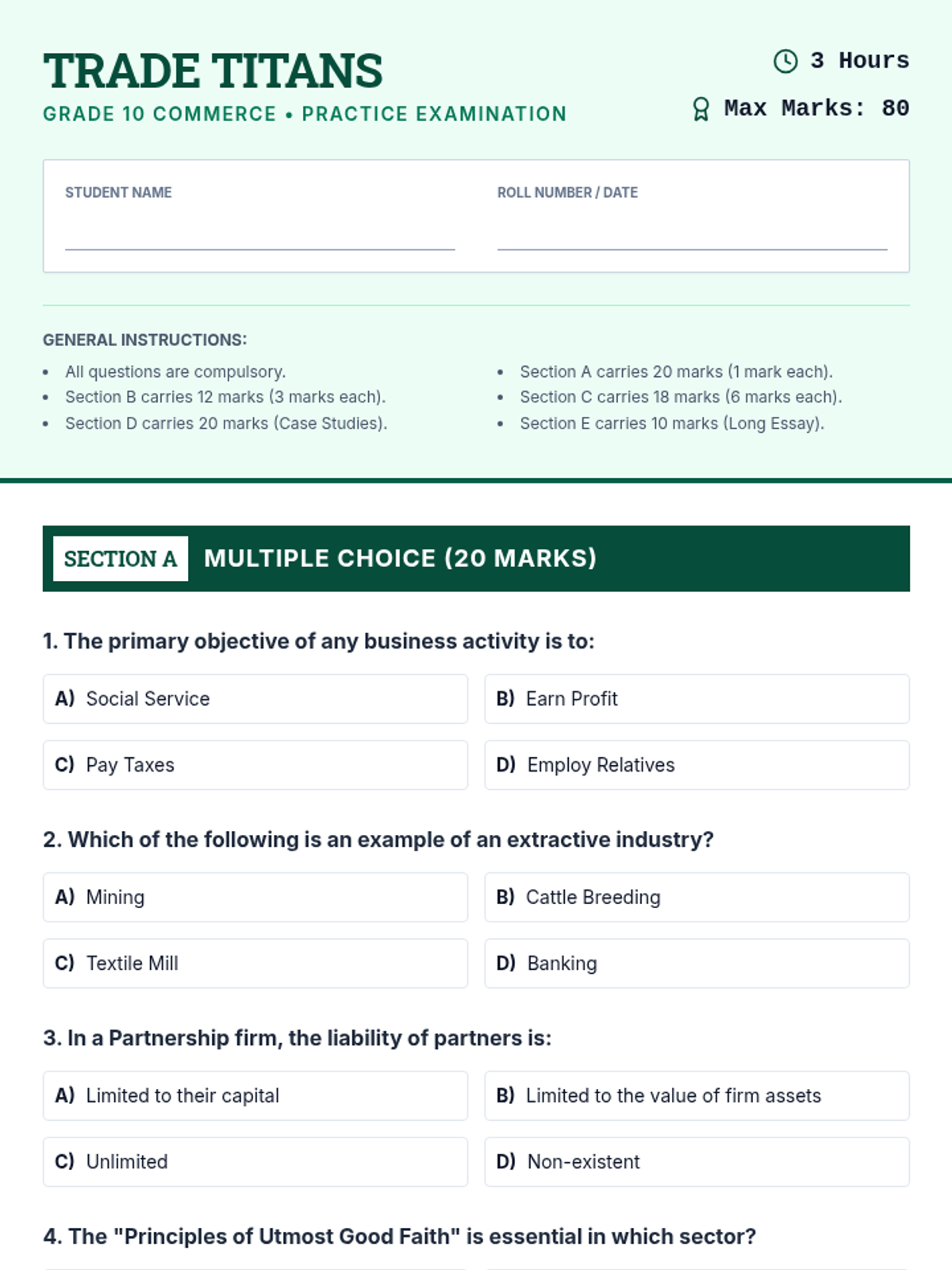 A comprehensive practice module for 10th-grade Commerce students, focusing on business foundations, trade services, and social responsibility.