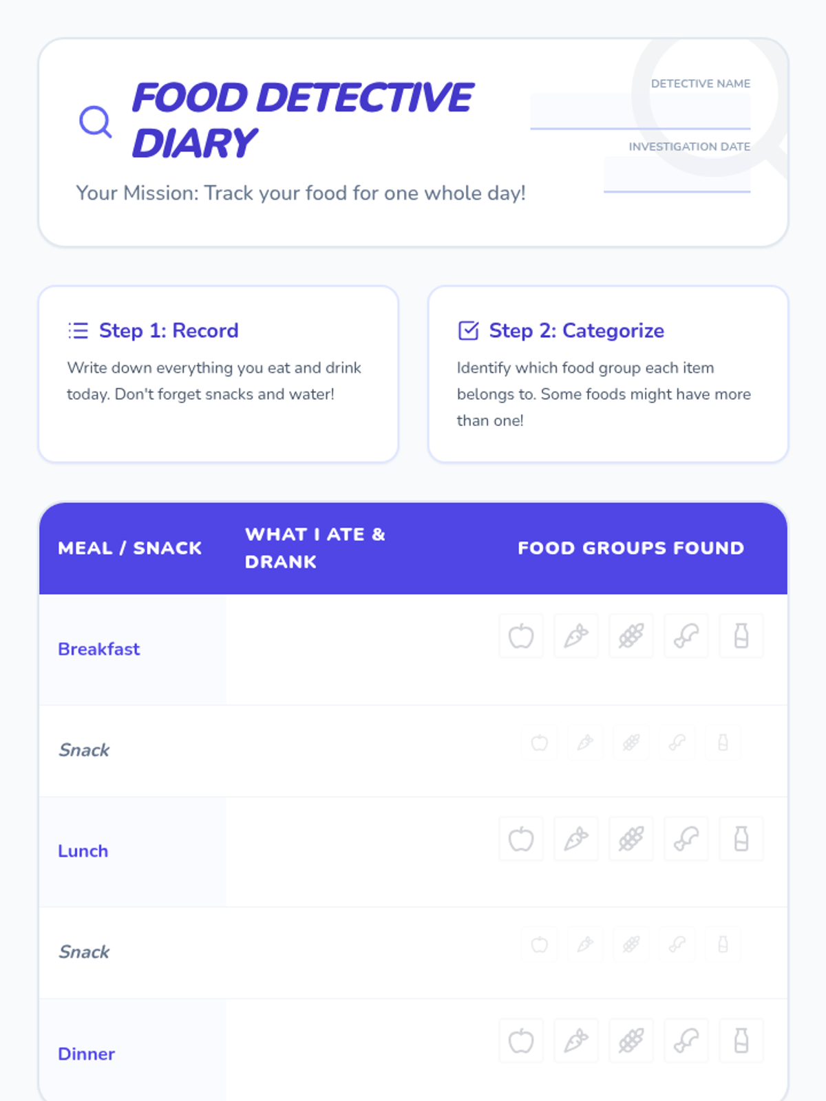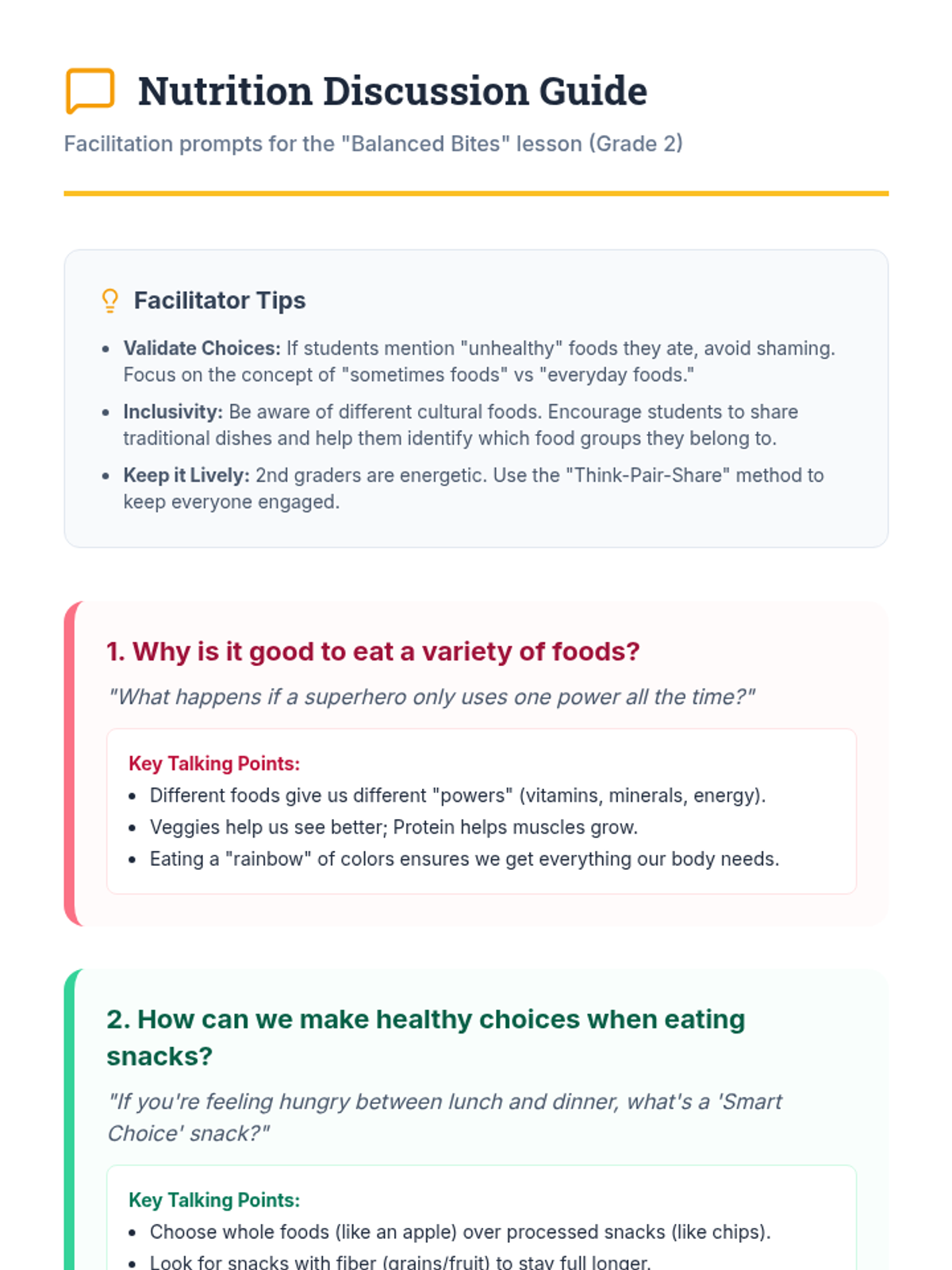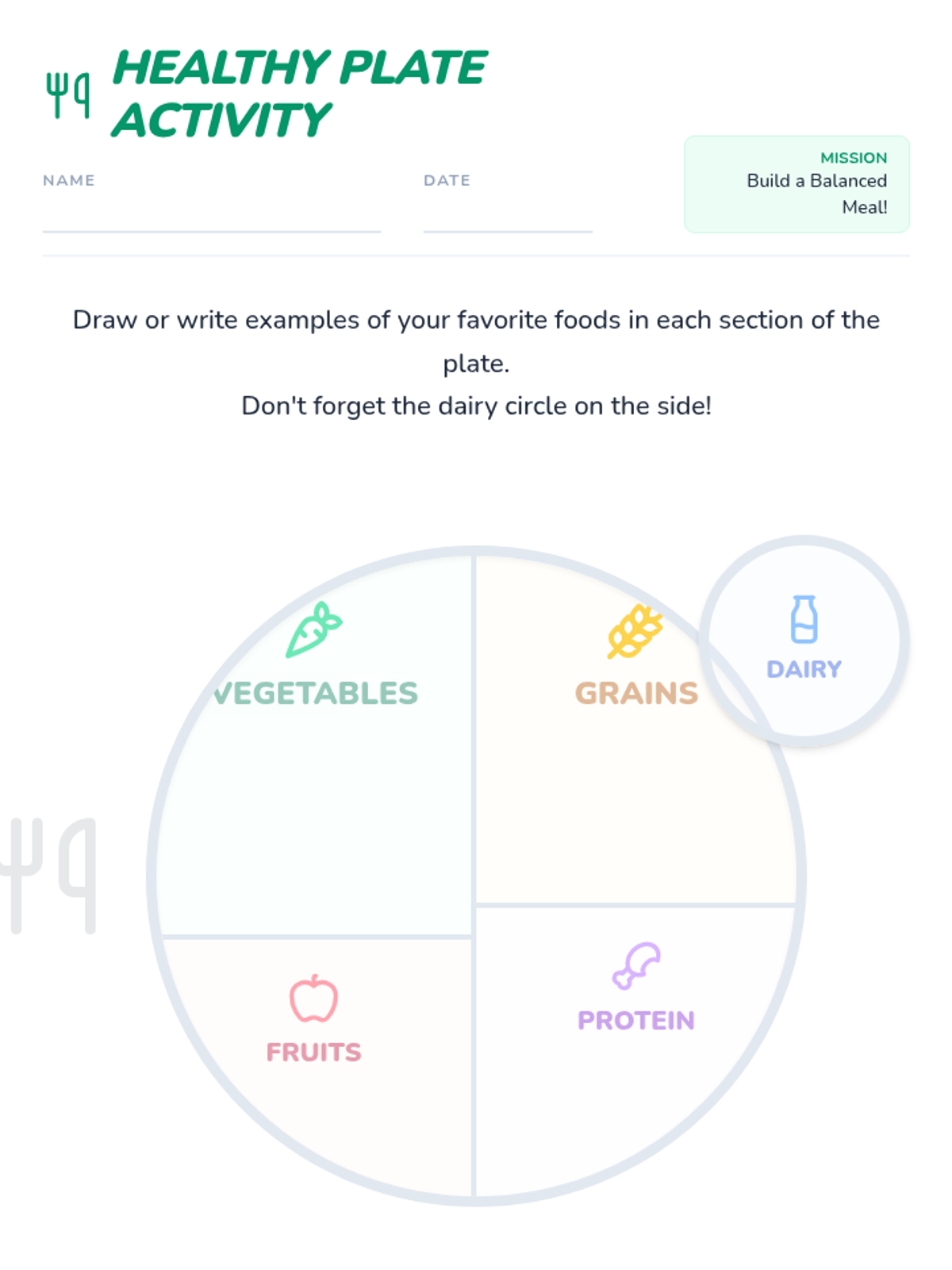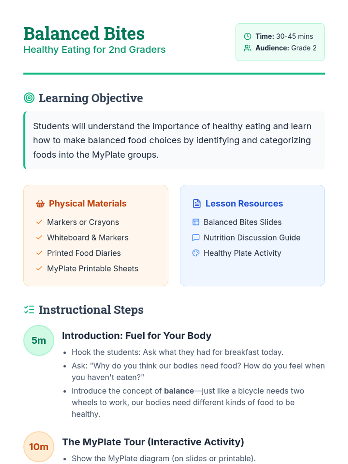 A comprehensive health lesson for 2nd graders focusing on the MyPlate food groups and making balanced nutritional choices through interactive activities and a take-home food diary.