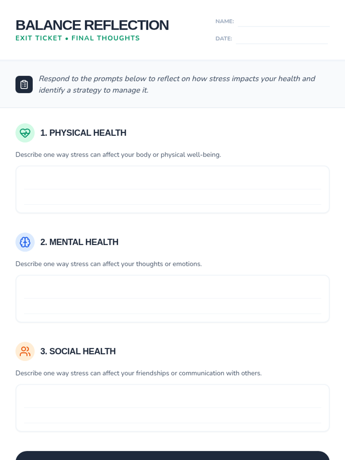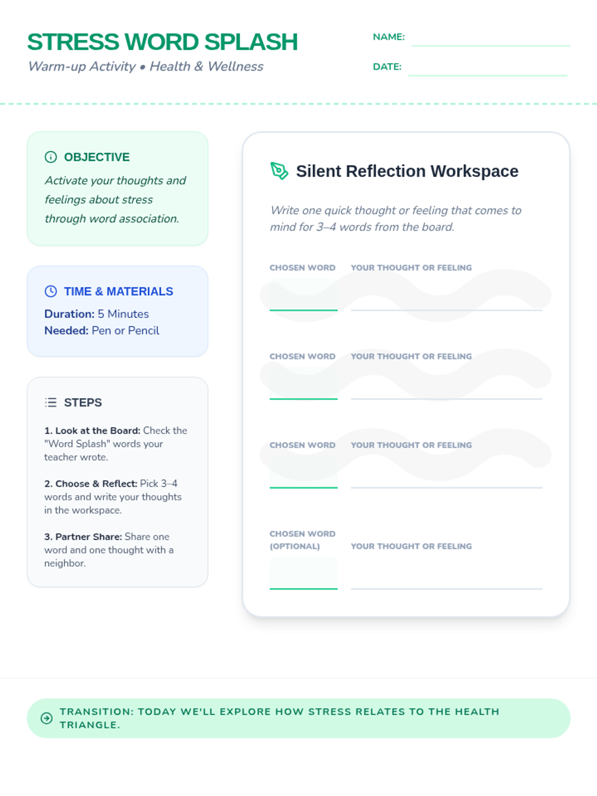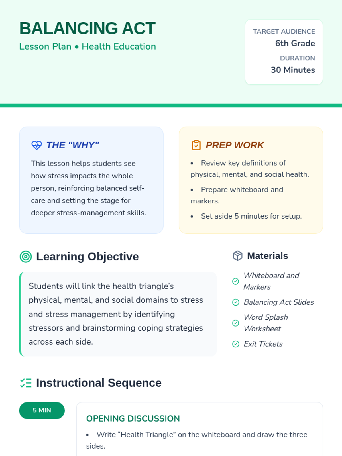 In this 30-minute segue lesson, 6th graders will connect the health triangle concept to stress and stress management, understanding how stress impacts physical, mental, and social health. This foundational lesson sets the stage for deeper exploration of stress and equips students with awareness they can apply in real life.