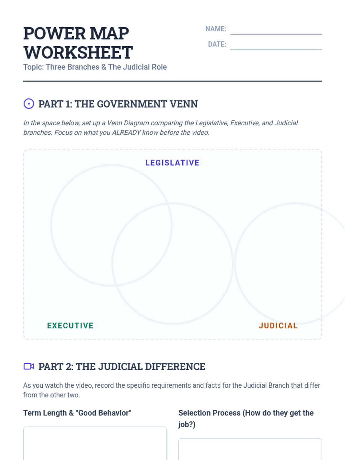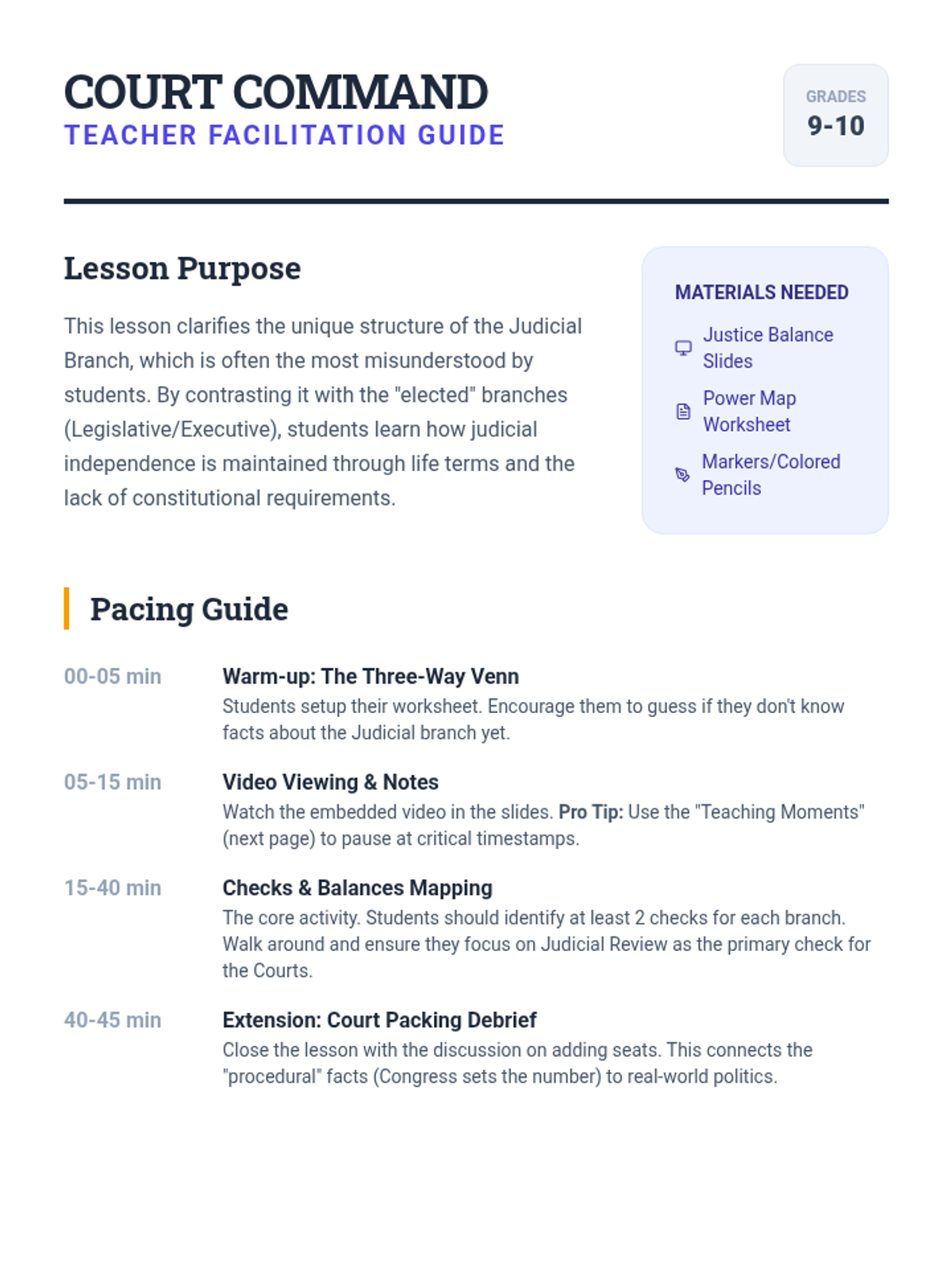 A comprehensive lesson comparing the three branches of government with a deep dive into the Judicial Branch, featuring checks and balances mapping and a discussion on court packing.