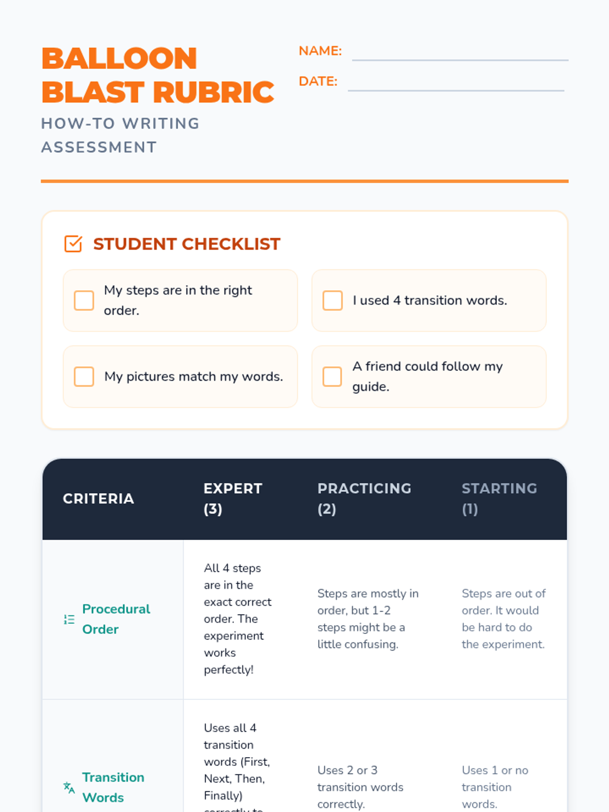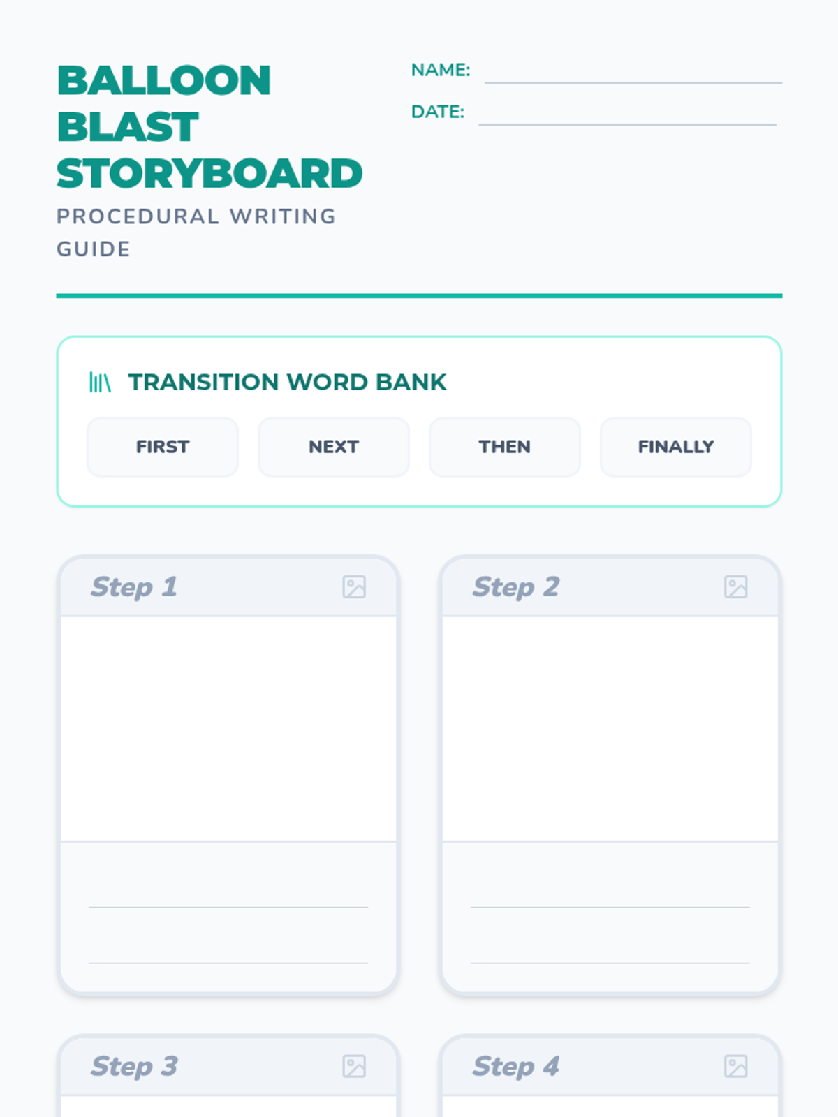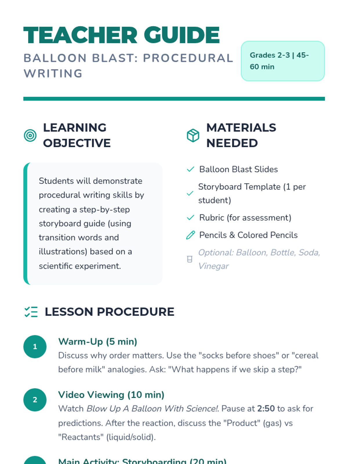 A 2nd-3rd grade procedural writing lesson where students watch a science experiment and create a step-by-step storyboard guide using transition words and clear illustrations.