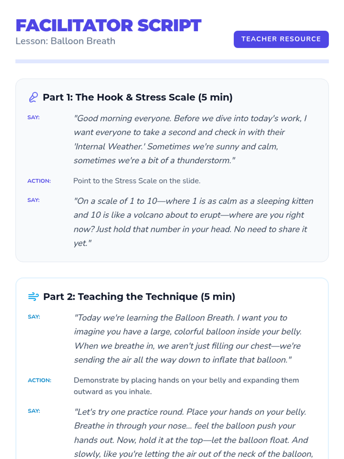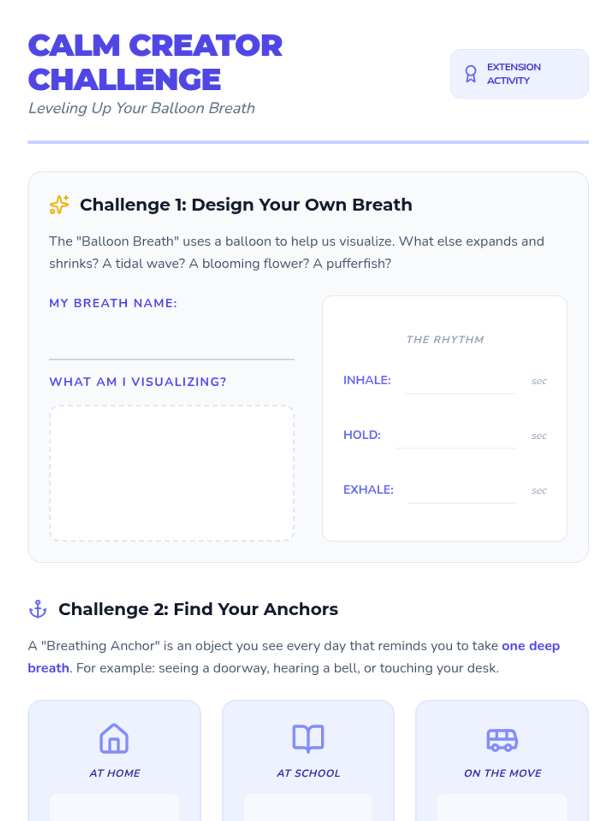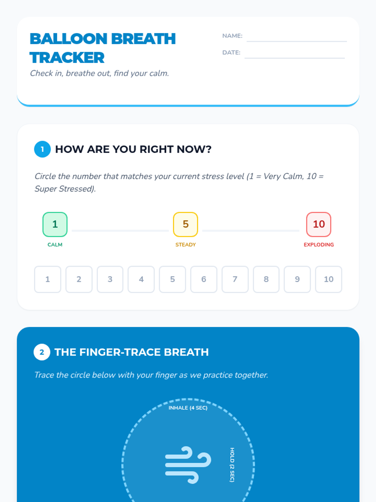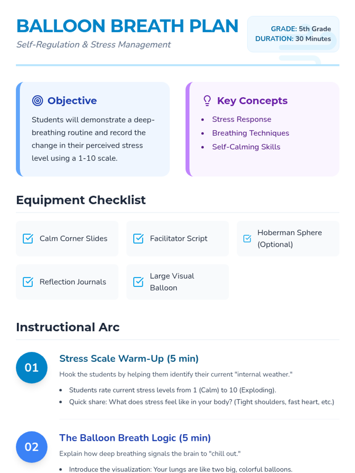 A 30-minute SEL lesson for 5th graders to learn and practice 'Balloon Breath' to manage stress and foster self-calming skills.