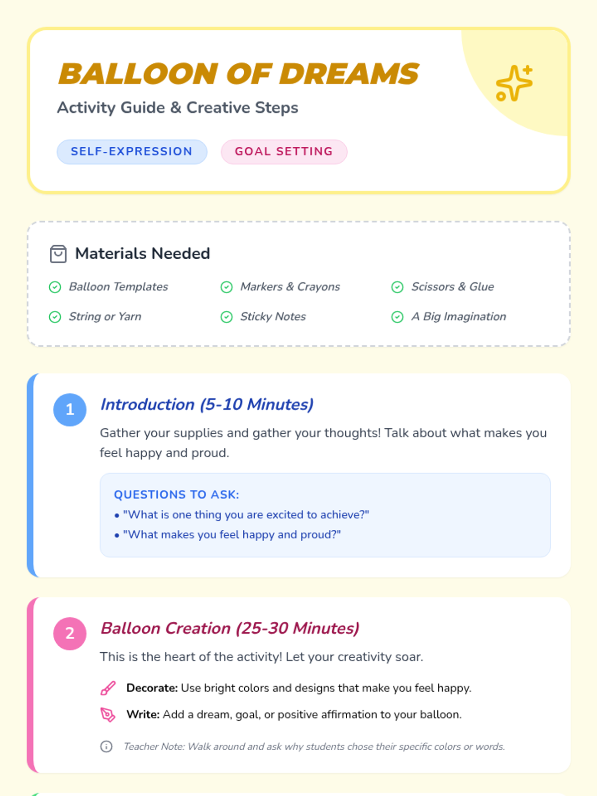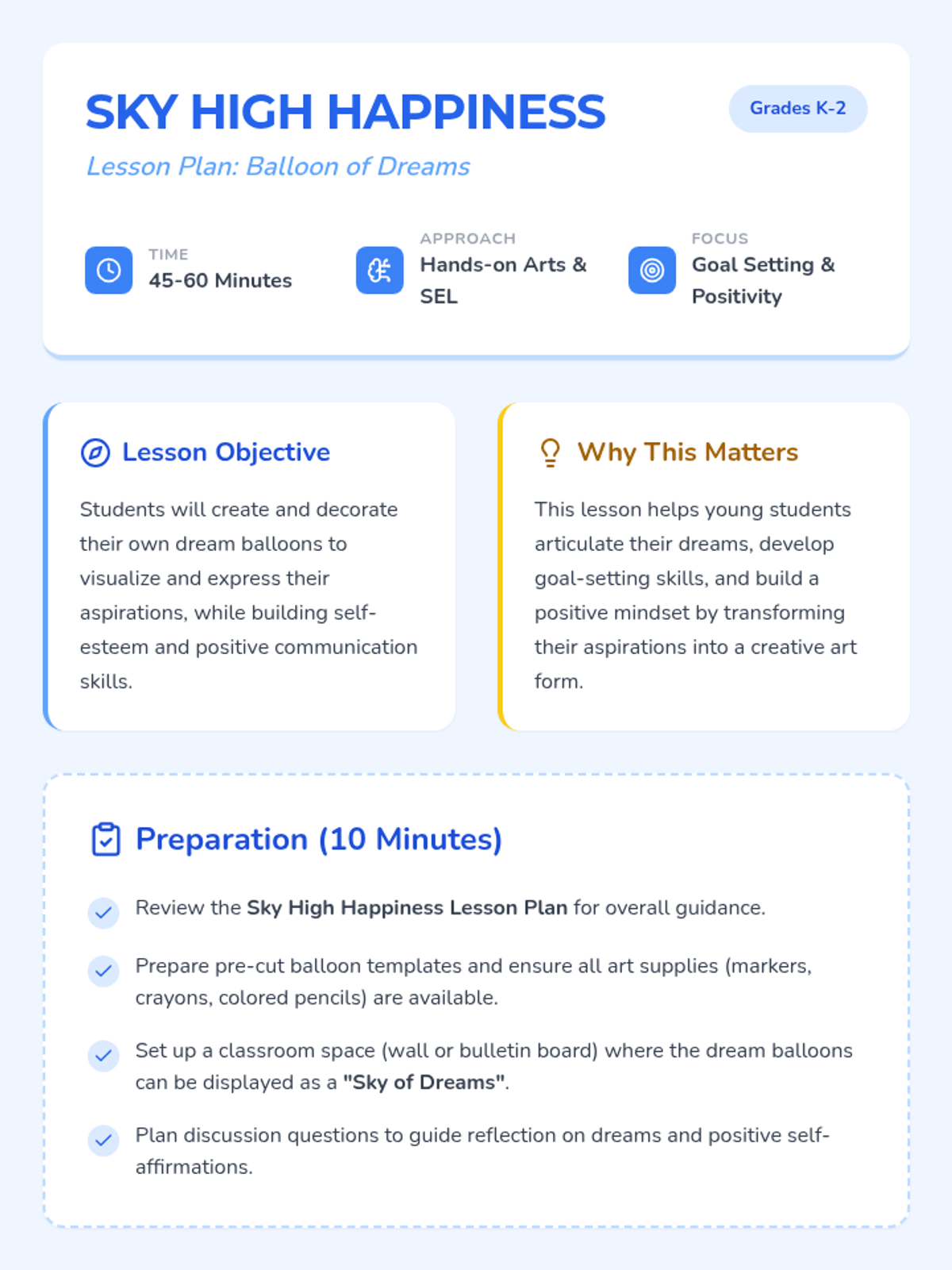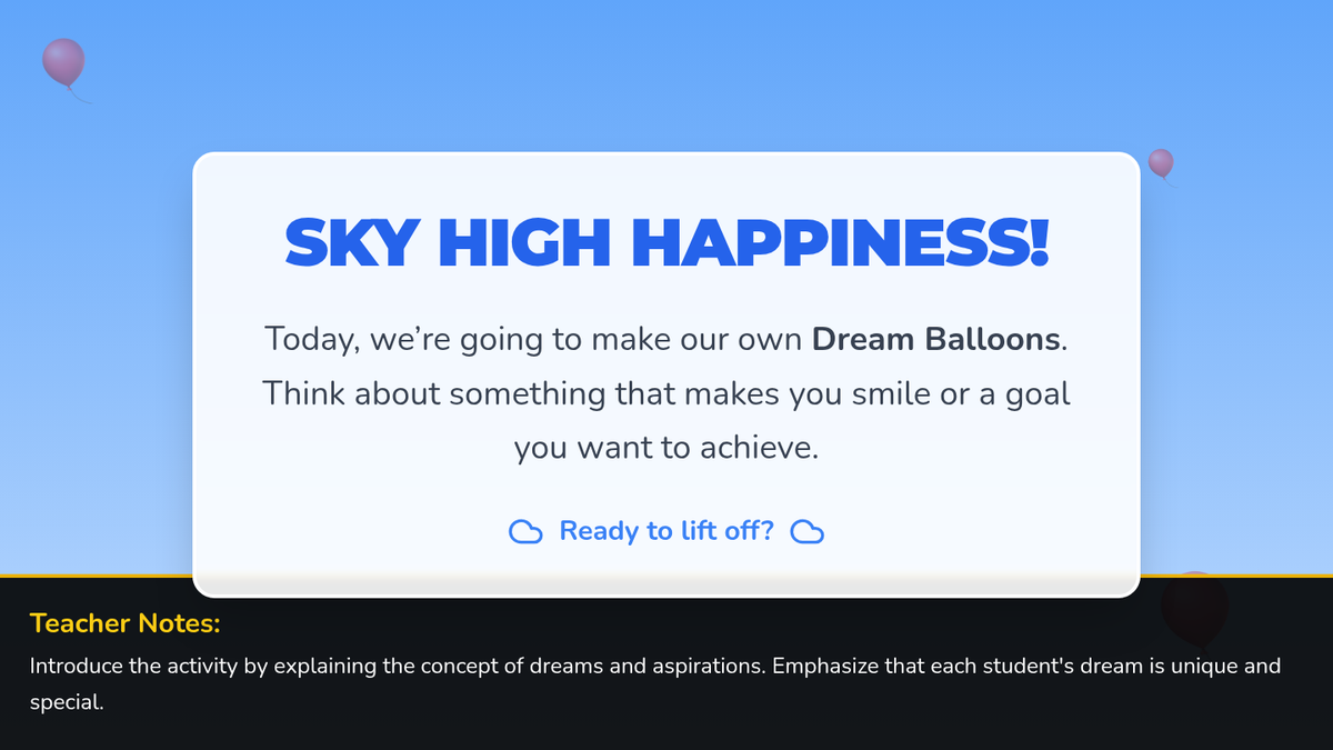 A whimsical, social-emotional learning lesson for K-2 students to visualize their goals and affirmations through creative balloon art. Students decorate balloon templates with their dreams to create a collaborative 'Sky of Dreams' classroom display.