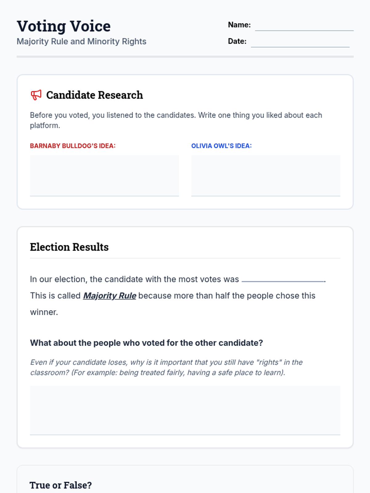 Students learn about the democratic process of voting and elections through a mock mascot campaign. The lesson covers majority rule, minority rights, and the importance of informed decision-making.