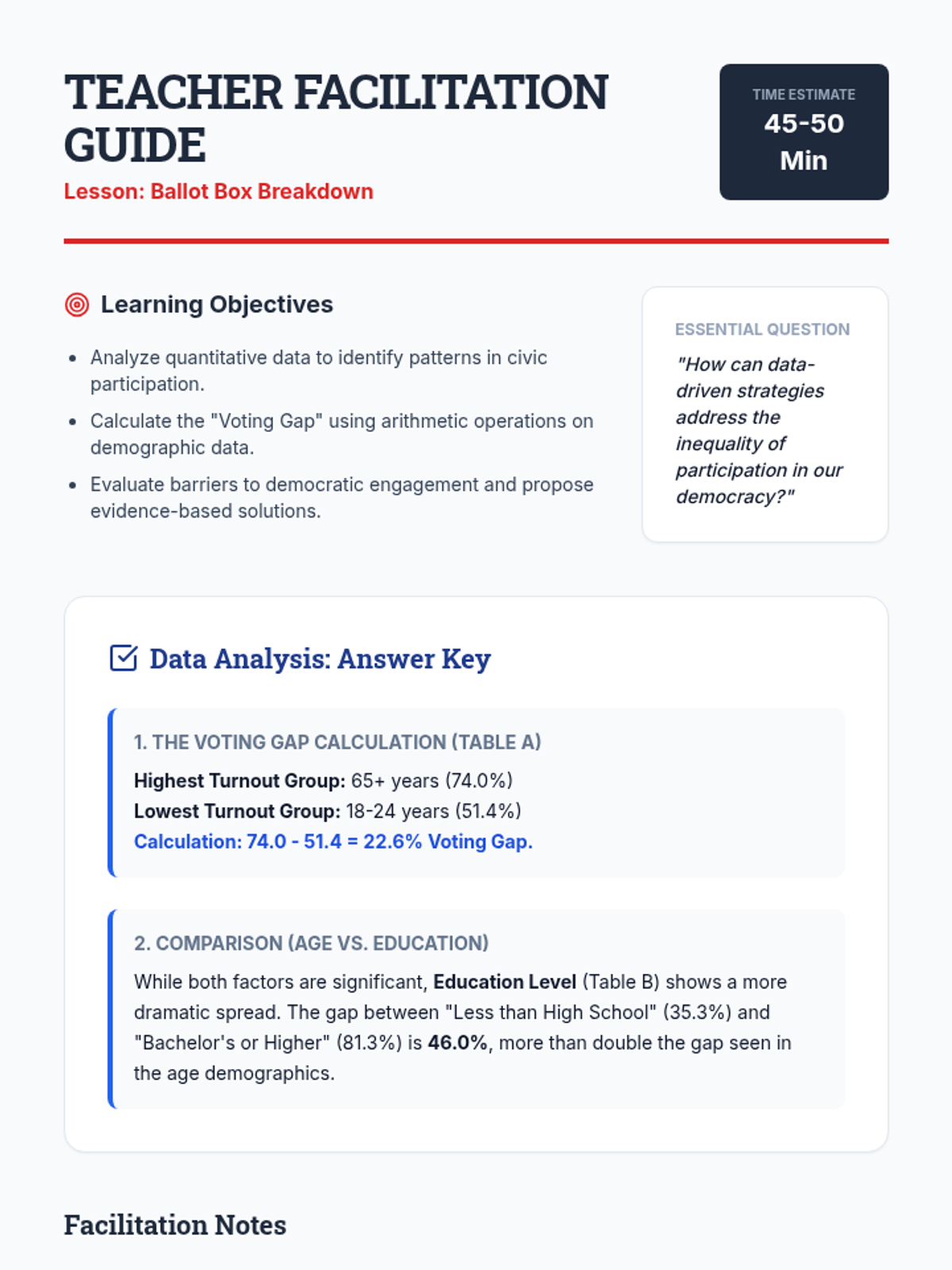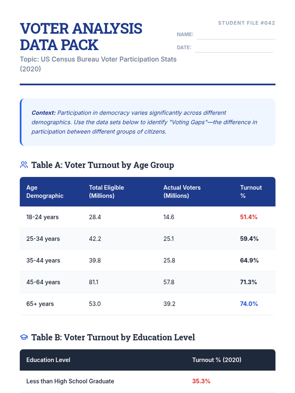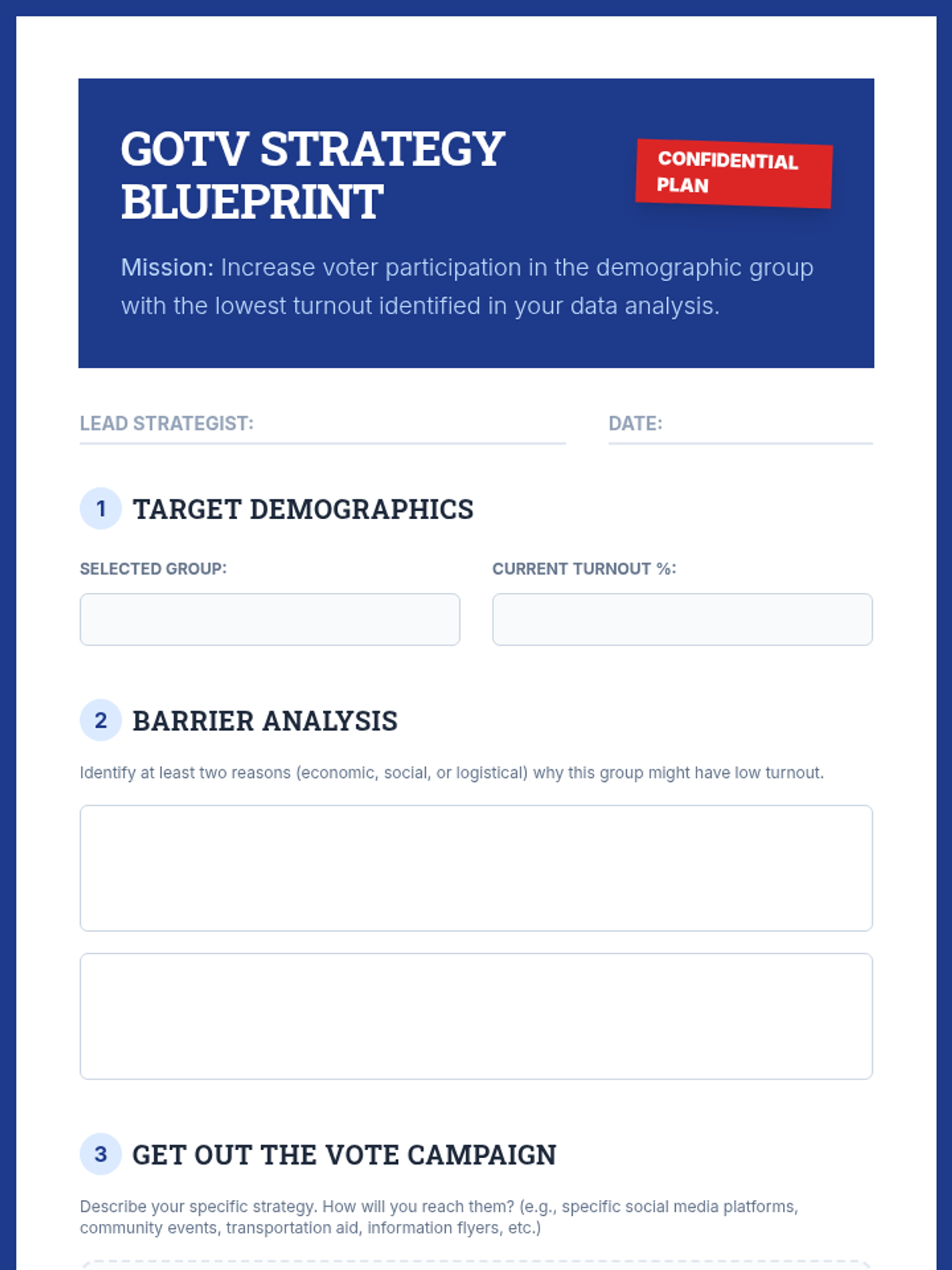 Students analyze real-world voter turnout data, calculate demographic participation gaps, and design targeted 'Get Out The Vote' strategies to address low participation in specific communities.