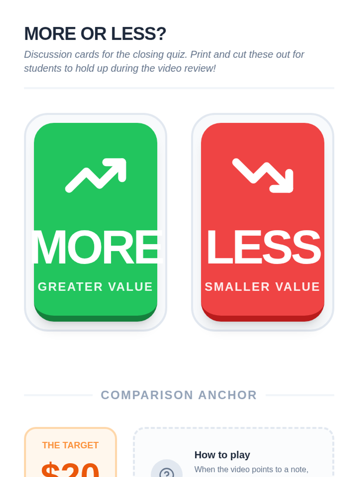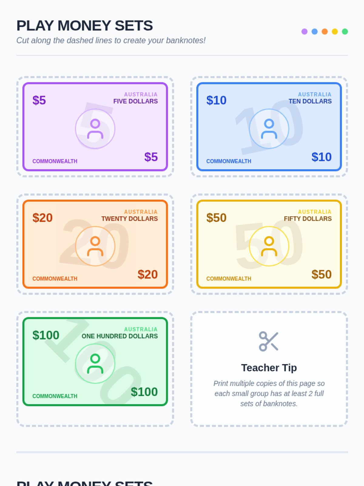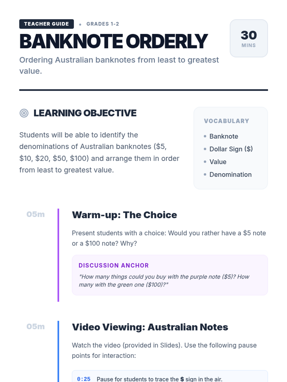 Students will learn to identify and order Australian banknotes from least to greatest value through interactive video discussion, hands-on sorting with play money, and a 'more or less' comparative quiz.