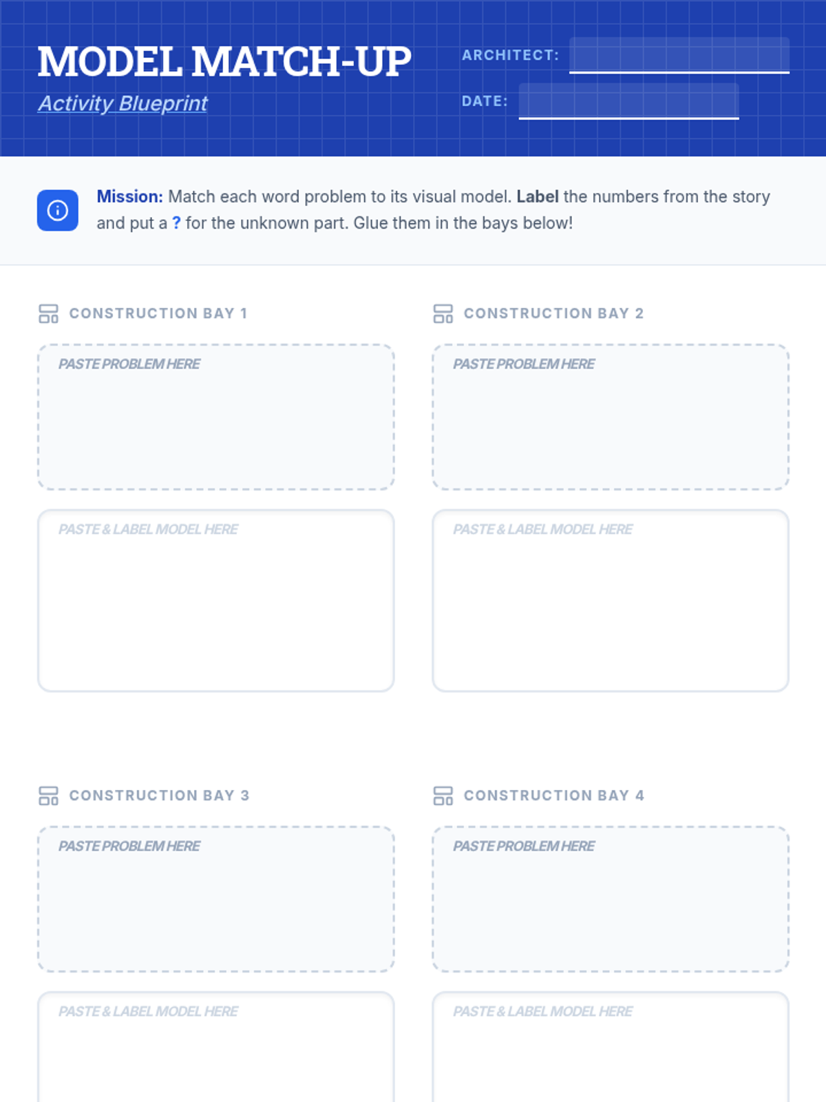 A foundational lesson on 3-digit addition focusing on composing (regrouping) across exactly one place value (either the ones or the tens). Students use a blueprint-themed packet to practice their architectural precision in mathematics.