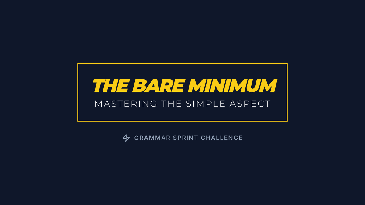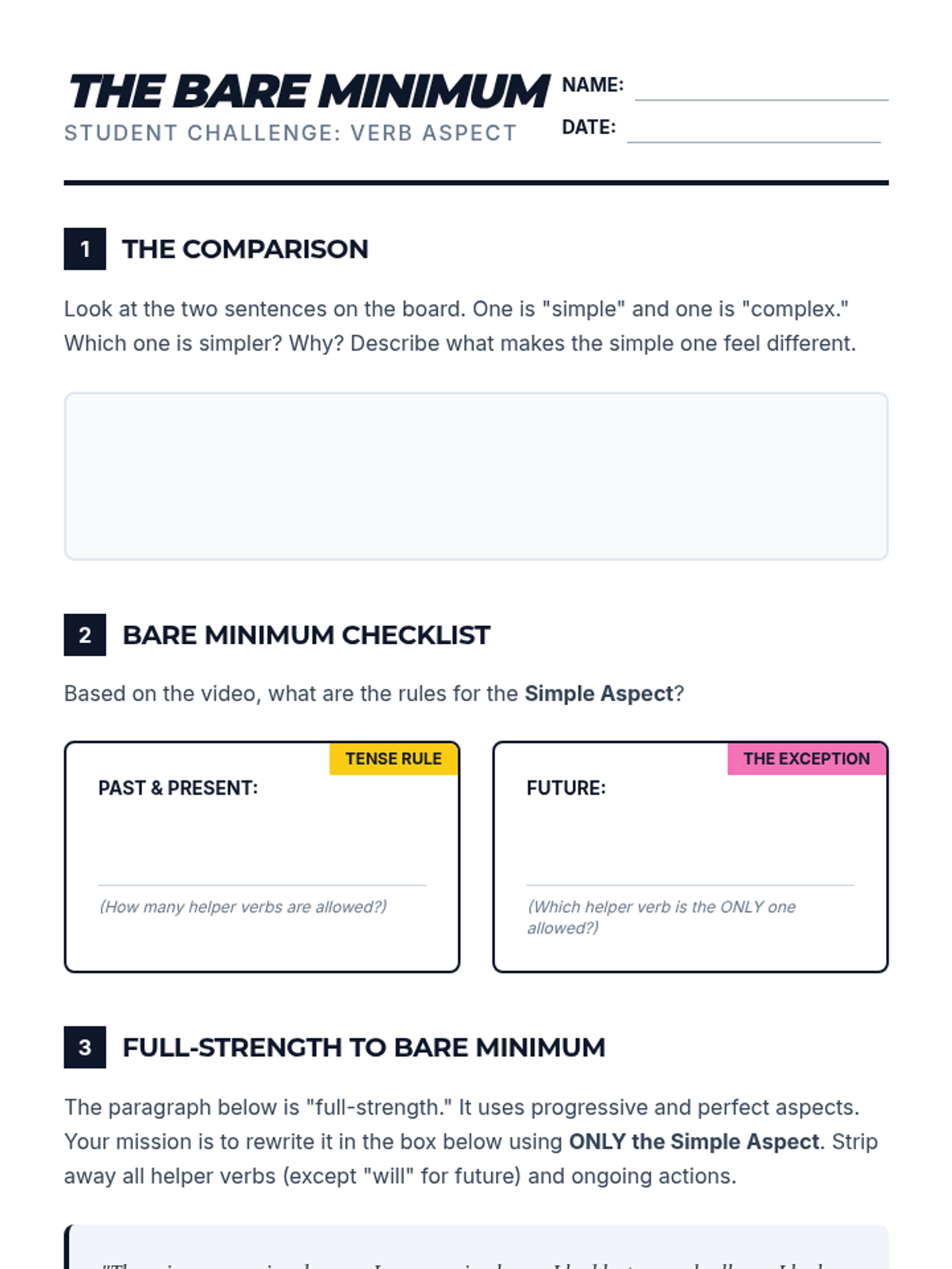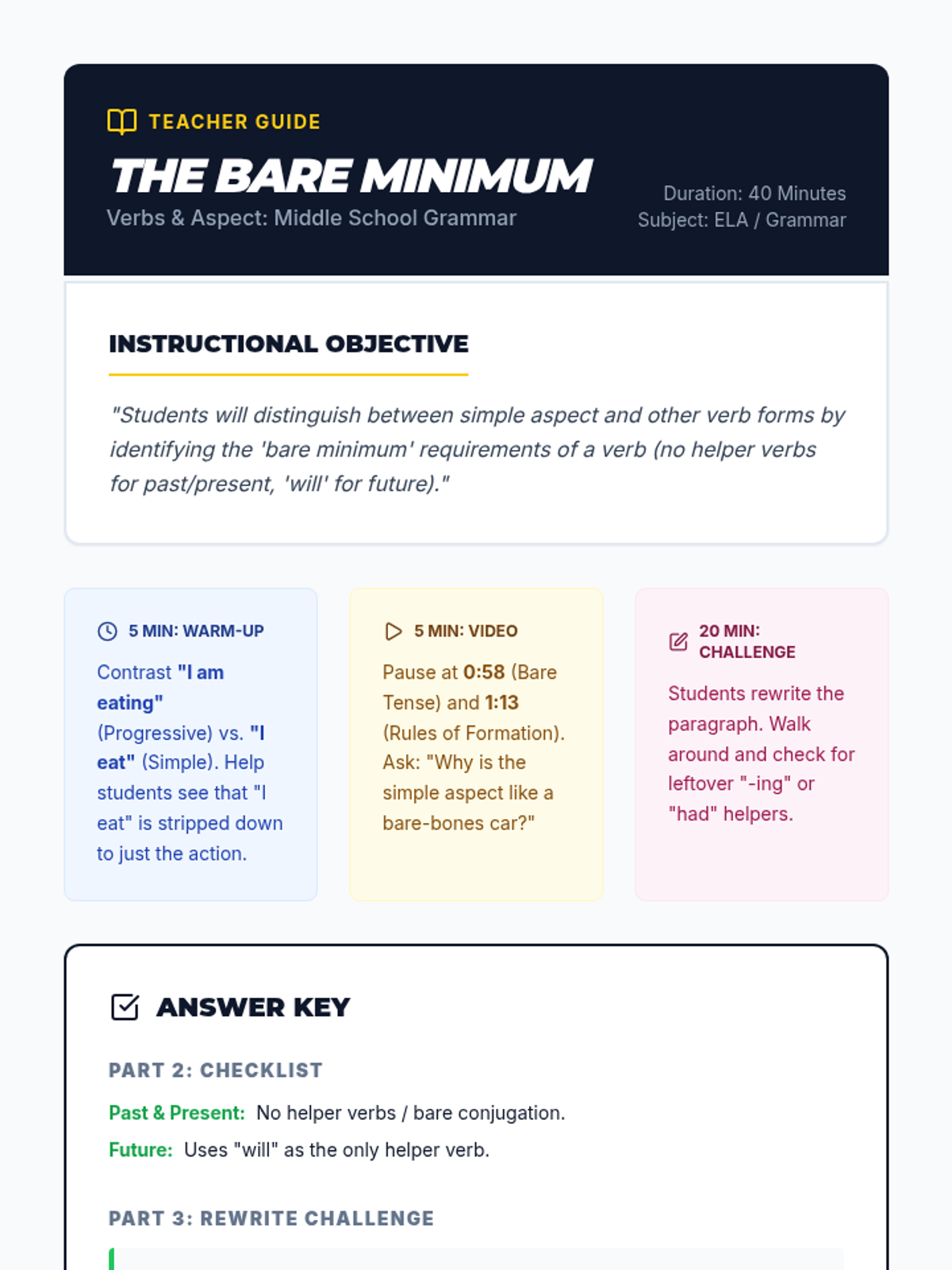 A middle school grammar lesson focusing on the Simple Aspect, helping students identify the 'bare minimum' requirements of verbs through a video-based challenge and writing activity.