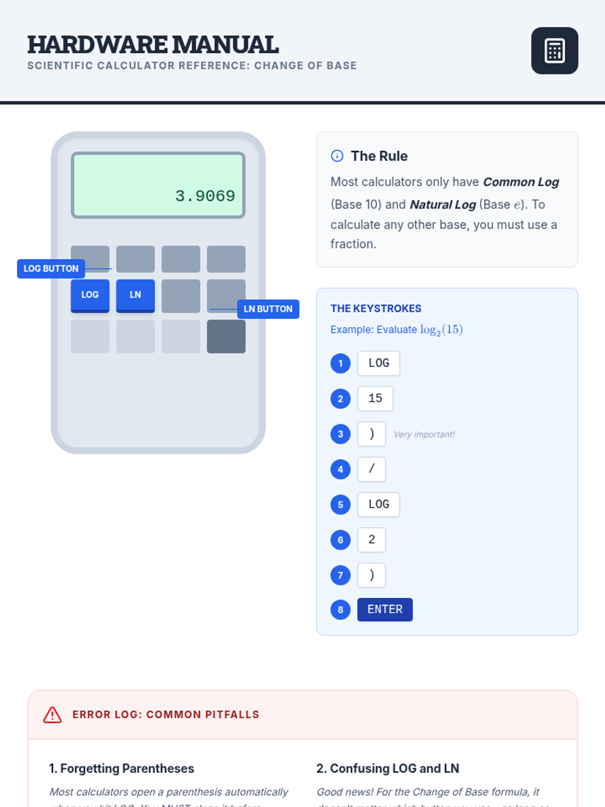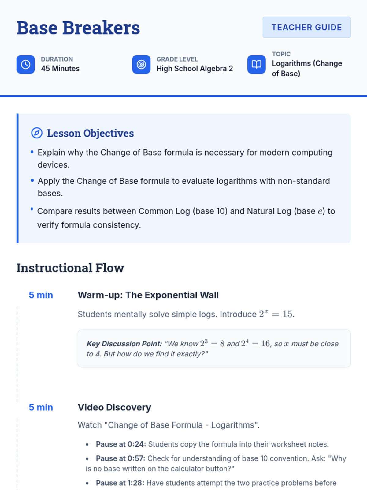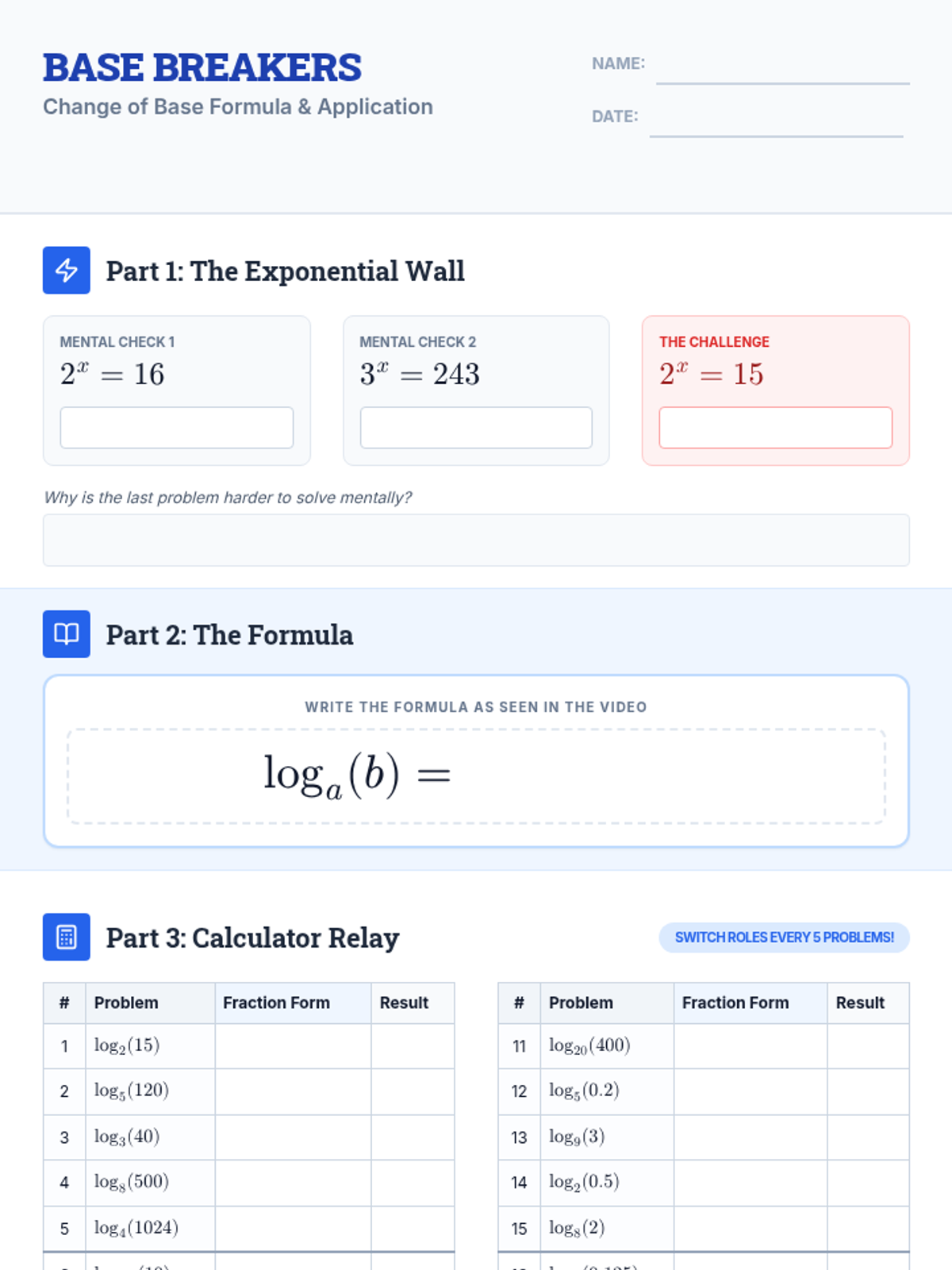 A high-energy lesson on logarithms where students discover the Change of Base formula to solve equations that can't be done mentally, featuring a 'Calculator Relay' activity.