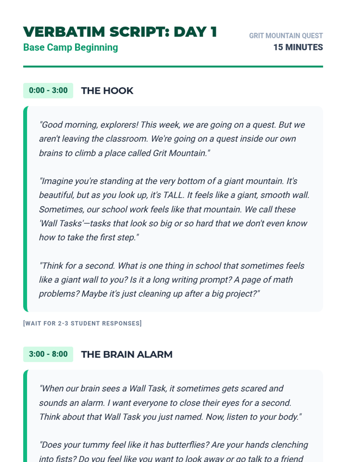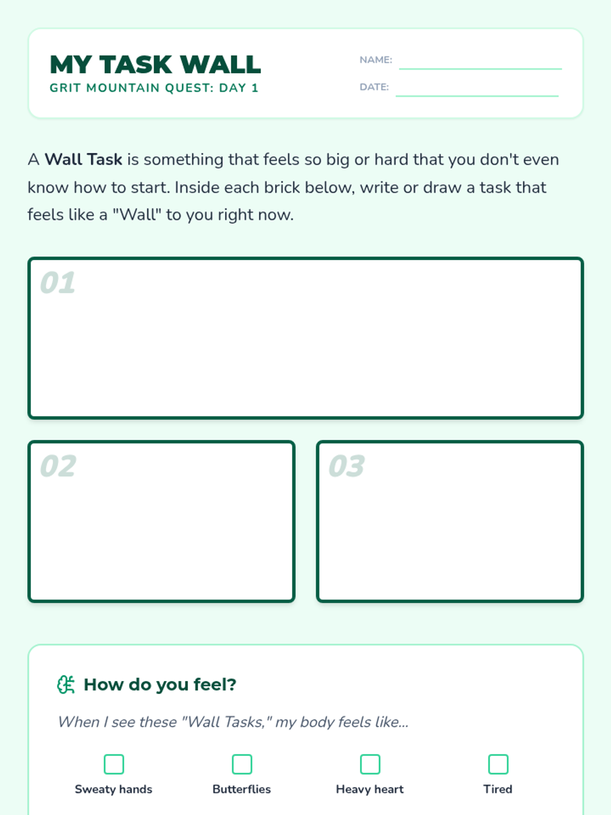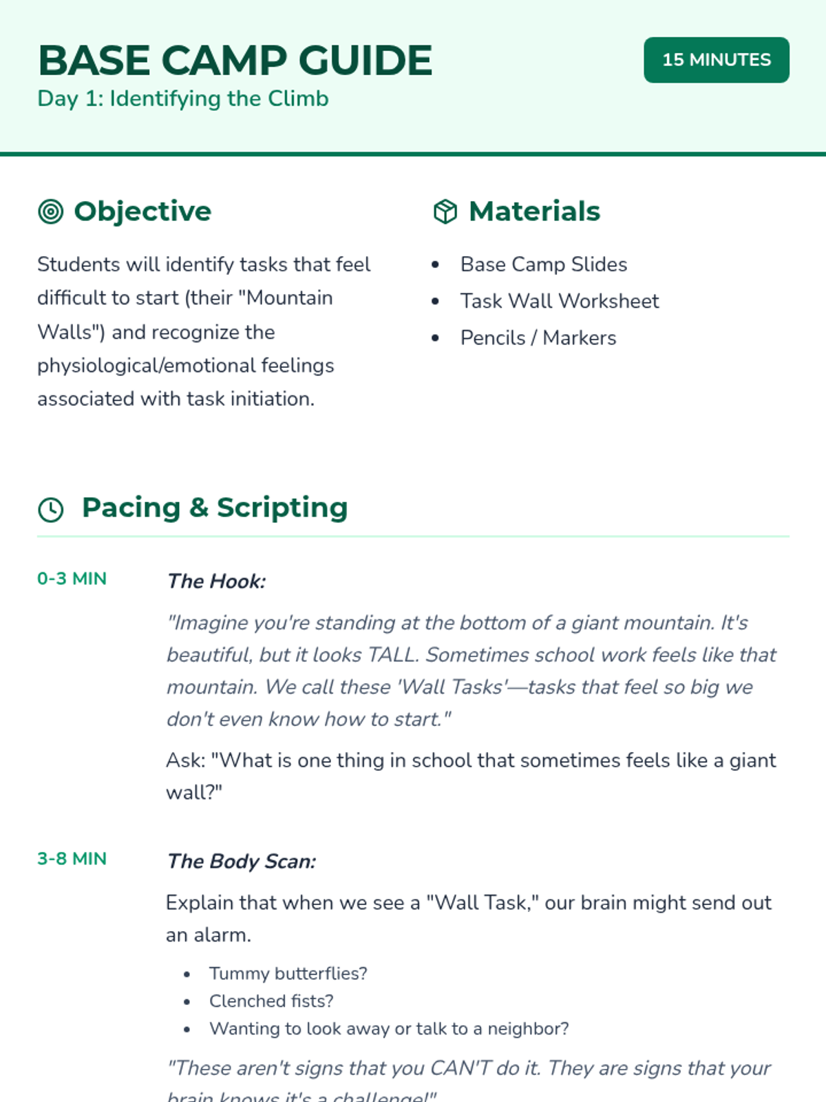 Students identify tasks that feel like 'mountain walls' and learn strategies for task initiation.