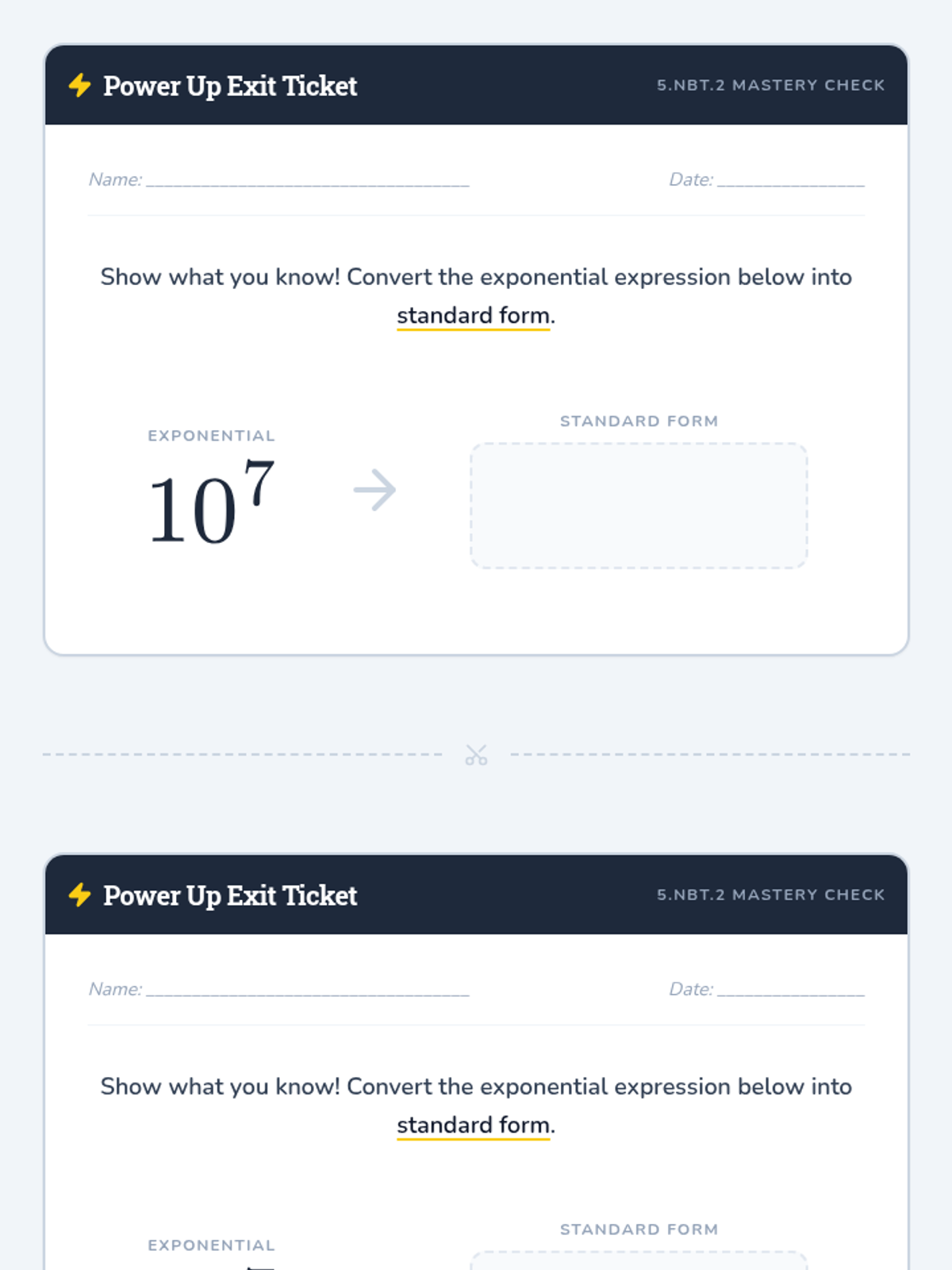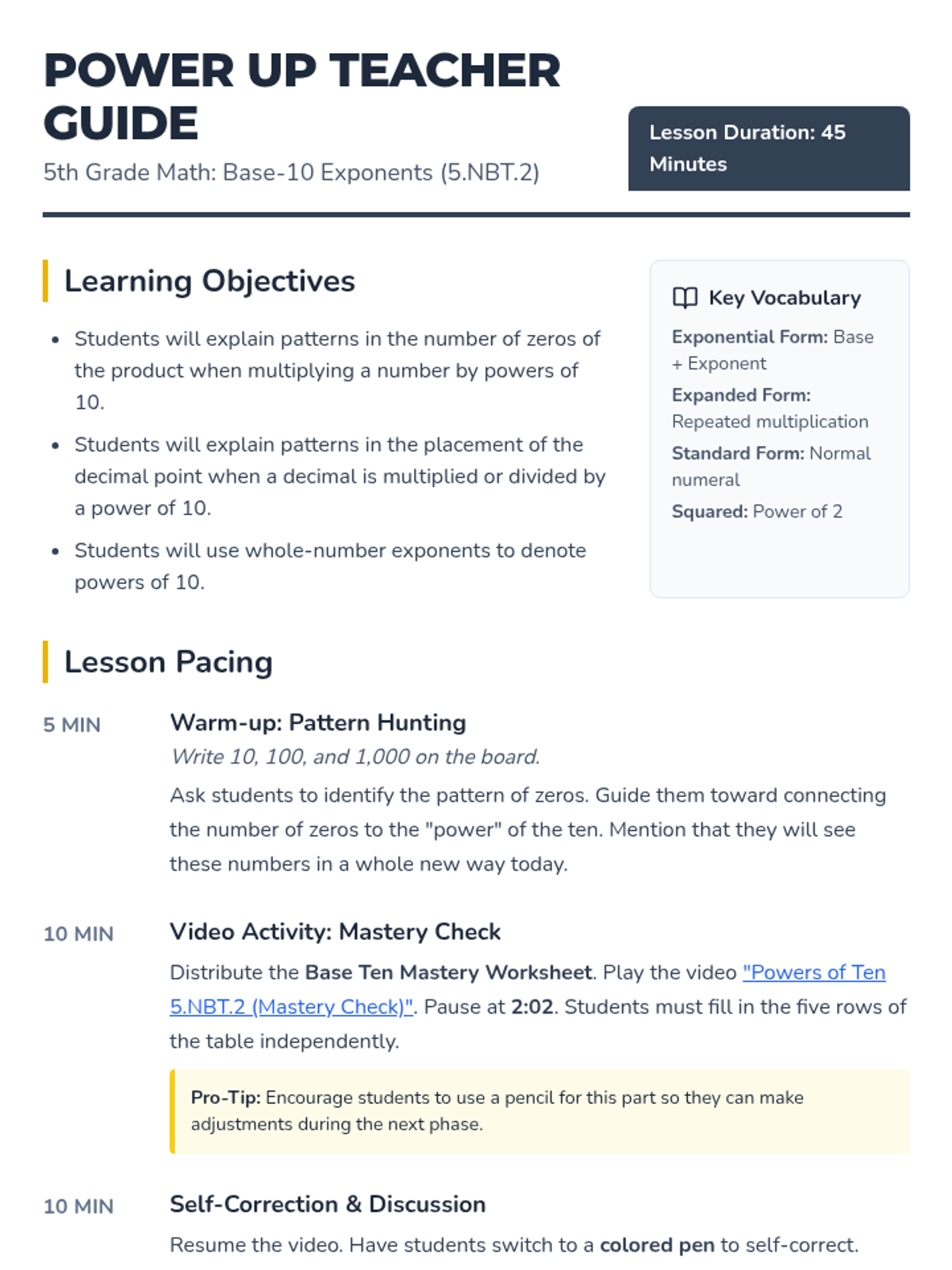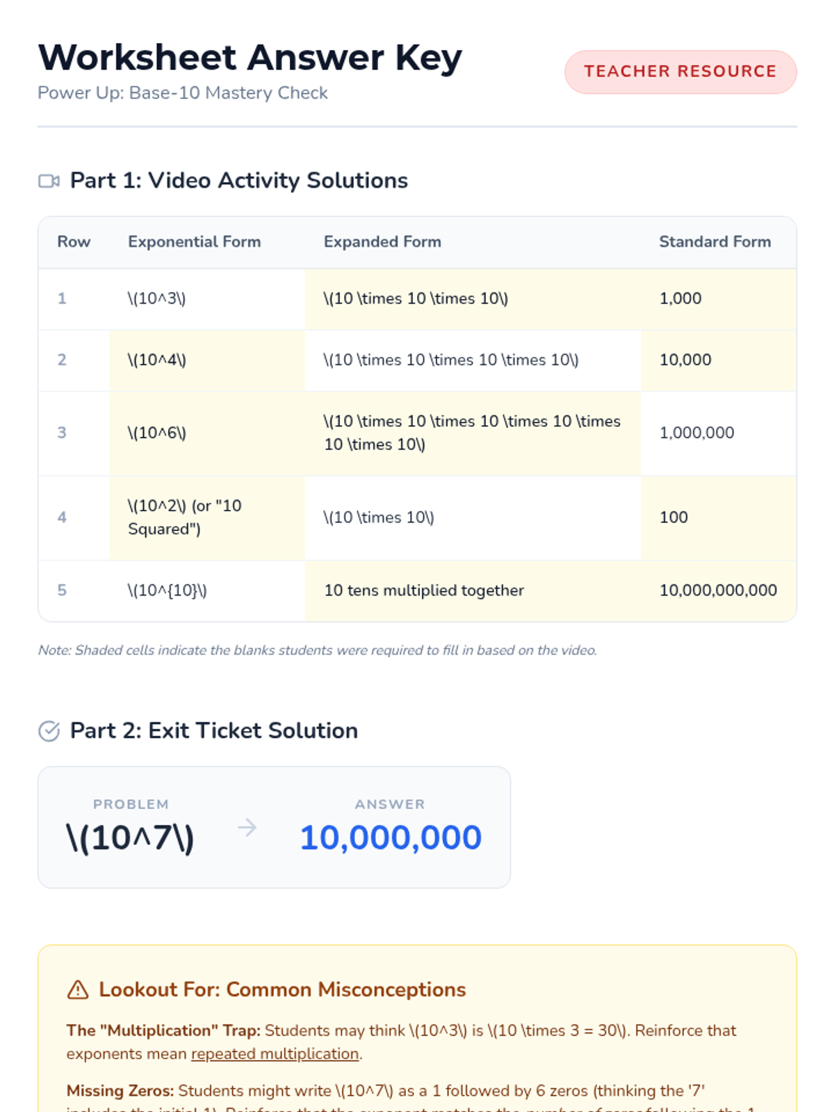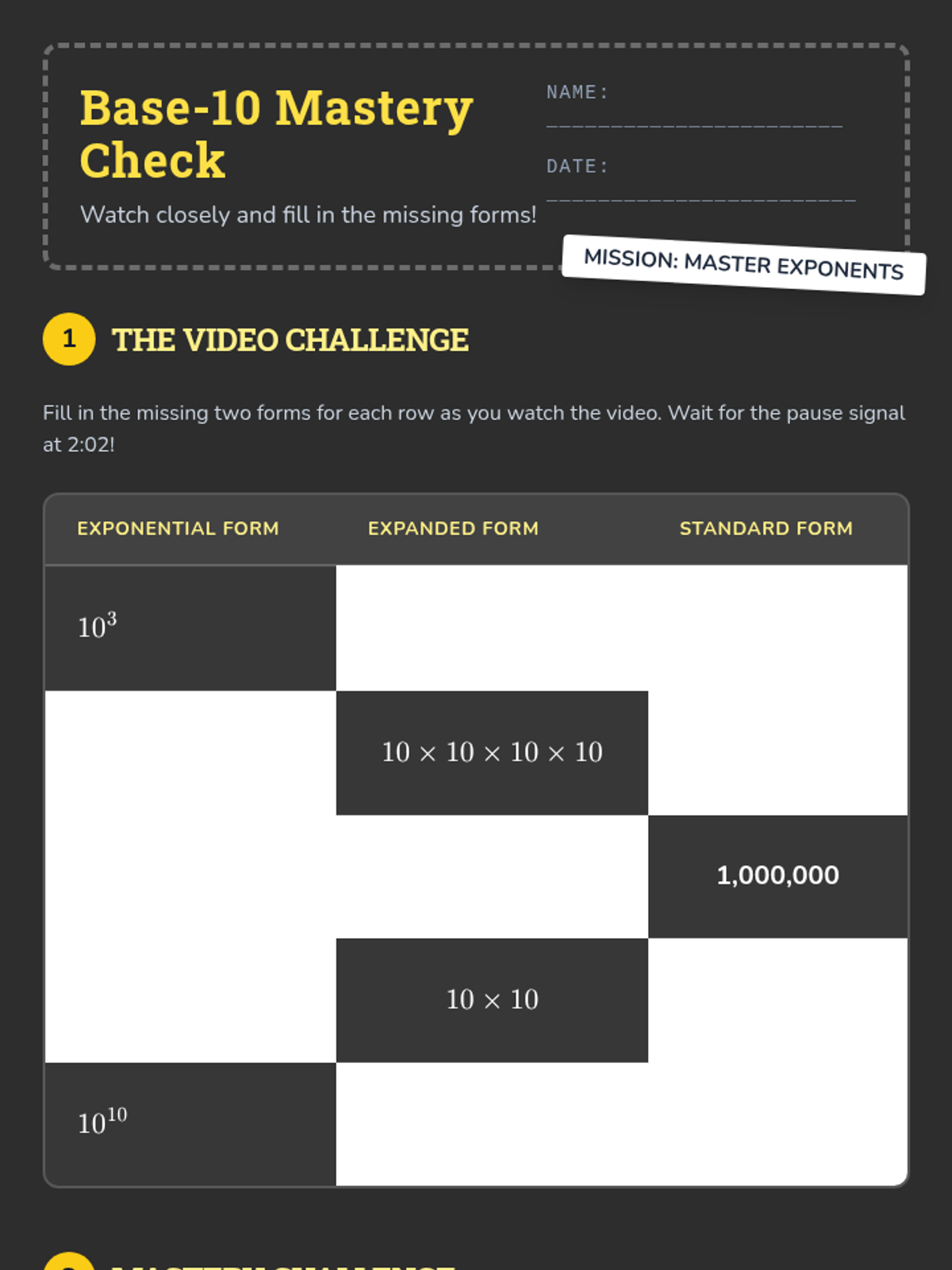 A formative assessment lesson on base-10 exponents where students use a guided video to practice converting between exponential, expanded, and standard forms before creating their own mastery challenges.