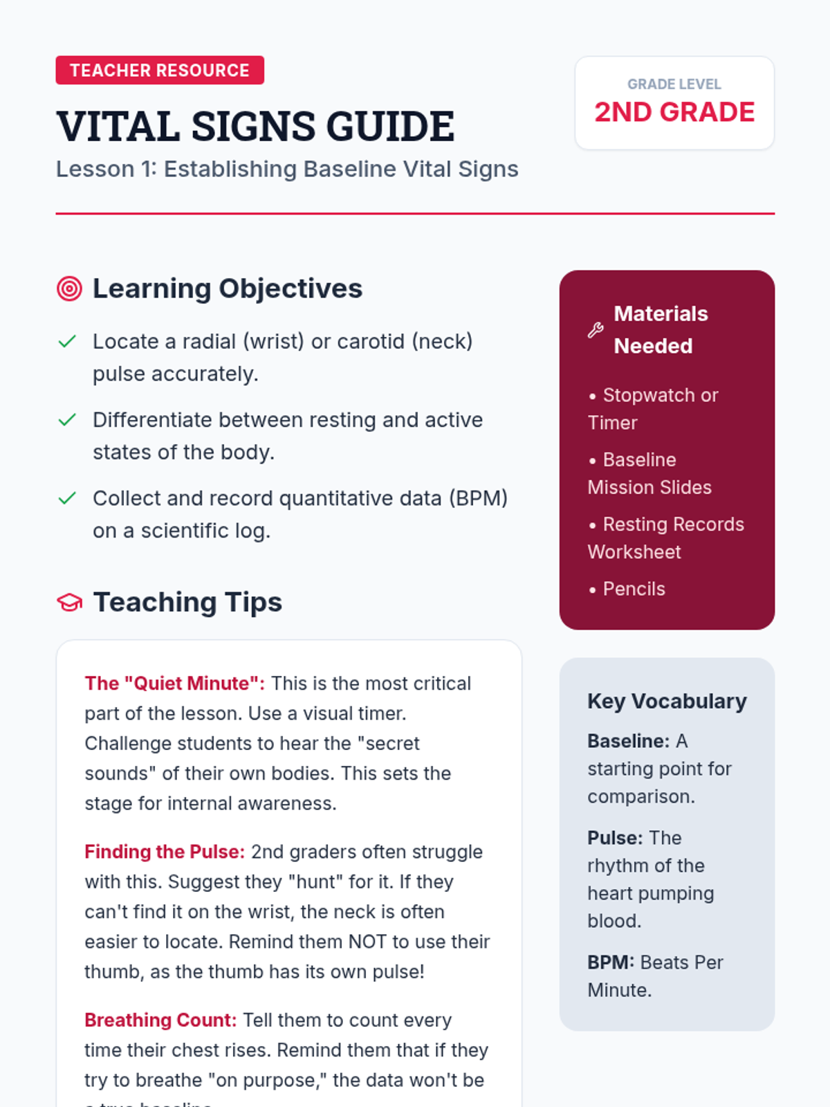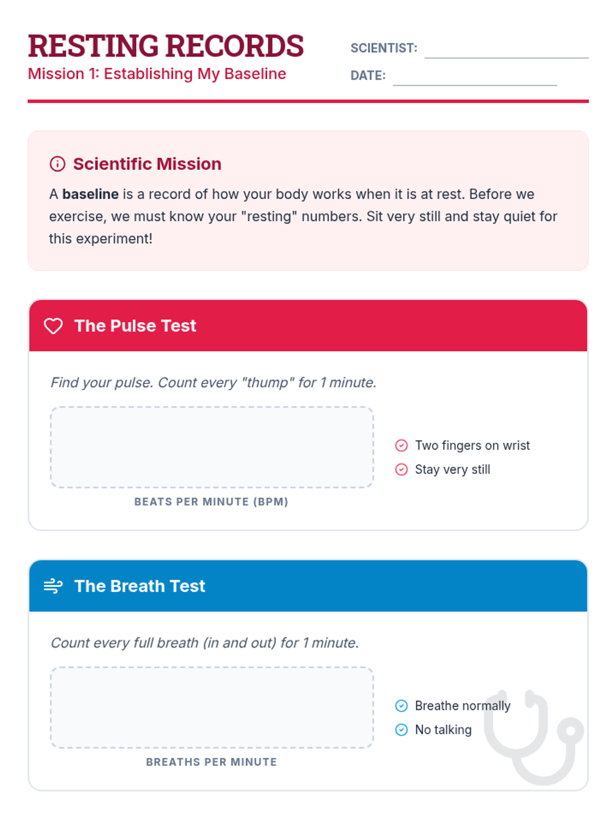 Students learn to locate their pulse and observe their breathing while sitting still to establish a resting baseline.